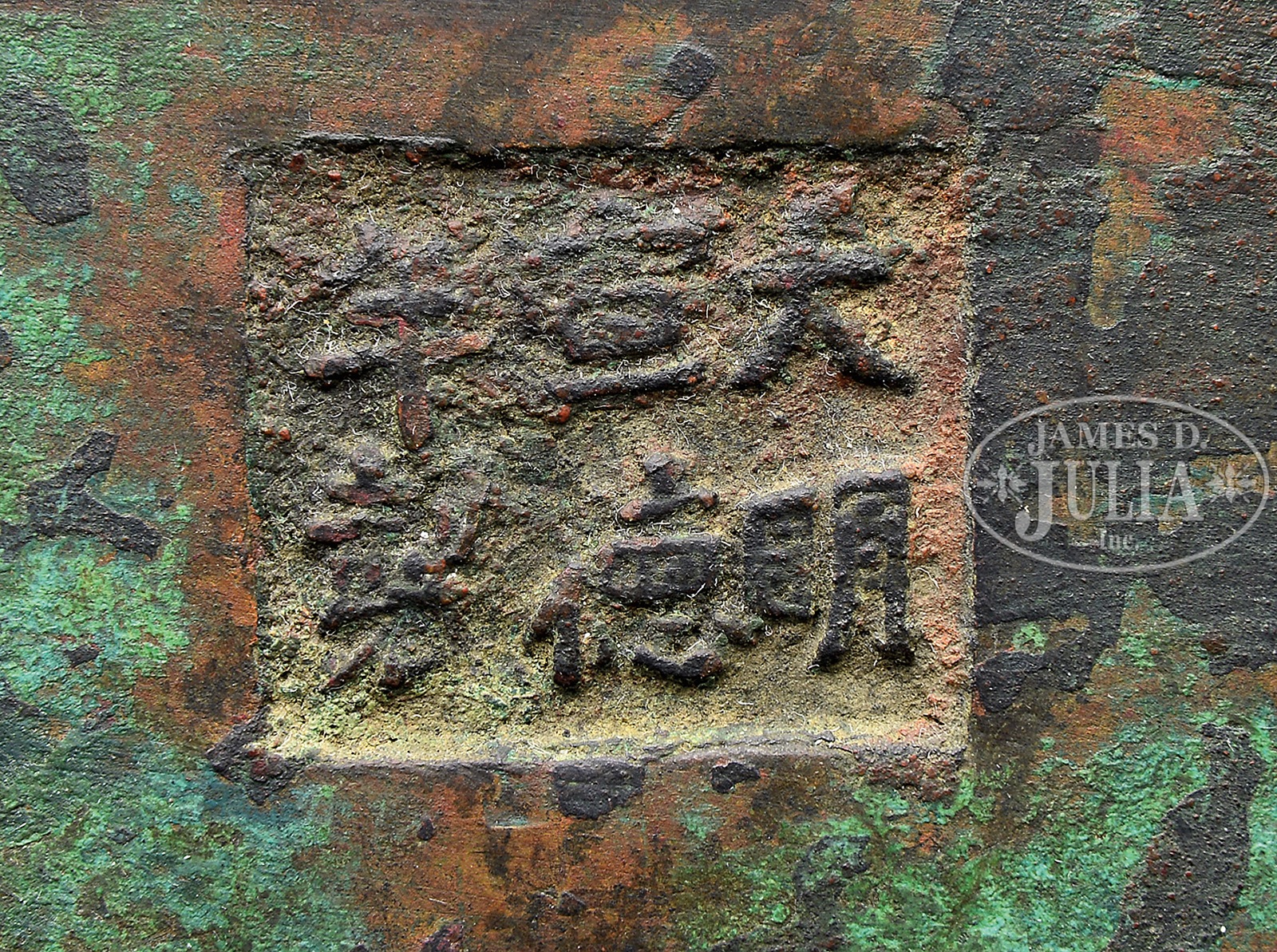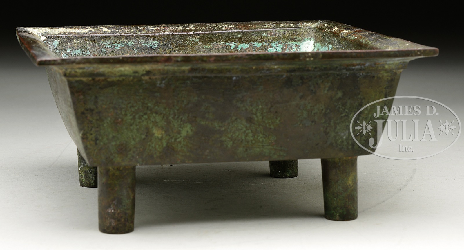SQUARE BRONZE CENSER.19th century, China. With feet and a Tao Tieh mask handle. Hsuan Te mark on the base. SIZE: 8-1/4″ l x 8-1/4″ w x 3-3/4″ h. CONDITION: Very good. 7-74662 (200-300) – Lot 4110