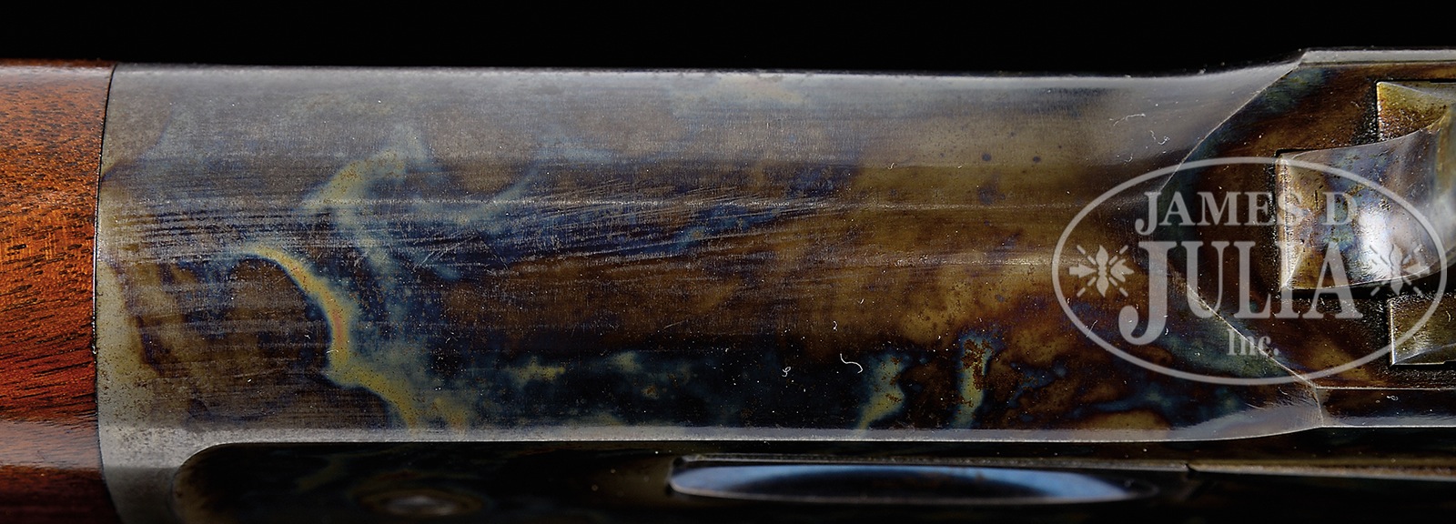 *STUNNING WINCHESTER 1886 STANDARD GRADE LEVER ACTION RIFLE.SN 119683. Cal. 45-70. 26″ oct bbl, full magazine, half-nickel front sight with set screw, 1000-yd ladder rear sight, standard receiver. Mounted with select grade straight grain walnut, uncheckered straight grip, crescent butt with trapdoor, standard rifle forend. Accompanied by Cody Firearms Museum fact sheet identifying gun as 45-70 rifle with oct bbl & plain trigger; received in warehouse Oct. 2, 1899, & shipped Oct. 7, 1899, on order no. 40352. CONDITION: Extremely fine. Bbl retains 98-99% orig blue with some faint sharp edge wear & some minor areas of tiny surface oxidation. Receiver retains nearly all of its dark orig case colors; still carrying lacquer in protected areas, faint thinning on sharp edges & slightly fading in front half of receiver; some minor faint surface oxidation. Hammer retains virtually all of its dark orig case colors. Lever has strong dark orig colors on sides, slightly fading & blending with brown patina on bottom. Stock is sound with a few minor nicks & bruises, carrying most of its orig varnish finish. Unusual butt plate with trapdoor retains strong orig case colors. Forend has some minor bruises, some nicks & scratches, slight wear across belly, retaining most of its orig varnish finish. Forend cap retains most of its brilliant orig case colors. Mechanics are crisp with bright shiny bore, as gun looks to have had very little use. 50412-77 (25,000-50,000) C&R – Lot 4110