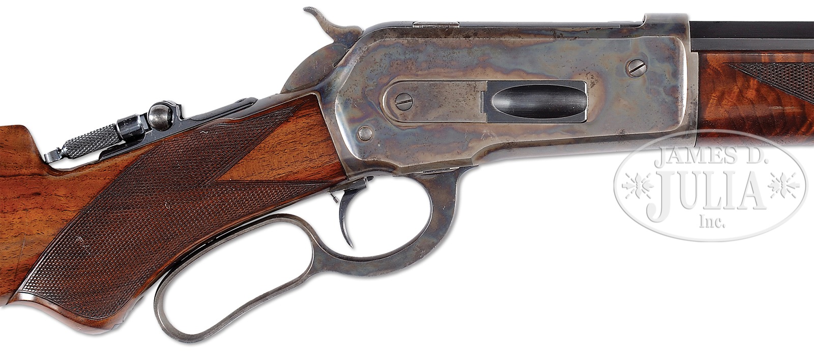 EXTREMELY FINE SPECIAL ORDER DELUXE WINCHESTER 1886 LEVER ACTION RIFLE.SN 30429. Cal. 38-56 WCF, 28″ oct bbl, half magazine, Lyman ivory bead front sight, 1886-marked 1000yd ladder rear sight. Top flat of bbl marked “MANUFACTURED BY THE / WINCHESTER REPEATING ARMS CO. NEW HAVEN. CONN. U.S.A.” Adjacent receiver “38-56W.C.F.” Standard receiver with single set trigger and top tang equipped with Lyman peep sight, mounted with “X” walnut, checkered pistol grip, ebony insert in grip cap, crescent steel buttplate, H-style checkered forend with nose cap. Accompanied with Winchester factory letter identifying as 38-56 rifle, 28″ oct bbl, set trigger, checkered stock with pistol grip, Lyman front and rear sights, sporting leaf sight, half magazine. Received in warehouse August 30, 1889. Shipped same day on order number 1059. Inspection of lower tang reveals assembly number 3072X. Matching number can be found in top tang channel of stock and inside toe of buttplate. PROVENANCE: Ex-Randall Saba Collection; Ex-Wes Adams Collection. Special Note: This item(s) contains plant or animal properties that may be covered by the Endangered Species Act (ESA). We have taken care to ensure that this item(s) meets the standard for sale under the ESA. However, certain states and other countries have laws that are more restrictive than the ESA. It is the bidder’s responsibility to ensure that it is lawful to purchase or transport this item(s) into their state, and to obtain the necessary import and export approvals. Delay or failure to obtain any such permit or approval does not relieve the buyer of paying for the item(s) and consummating the purchase. CONDITION: Extremely Fine. Bbl retains 98-99% orig blue with a few minor small handling marks and just starting to show bright on sharp edges. Receiver retains 97-98% orig case colors, just starting to thin on bottom, front portion and sharp edges. There are a couple very small spots of brown surface oxidation. Hammer retains virtually all of its fine dark orig case colors with some faint silvering on left side. Lever retains strong dark orig case colors with some fine brown spotting on bottom of loop. Stock is sound with sharp crisp checkering, a few minor handling marks, retaining virtually all of its fine orig piano varnish finish. Buttplate shows good orig case colors blending with some brown patina. Stock is sound with sharp crisp checkering, a few minor handling marks and retains its fine orig piano varnish finish. Nosecap retains nearly all of its vibrant, orig case colors. Mechanics are crisp, including set trigger, bright shiny bore as gun has seen very little use. 50412-9 (25,000-50,000) IVORY – Lot 4113 Click here to view provenance