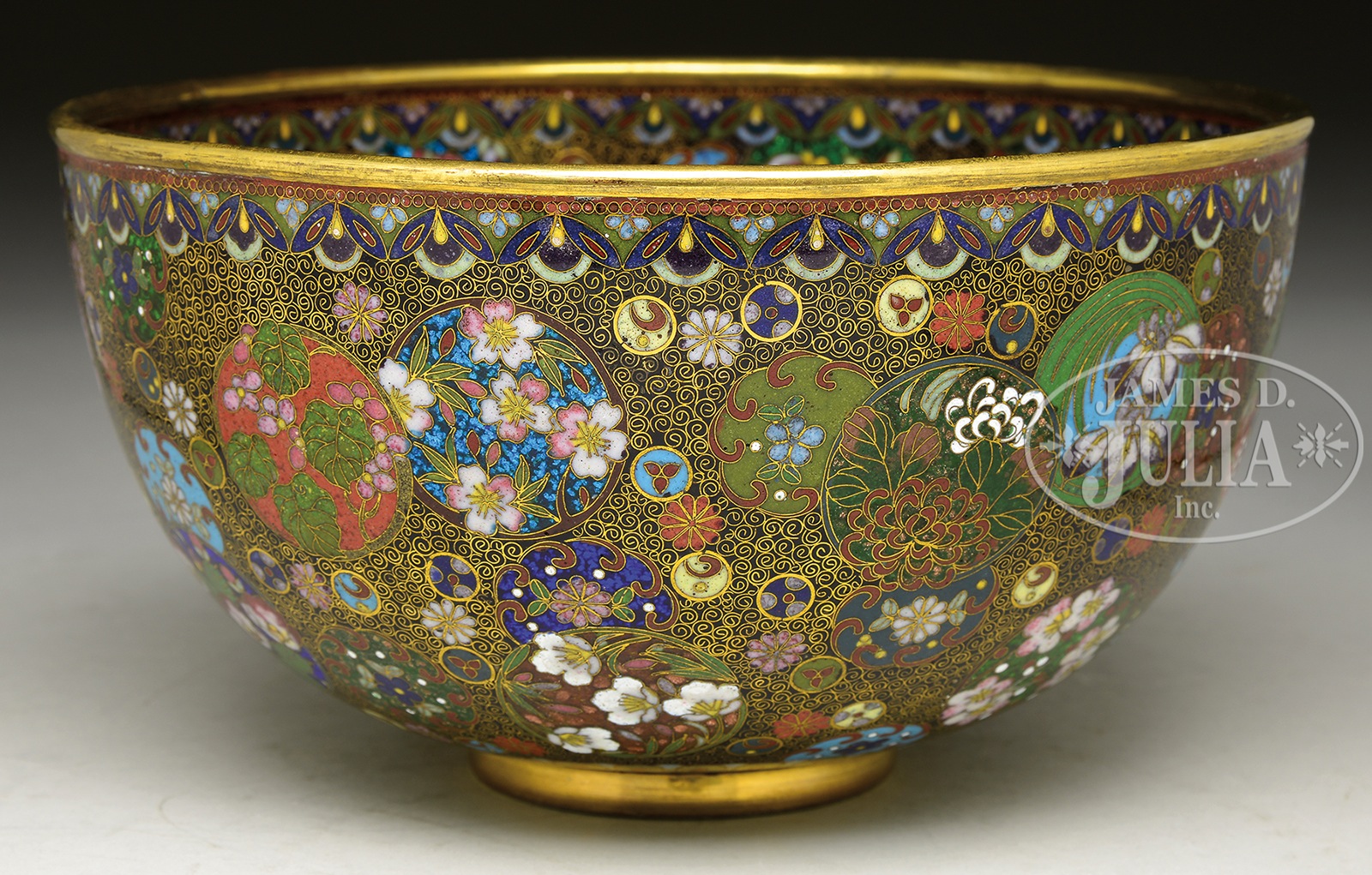 FINELY DECORATED KYOTO SHIPPO CLOISONNE BOWL.Meiji period (1868-1912), Japan. Decorated with roundels, flowers, brocade patterns, and auspicious emblems on a black ground. SIZE: 4″ h x 7-1/4″ dia. CONDITION: Very good. 7-74769 (1,000-1,500) – Lot 4116