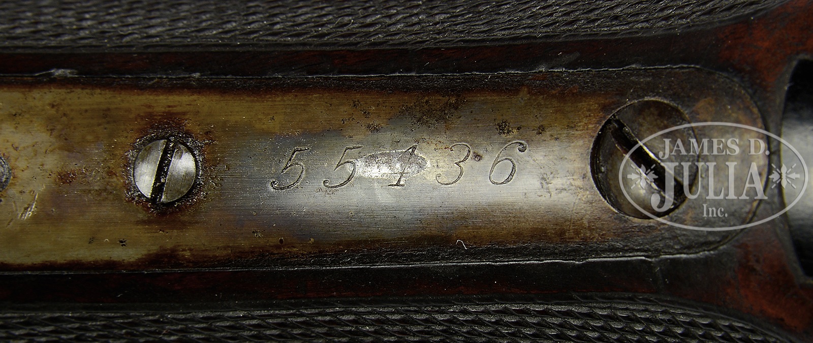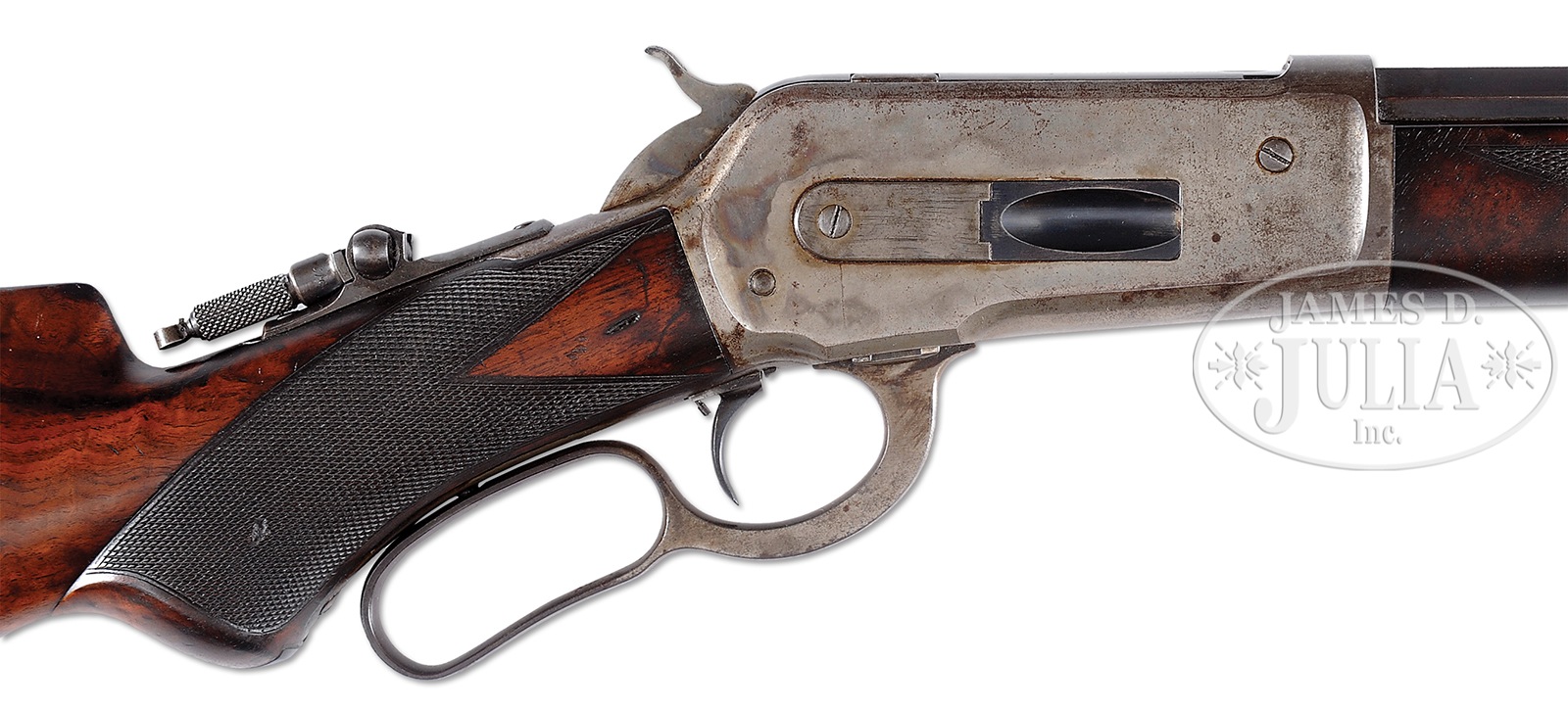 EXCEEDINGLY RARE AND DESIRABLE WINCHESTER 1886 CASE COLOR DELUXE EXTRA LENGTH RIFLE.SN 55436. Cal. 46-90 WCF. Manufactured April 1891 Deluxe Extra Fancy Model 1886 45-90 rifle with case colored receiver, hammer, lever and forend cap. Swiss butt with factory sling swivels and THIRTY inch matted bbl and full magazine. Highly figured 2X flame crotch walnut pistol grip checkered butt and forearm checkered in the H pattern. Marbles folding tang sight with sporting Lyman ivory bead blade front sight. Single set trigger with the initials “HvHG”. Accompanied with factory letter provided by The Buffalo Bill Historical Center in Cody, Wyoming. Special Note: This item(s) contains plant or animal properties that may be covered by the Endangered Species Act (ESA). We have taken care to ensure that this item(s) meets the standard for sale under the ESA. However, certain states and other countries have laws that are more restrictive than the ESA. It is the bidder’s responsibility to ensure that it is lawful to purchase or transport this item(s) into their state, and to obtain the necessary import and export approvals. Delay or failure to obtain any such permit or approval does not relieve the buyer of paying for the item(s) and consummating the purchase. CONDITION: Very fine. Much orig blue finish remaining on bbl with balance turning plum. 30″ magazine tube has somewhat turned brown. Receiver has a large amount of vivid case colors in protected areas while turning dark towards front of receiver and somewhat silvering on bottom. Hammer appears to have a large amount of case colors under years of dried grease that has remained undisturbed. Lever is as hammer with moderate case colors and pleasantly dried grease. Highly figured deluxe walnut stocks with ebony inlay at pistol grip are very fine with typical numerous small nicks and abrasions with several larger scrapes on forearm but still retain a very large amount of the orig piano varnish finish. Bore and mechanics are very good. Set trigger functioning properly. Swiss butt has mellowed to an even mustard and matting on top of bbl is very fine with typical edge wear that is found on this extra rare option. Factory documentation indicates the rifle was shipped with oct bbl, deluxe checkered pistol grip stocks, set trigger, cal 45-90, swing swivels, Swiss butt, and was shipped April 1891. There are two other dates of interest on the letter which are believed to be return and repair or possible upgrade dated May 19, 1894, and April 5, 1895. A very fine example that is uncleaned and in a pleasant state of preservation. 50506-50 TDW (20,000-30,000) IVORY – Lot 4116 Click here to view provenance