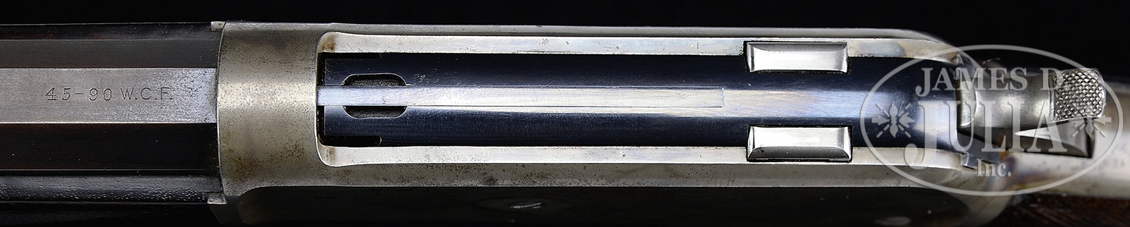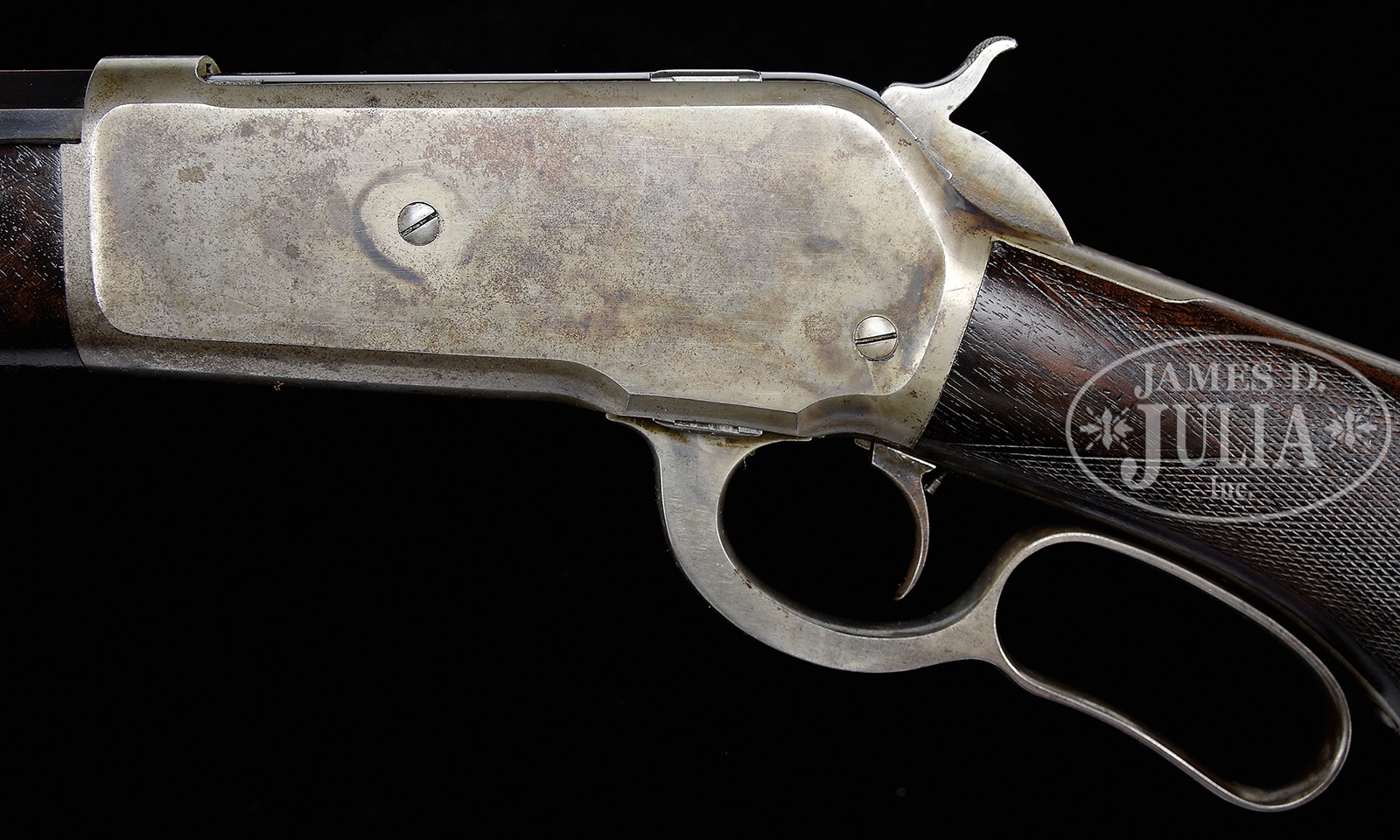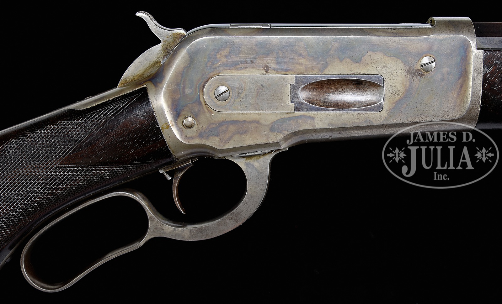 SUPERB WINCHESTER 1886 DELUXE EXTRA FANCY RIFLE CALIBER 45-90.SN 4962. Cal. 45-90 WFC. Case colored deluxe extra fancy 1886 Winchester rifle with 26″ full oct bbl and full magazine. Second year of manufacture 1887 with sporting ivory bead front sight and full buckhorn sporting rear sight. Highly figured select walnut stocks with checkered pistol grip and checkered forearm done in the H pattern. Pistol grip has traditional small ebony inlay and buttstock is fitted with the early thick patterned crescent buttplate. Factory equipped with single set trigger. Case colored receiver, crescent buttplate, forend cap, hammer and finger lever. Bbl has traditional early 2-line address forward of rear sight “-MANUFACTURED BY THE-/WINCHESTER REPEATING ARMS CO. NEW HAVEN, CONN. U.S.A.-“. Chamber marked with traditional “45-90 W.C.F.” caliber marking. There are no violent proofs on receiver or bbl. Accompanied by factory documentation from The Buffalo Bill Historical Center in Cody, Wyoming, in the form of a factory letter. Special Note: This item(s) contains plant or animal properties that may be covered by the Endangered Species Act (ESA). We have taken care to ensure that this item(s) meets the standard for sale under the ESA. However, certain states and other countries have laws that are more restrictive than the ESA. It is the bidder’s responsibility to ensure that it is lawful to purchase or transport this item(s) into their state, and to obtain the necessary import and export approvals. Delay or failure to obtain any such permit or approval does not relieve the buyer of paying for the item(s) and consummating the purchase. CONDITION: Exceptionally fine overall condition, this second year production 1886 is in a very fine state of preservation with most factory blue finish remaining on bbl and magazine with slight wear at muzzle and crowns of oct flats. Magazine band has turned rather plum in appearance. Magazine tube shows very slight finish loss at muzzle end and thinning of finish on left side just forward of forend cap. Receiver retains most vivid case coloring on loading gate side with silvering occurring at the confluence of receiver and right side of forearm. Left side of receiver has strong traces of case coloring with slight staining at forward end. Bottom of frame has somewhat silvered with slight darkening towards bottom of forearm. Tang which has the early single line marking “-MODEL 1886-” has strong case colors in protected areas around hammer with balance towards tang screw turning rather plum. Crescent buttplate is mostly silvered with shadows of case coloring remaining. The highly figured deluxe pistol grip buttstock is very fine with most finish remaining with typical loss at wrist from handling and use. Numerous period small bruises and scratches are evident but more so on left side. Deluxe checkered forearm retains approximately half of the factory varnish with finish loss and checkering wear in central area and on bottom. Bore and mechanics are exceptional and single set trigger is functioning properly. A very fine overall condition second year of manufacture extra fancy deluxe Model 1886. 50506-46 TDW (17,500-27,500) IVORY – Lot 4120 Click here to view provenance