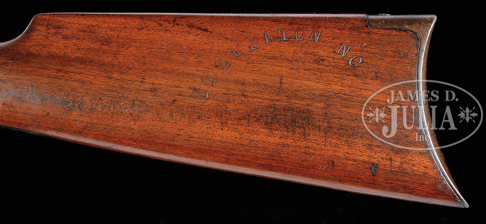 *RARE WINCHESTER MODEL 1886 LINE GUN.SN 154404A. Cal. 45-70 SB. 14″ bbl. Blue finish. Straight grain American walnut stocks with crescent buttplate. Bbl shows a 2-line Winchester address rolled on forward left flat. No front-sight. Blade-sight mounted in mortise 5″ in front of receiver. No rear sight. Breech-end of bbl is marked “45-70” on left flat. WP proof in circle on top flat in front of receiver. Upper tang reads Model 1886 over Winchester over trademark. SN is stamped on lower tang behind lever. Stock is stamped on left side “CG Edenton NC”. This rifle is listed by SN on the BATF list of weapons removed from the NFA as collectors items and classified as Curio or Relics under the GCA. CONDITION: Very good to fine, for this model. Bbl retains 50% blue finish that is drifting to a plumb-brown with high point wear and a few dents and scratches. Markings are sharp. Bore is frosty with some stains. Magazine tube retains 60-70% blue finish with a few scratches. Receiver shows 30% blue with some staining and light pitting on left forward side. Screws are not molested. Markings are sharp and clear. Hammer and lever show a considerable amount of finish with some light rust stains that would be expected for this type of gun. Trigger also shows rust stain overall. Stocks are very good, full-sized, and retain nearly all of oil finish, with a few scratches and dents. Mark on buttstock is clear. An opportunity to obtain a very rare example of a Winchester Model 86 Linegun in far above average condition, which is directly associated with the United States Coast Guard. 50974-2 TEP (6,000-8,000) C&R – Lot 4131 Click here to view provenance