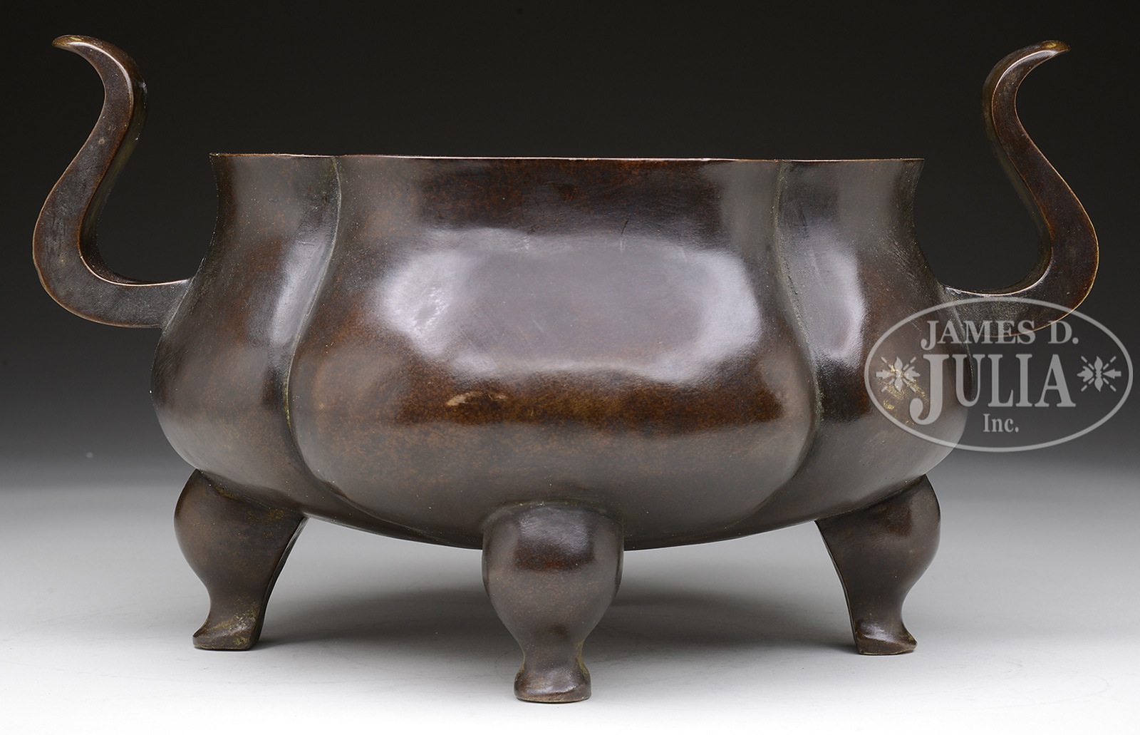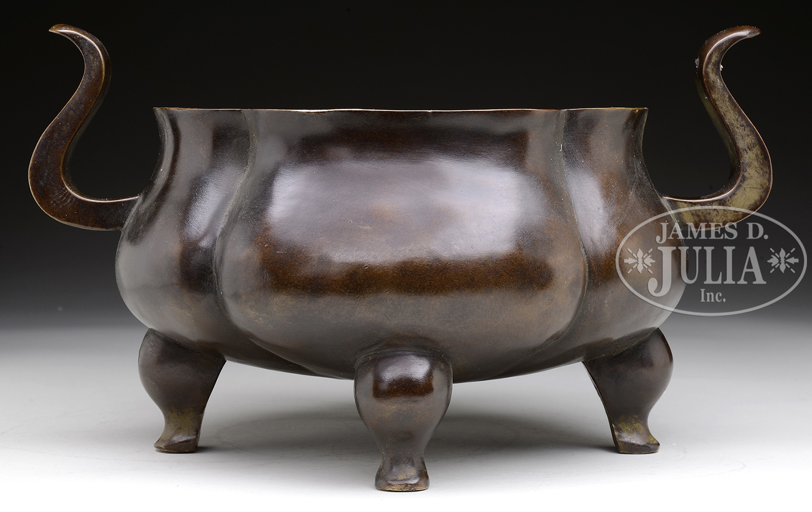 LARGE BRONZE TRIPOD CENSER.China. Cast 6-character Xuande mark on base. Very heavily cast and of quatrelobed form with two large handles, all raised on three legs. SIZE: 13-3/4″ handle to handle. CONDITION: Good. Some minor wear to interior. 49047-13 (800-1,200) – Lot 4134