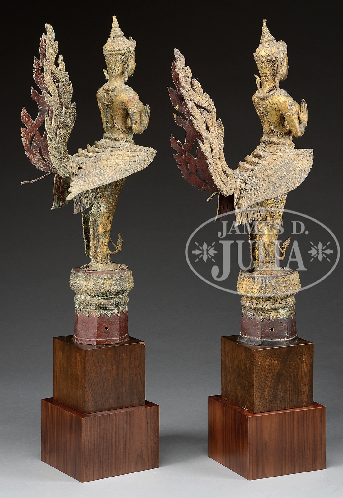 19th century, Thailand. Torso of a woman with hands in prayer and body of a phoenix. Mounted on iron stand. SIZE: 32″ h. CONDITION: Overall good. Some minor repairs to tails and wings. Minor losses to gilding. Typical wear to edges due to age. 1053-3 (1,200-1,800) – Lot 4137