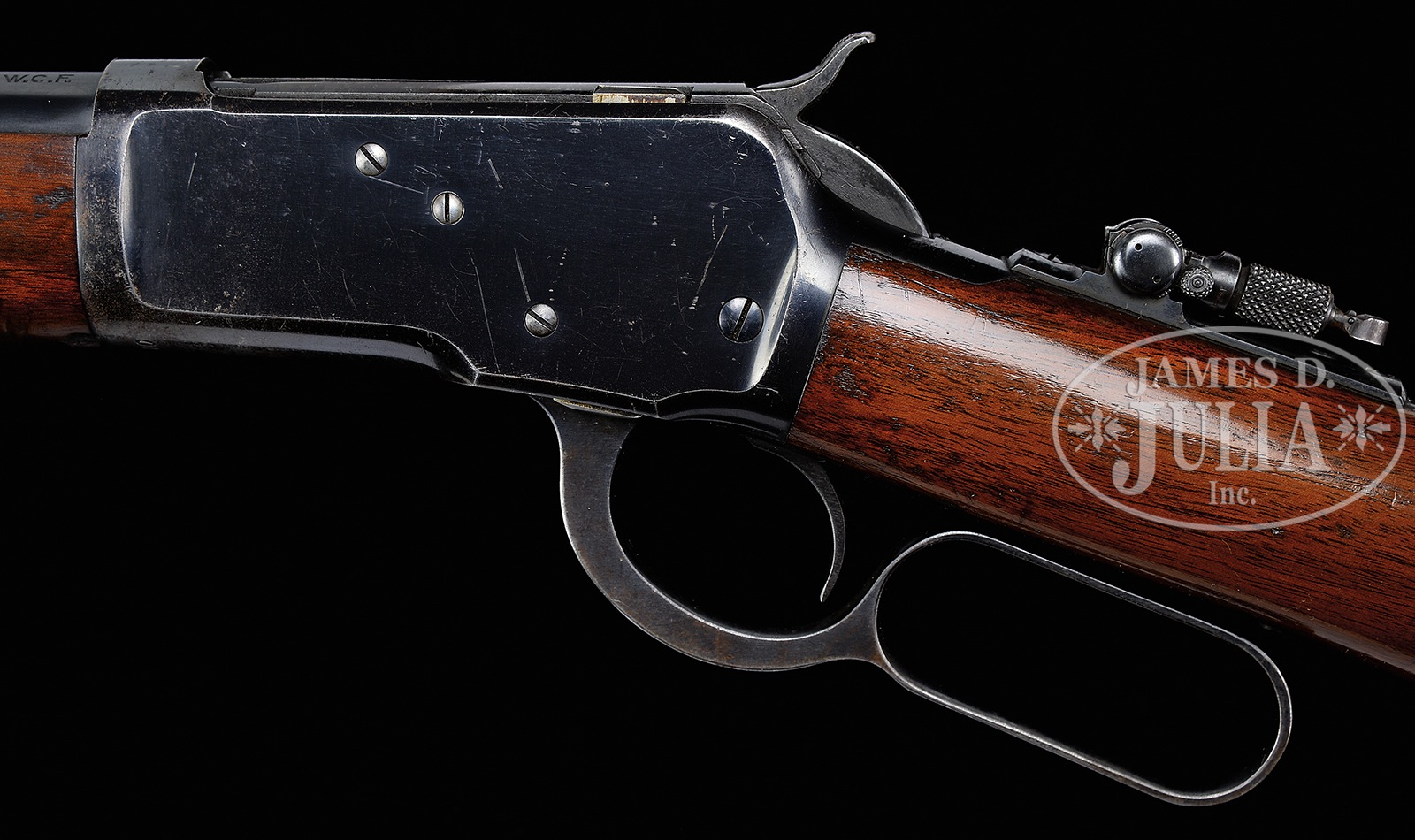 *FINE SPECIAL ORDER 1892 WINCHESTER RIFLE CALIBER 25-20 WITH FACTORY TANG SIGHT.SN 867870. Cal. 25-20. Manufactured in 1918 with 24″ tapered rnd bbl with Lyman bead front sight, standard 2-line Winchester address on left side of bbl marked 25-20 WCF with strong and sharp Winchester proof over chamber. This bbl was made with no rear sight seat. Was never cut for provision for rear sight from the factory and is mounted with a folding Lyman tang sight. High polish blue receiver with blue finger lever, hammer and crescent buttplate. CONDITION: Very fine condition overall, with very slight muzzle wear and finish loss. Several very slight striations or imperfections in bbl finish which come to light when in bright sunlight or use of high intensity lights. Full length magazine with slight thinning of finish just forward of forearm and at very muzzle end. Rich deep high polish finish from Winchester during the late teens is very prevalent with most all remaining on receiver and tang. A number of small scratches are evident on left side of receiver from storage and light handling with very typical light loss of finish at edges of receiver. Right side of receiver has matching finish with numerous small imperfections with very light finish loss, however, some thinning of finish with a small amount of bright steel showing is evident in the SN area of bottom of receiver. Top of bolt, however not worn, is suffering from mild finish flaking so prevalent during this time frame of the 1892 production. Tang is marked “Model 1892 Winchester” with trademark markings underneath in traditional manner and retains virtually all of its factory finish verifying that this rifle has lived with a tang sight its entire life. Folding Lyman tang sight is exceptional condition with most all bright finish remaining and functions properly and locks properly. 2-pc walnut stocks are very fine with slight finish loss on forearm at point of hand rest. Slight oil darkening and several scratches and bruises are evident with one very minor chip on bottom above SN with a small amount of material loss. Buttstock is very fine with several small scratches and compression scratches with one narrow gouge on left side of butt just above crescent that appears to be period as it is lightly oil darkened. Most all factory finish remains. Bore is bright and sharp. Mechanics are tight and crisp. A lovely special order 25-20 1892 in fine overall condition. 51005-14 TDW (3,000-4,000) C&R – Lot 4143