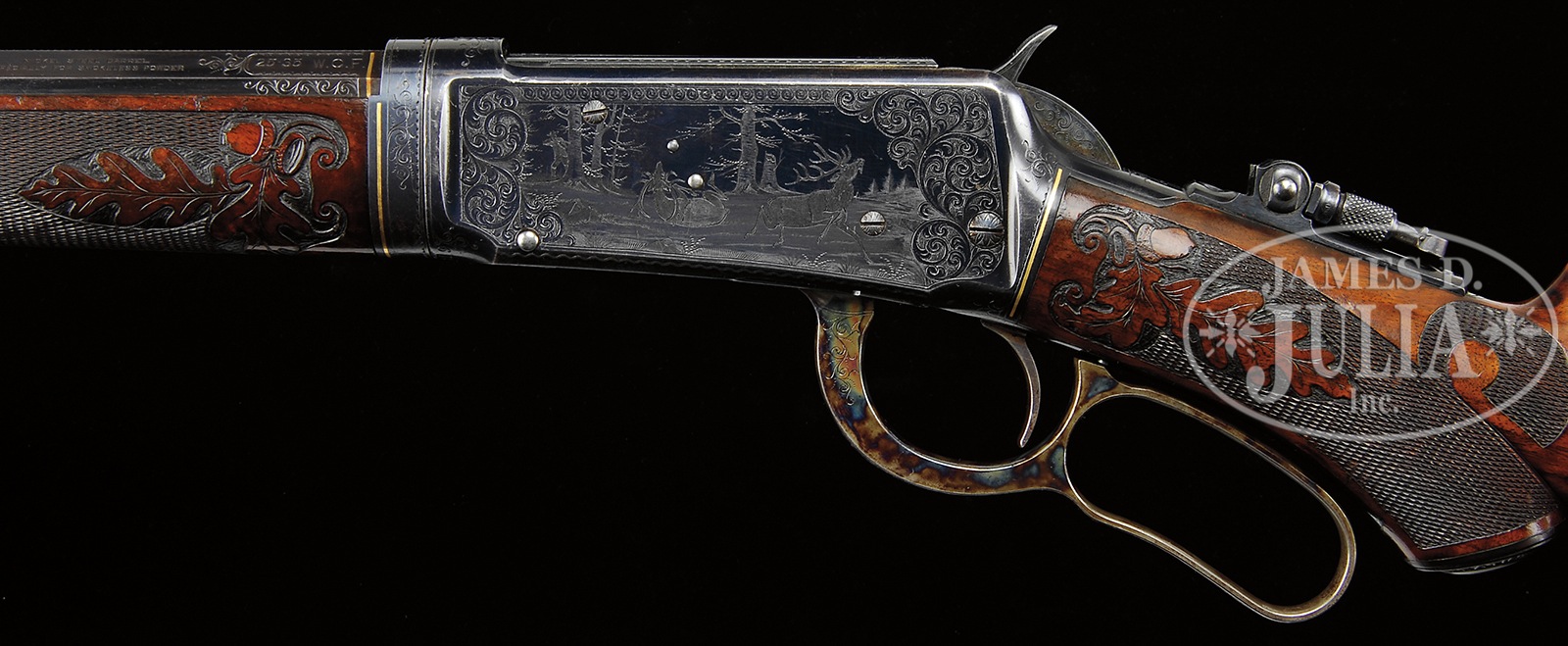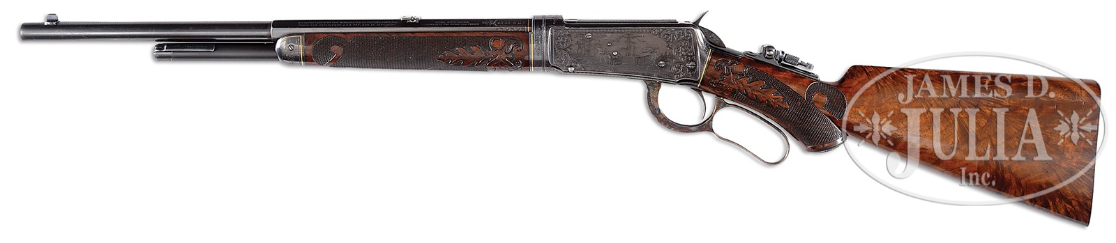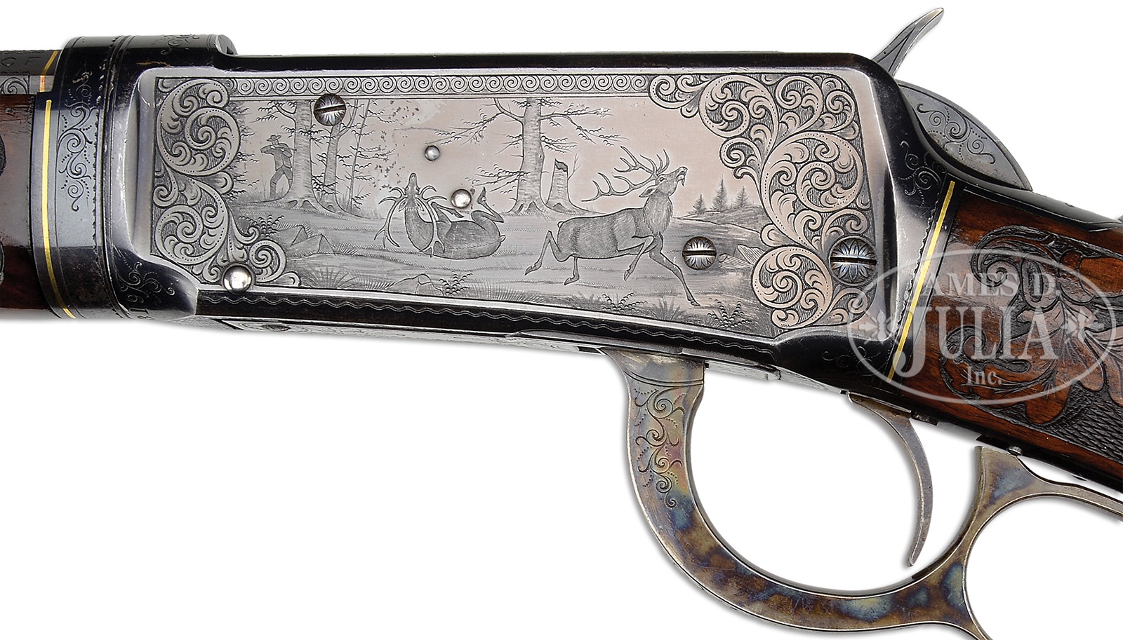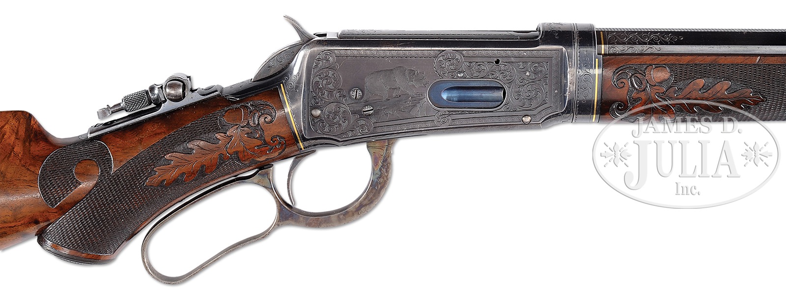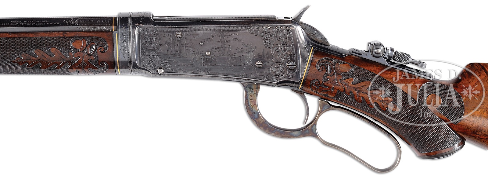 EXCEEDINGLY RARE SPECIAL ORDER DELUXE ULRICH ENGRAVED WITH GOLD TAKEDOWN WINCHESTER MODEL 94 LEVER ACTION SHORT RIFLE.SN 139319. Cal. 25-35. Outstanding & rare deluxe Model 1894 short rifle with 18″ full matted 1/2 oct bbl, half magazine with Lyman ivory bead front sight, Lyman 6A folding rear sight and a Lyman combination tang sight. Mounted with extremely beautiful center crotch flame grain American walnut with Style D carved forearm & capped pistol grip stock with smooth steel buttplate. Left side of lower tang, under the wood, is stamped with assembly number “16027”, “XXXX” and “R”. Matching assembly number is stamped in top tang channel of buttstock along with “94”. Buttplate is not numbered although there appears to be some pencil writing that is indecipherable, however there is no doubt whatsoever that this buttplate is orig to this rifle. Receiver is engraved in style 4, most likely by John Ulrich, though unsigned. Engraving consists of the very large vignette of a hunter standing behind a tree having shot two bull elk, all in an extremely detailed forest scene. Each end of vignette is engraved with flowing foliate arabesque patterns with shaded background. Right side of receiver has the engraved vignette of a grizzly bear on a mountain precipice with matching foliate arabesque patterns fore & aft. Both sides have wavelet borders. Screw heads are also engraved. Top & bottom edges of receiver are engraved with snake & dot patterns with light foliate arabesque patterns over receiver ring, floorplate, forend cap, buttplate tang and over chamber area of bbl. Sides & edges of lever & hammer are engraved to match. Rear edge of receiver, front edge of takedown ring, end of bbl at the receiver and forend cap are inlaid with flush gold wire. Heel of buttplate is also inlaid with gold wire. Accompanied by a Cody Firearms Museum letter identifying this rifle in caliber 25-35 with 18″ 1/2-oct matted bbl, plain trigger, fancy pistol grip stock with carved style D pattern, half magazine, engraved $24.00, takedown and shotgun butt, received in the warehouse Dec. 13, 1902 and shipped the same day to Order #166248. Though shipped in 1902, gun was manufactured in 1897. This fabulous little rifle has renowned collection history. PROVENANCE: Ex-Eldon Owens Collection; Ex-Wes Adams Estate Collection. Special Note: This item(s) contains plant or animal properties that may be covered by the Endangered Species Act (ESA). We have taken care to ensure that this item(s) meets the standard for sale under the ESA. However, certain states and other countries have laws that are more restrictive than the ESA. It is the bidder’s responsibility to ensure that it is lawful to purchase or transport this item(s) into their state, and to obtain the necessary import and export approvals. Delay or failure to obtain any such permit or approval does not relieve the buyer of paying for the item(s) and consummating the purchase. CONDITION: Extremely fine, all matching. Bbl retains 96-98% strong orig blue with light muzzle edge wear and a couple of minor thinned areas; magazine tube retains virtually all of its orig blue; forend cap retains about 98% glossy orig blue as does the takedown ring; receiver retains 95-97% glossy orig blue with only high point and fine sharp edge wear; loading gate retains about 98% orig fire blue; lever & hammer retain most of their brilliant orig case colors, lightly faded on outer face of lever; buttplate retains about 80% strong blue showing wear at heel & toe and around edges; wood is sound with a very few, very minor handling & storage nicks & scratches and retains virtually all of its orig piano varnish finish. Sights are equally fine, retaining most of their orig finish, including Lyman “certifiable antique ivory” front bead. Mechanics are crisp, bright shiny bore. 50412-2 (75,000-150,000) IVORY – Lot 4147 | Click here to view provenance
