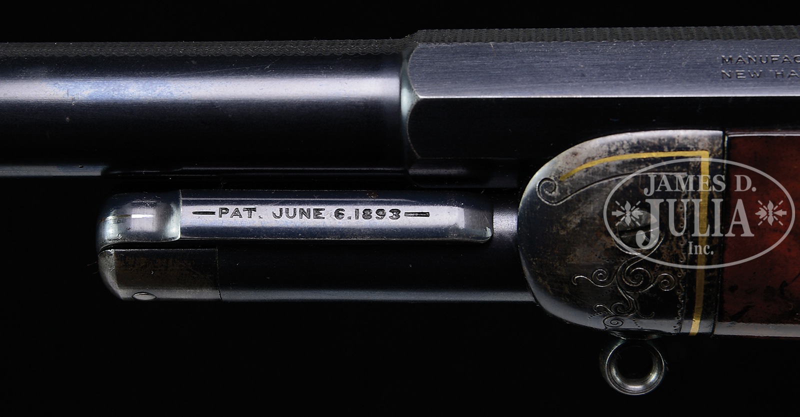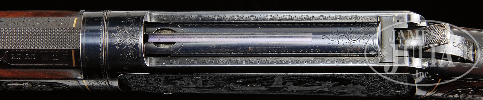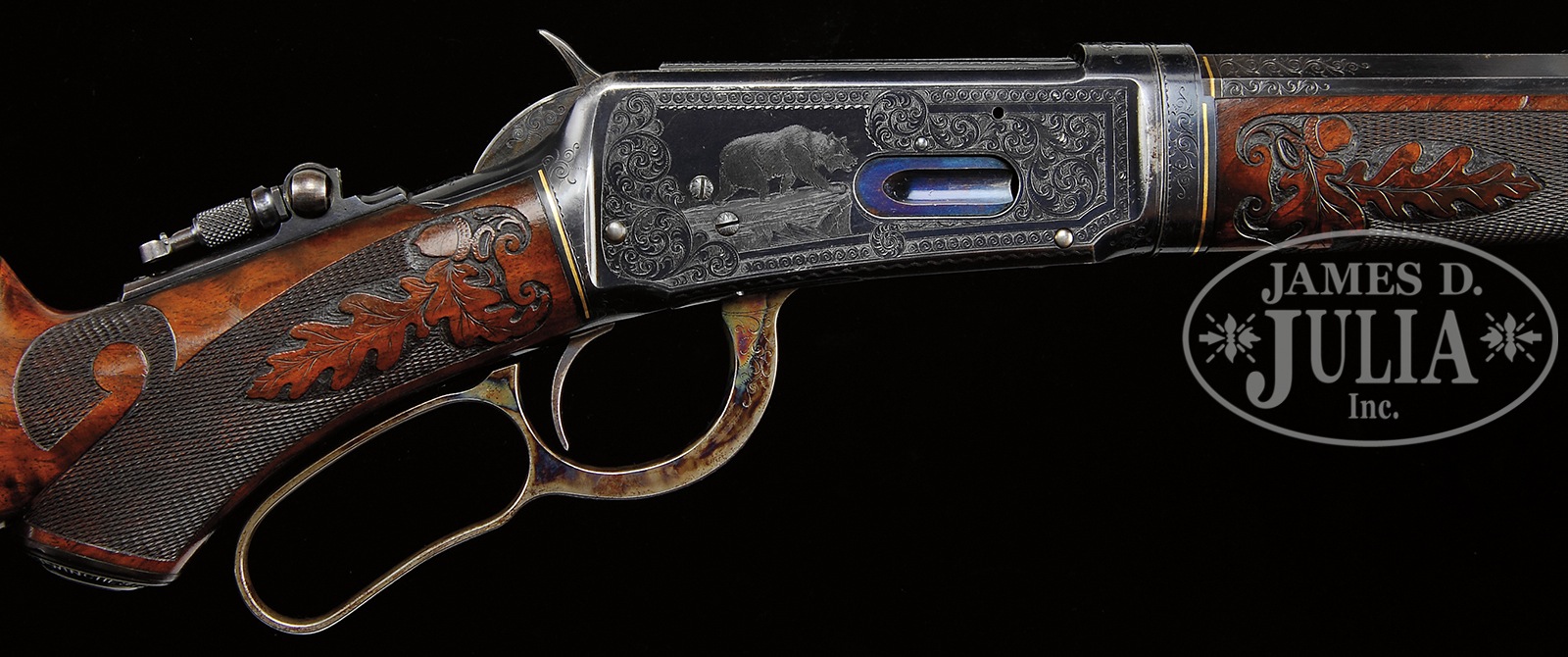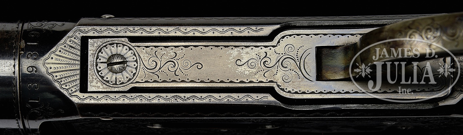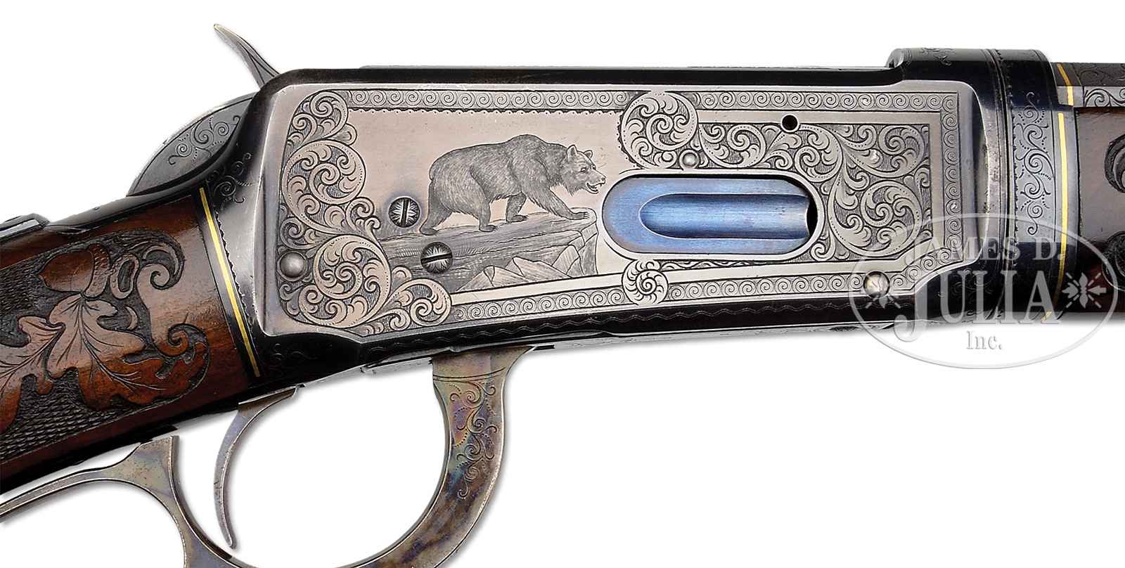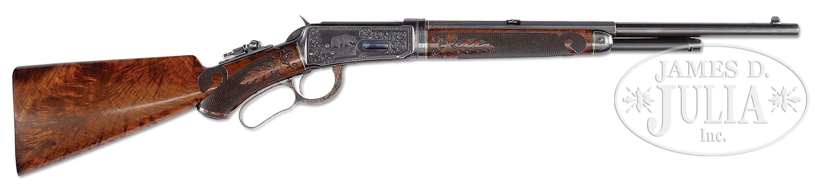 EXCEEDINGLY RARE SPECIAL ORDER DELUXE ULRICH ENGRAVED WITH GOLD TAKEDOWN WINCHESTER MODEL 94 LEVER ACTION SHORT RIFLE.SN 139319. Cal. 25-35. Outstanding & rare deluxe Model 1894 short rifle with 18″ full matted 1/2 oct bbl, half magazine with Lyman ivory bead front sight, Lyman 6A folding rear sight and a Lyman combination tang sight. Mounted with extremely beautiful center crotch flame grain American walnut with Style D carved forearm & capped pistol grip stock with smooth steel buttplate. Left side of lower tang, under the wood, is stamped with assembly number “16027”, “XXXX” and “R”. Matching assembly number is stamped in top tang channel of buttstock along with “94”. Buttplate is not numbered although there appears to be some pencil writing that is indecipherable, however there is no doubt whatsoever that this buttplate is orig to this rifle. Receiver is engraved in style 4, most likely by John Ulrich, though unsigned. Engraving consists of the very large vignette of a hunter standing behind a tree having shot two bull elk, all in an extremely detailed forest scene. Each end of vignette is engraved with flowing foliate arabesque patterns with shaded background. Right side of receiver has the engraved vignette of a grizzly bear on a mountain precipice with matching foliate arabesque patterns fore & aft. Both sides have wavelet borders. Screw heads are also engraved. Top & bottom edges of receiver are engraved with snake & dot patterns with light foliate arabesque patterns over receiver ring, floorplate, forend cap, buttplate tang and over chamber area of bbl. Sides & edges of lever & hammer are engraved to match. Rear edge of receiver, front edge of takedown ring, end of bbl at the receiver and forend cap are inlaid with flush gold wire. Heel of buttplate is also inlaid with gold wire. Accompanied by a Cody Firearms Museum letter identifying this rifle in caliber 25-35 with 18″ 1/2-oct matted bbl, plain trigger, fancy pistol grip stock with carved style D pattern, half magazine, engraved $24.00, takedown and shotgun butt, received in the warehouse Dec. 13, 1902 and shipped the same day to Order #166248. Though shipped in 1902, gun was manufactured in 1897. This fabulous little rifle has renowned collection history. PROVENANCE: Ex-Eldon Owens Collection; Ex-Wes Adams Estate Collection. Special Note: This item(s) contains plant or animal properties that may be covered by the Endangered Species Act (ESA). We have taken care to ensure that this item(s) meets the standard for sale under the ESA. However, certain states and other countries have laws that are more restrictive than the ESA. It is the bidder’s responsibility to ensure that it is lawful to purchase or transport this item(s) into their state, and to obtain the necessary import and export approvals. Delay or failure to obtain any such permit or approval does not relieve the buyer of paying for the item(s) and consummating the purchase. CONDITION: Extremely fine, all matching. Bbl retains 96-98% strong orig blue with light muzzle edge wear and a couple of minor thinned areas; magazine tube retains virtually all of its orig blue; forend cap retains about 98% glossy orig blue as does the takedown ring; receiver retains 95-97% glossy orig blue with only high point and fine sharp edge wear; loading gate retains about 98% orig fire blue; lever & hammer retain most of their brilliant orig case colors, lightly faded on outer face of lever; buttplate retains about 80% strong blue showing wear at heel & toe and around edges; wood is sound with a very few, very minor handling & storage nicks & scratches and retains virtually all of its orig piano varnish finish. Sights are equally fine, retaining most of their orig finish, including Lyman “certifiable antique ivory” front bead. Mechanics are crisp, bright shiny bore. 50412-2 (75,000-150,000) IVORY – Lot 4147 | Click here to view provenance