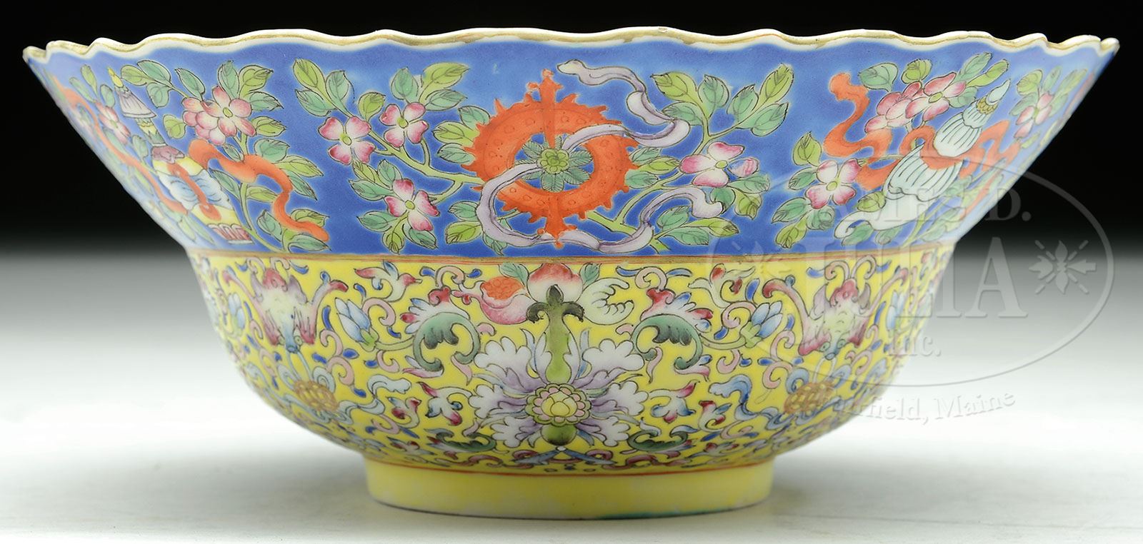 PORCELAIN BOWL. 19th century, China. Scalloped edge. Decoration of lotus scrolls on a yellow ground, surmounted by the “Pa Pao Shiang” and a blue ground. Turquoise interior. Ch’ia Ch’ing mark on the base. SIZE: 3″ h x 7-1/2″ dia. CONDITION: Very good. 7-74386 (200-300)