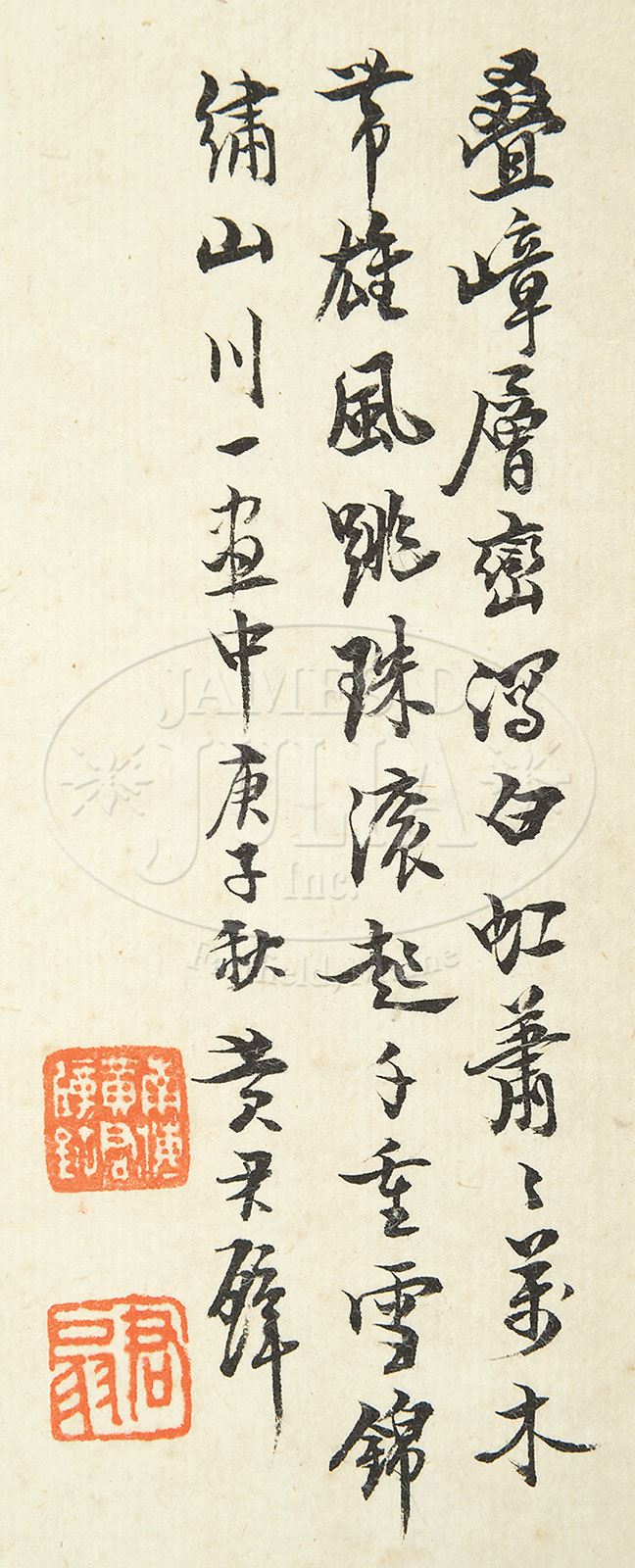 HANGING SCROLL IN THE MANNER OF HUANG JUNBI. China, ink and colors on paper, depicting a mountainous landscape with cottages and streams, signed “Huang Junbi,” dated “autumn of gengzi year,” with two seals SIZE: 36″ x 16″. CONDITION: Foxing. 9-91625 (600-800)