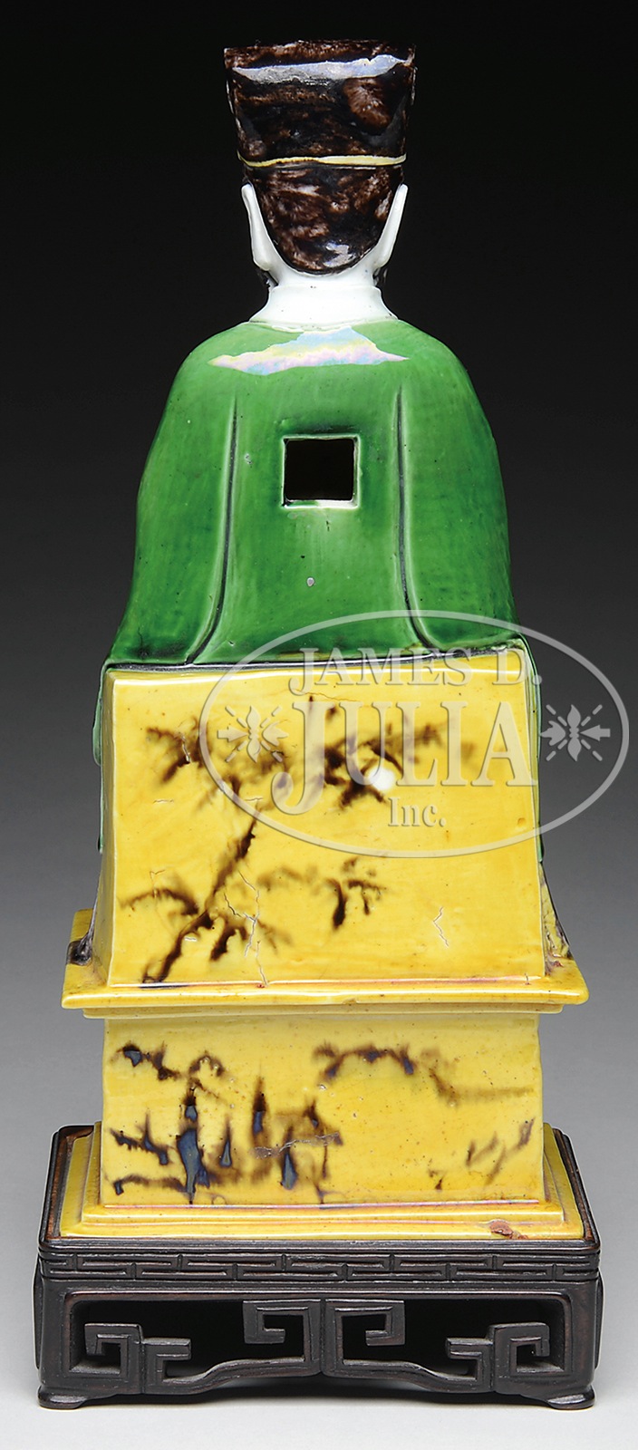 PORCELAIN DEITY.18th century, China. San Tsai figure seated on a throne in court costume. Fitted in a carved hard wood stand. SIZE: 11-1/2″ h overall. PROVENANCE: Ralph M. Chait Galleries, NY sticker on base. CONDITION: Vibrant colors, no abrasions. Kiln cracks beneath glaze on rear of figure. 49177-1 (3,000-5,000) – Lot 4157