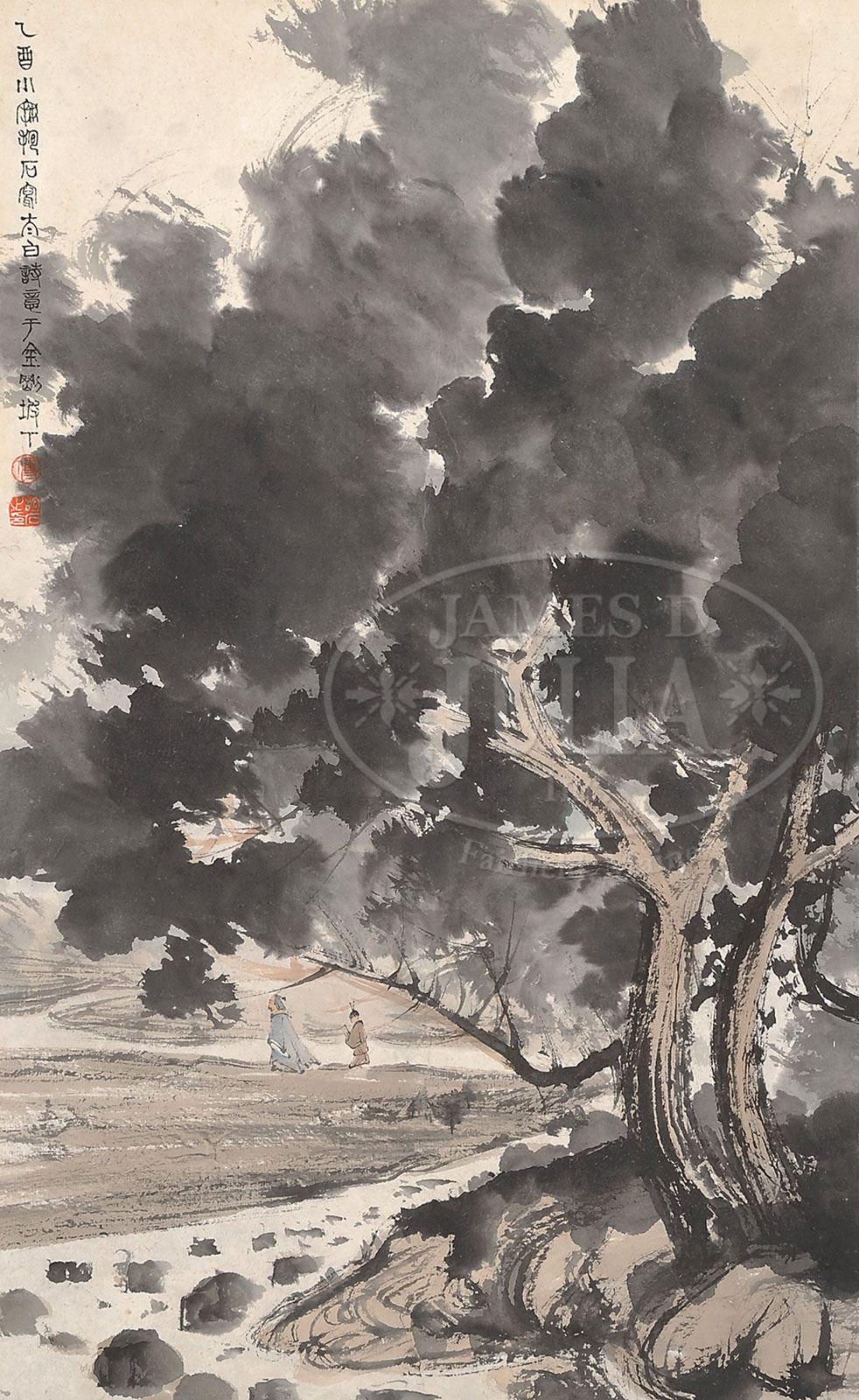 HANGING SCROLL IN THE MANNER OF FU BAOSHI. China, ink and light colors on paper, finely depicting a scholar and his attendant walking in a landscape, inscribed, dated “yiyou year,” signed “Baoshi,” with two seals, SIZE: 27″ x 16-3/4″. CONDITION: Good. 9-91626 (700-900)
