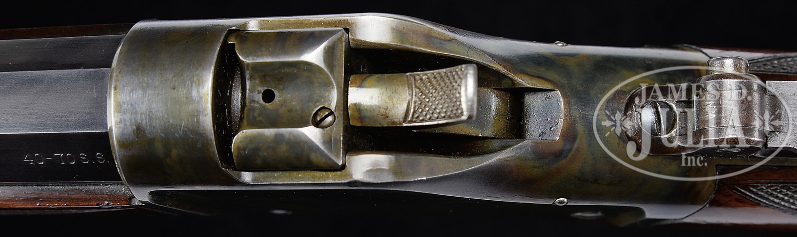Please Note: Great News! Information provided by the Cody Firearms Offices verifies the configuration of the firearm (viewable online). SUPERB DELUXE MODEL 1885 WINCHESTER WITH SWISS BUTT.SN 58856. Manufactured 1892 with deluxe pistol grip checkered stocks with Swiss butt, case colored receiver and 30″ one-third oct No. 3 bbl. Equipped with windage adjustable front aperture sight and graduated staff peep sight. Chambered for 40-70 Sharps straight. CONDITION: Superb overall condition, with most all factory finish remaining on bbl with light thinning at muzzle and slightly turning plum. Traditional 2-line Winchester address on top flat of oct forward of rear sight. Cal. designation on left flat to rear of rear sight. Case colors are exceptional with very light thinning at top of receiver and at lower tang in SN area. Receiver has been re-lacquered to preserve the vivid case colors. Graduated rear peep sight has turned plum in color but functions flawlessly. Front windage adjustable aperture sight has some finish loss with approximately 50% turning plum. Brass Swiss butt at one time was silver washed but has only traces of silver in protected areas. Balance has turned to an even mustard patina. 2-pc deluxe checkered stocks are checkered in the Winchester H pattern with small ebony inlay at pistol grip. Forearm has slight crack at very end along oct bbl flat just above ebony forend tip inlay. Balance of forearm is very fine with numerous period compression dents and several very minor scratches from period use. Stocks have been expertly cleaned and polished and almost all piano finish remains. Deluxe pistol grip stock with cheek rest has several small areas of distress one directly behind tang sight from tang sight making contact with finish when folding and typical edge wear at high point of cheek rest from being rested upon. A very minute chip at end of pistol grip cap which is very old and almost indiscernible. In addition, there are several small scratches and compression dents at heel of stock but are quite old. Most all piano finish is still there,has been polished, and is quite elegant. Rifle is equipped with a single set trigger that functions flawlessly and has an excellent bore and mechanics. 51005-6 TDW (5,000-8,000) – Lot 4166 Click here to view provenance
