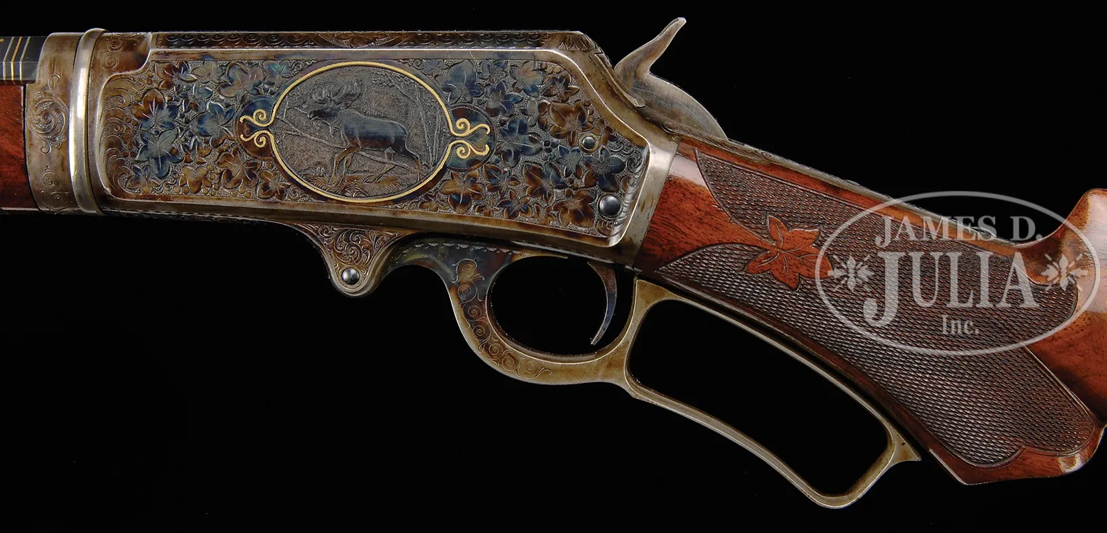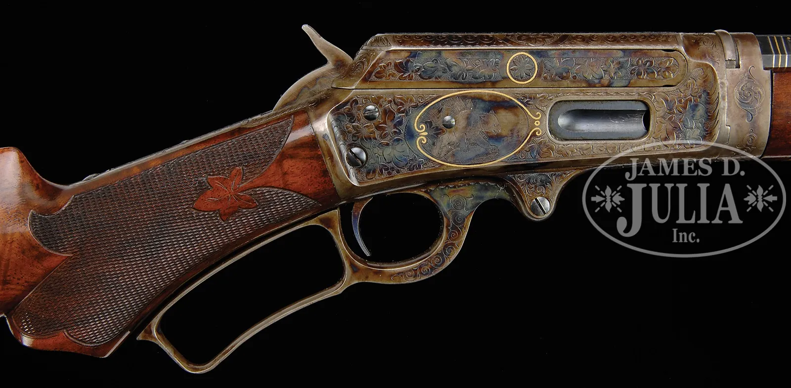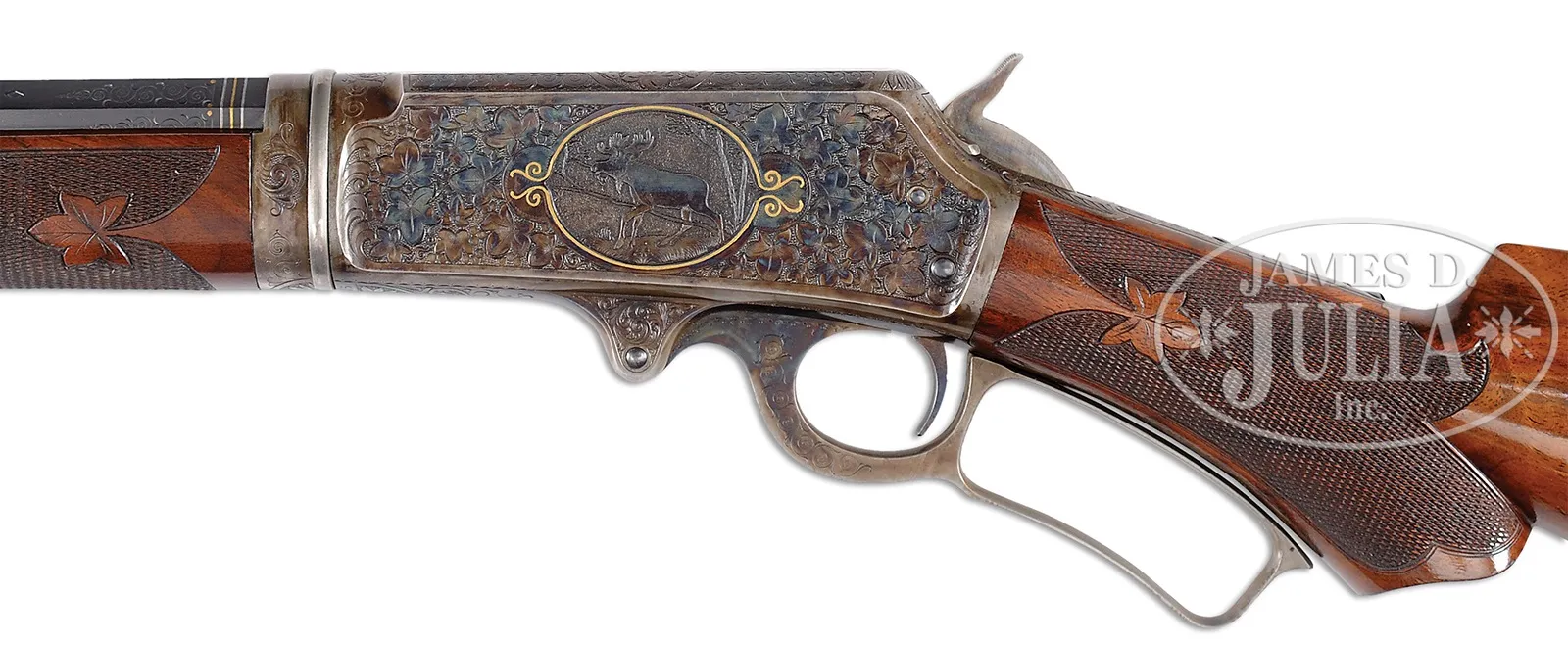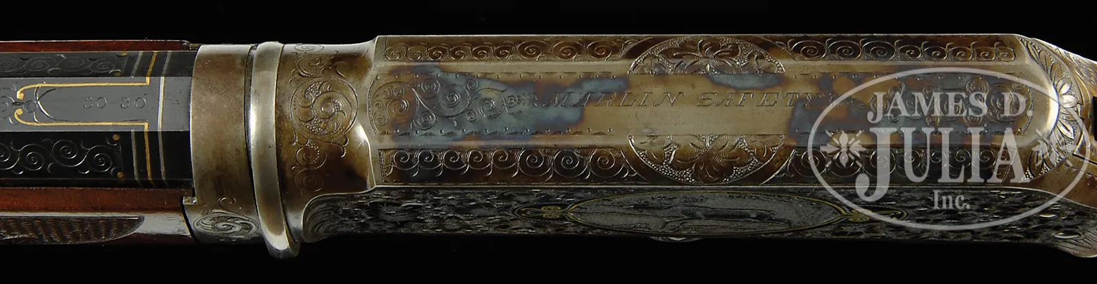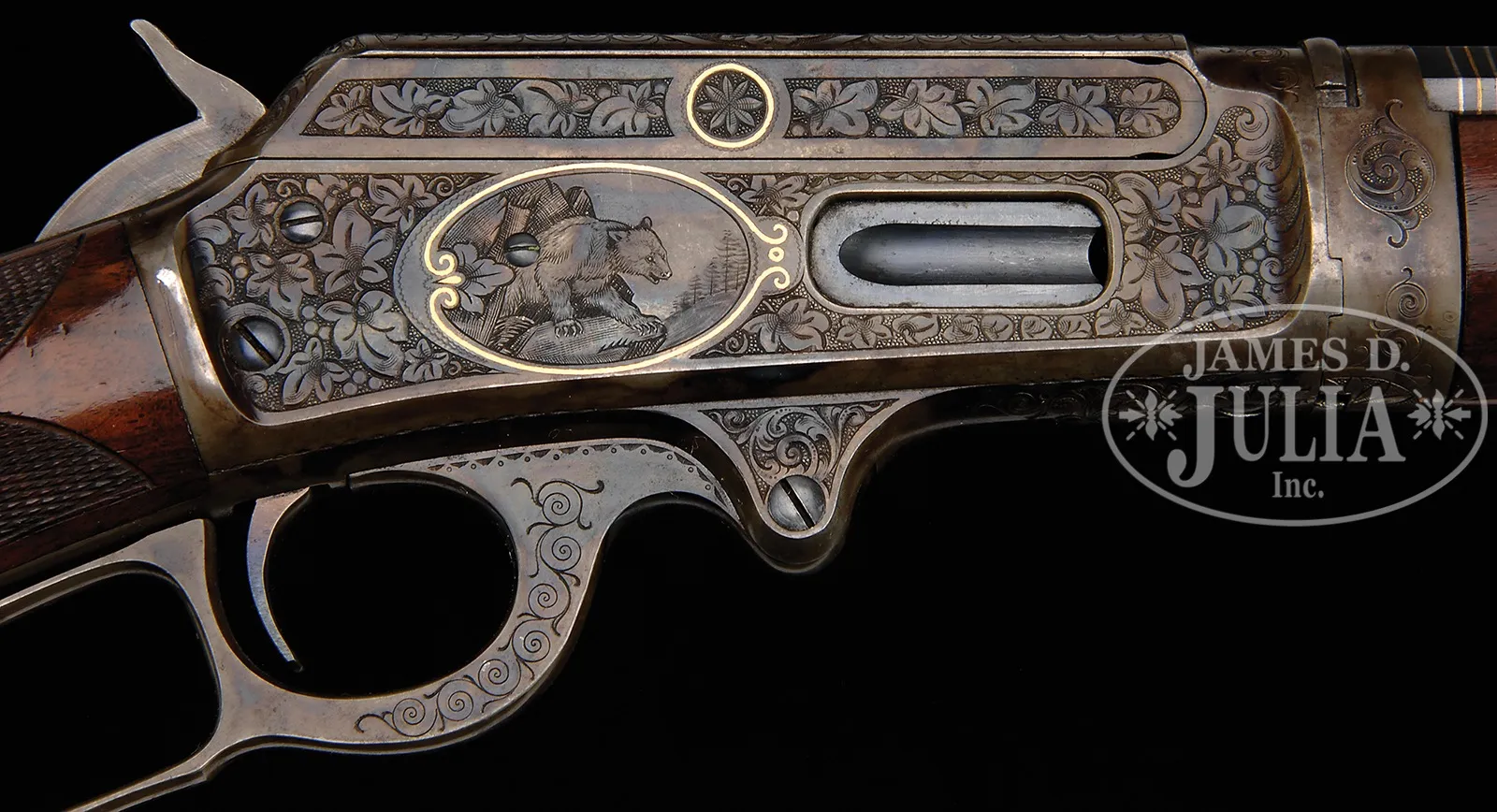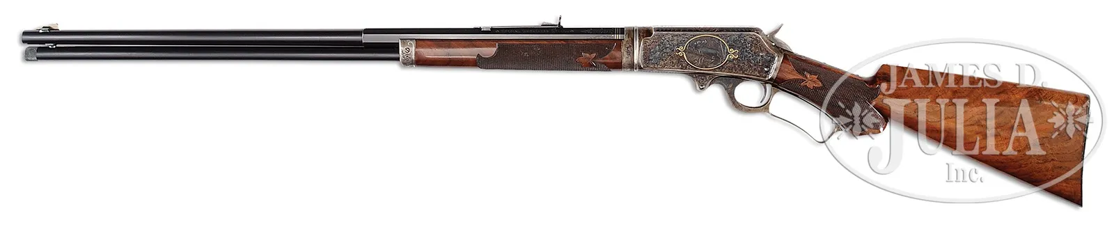 EXTREMELY RARE DELUXE CONRAD ULRICH ENGRAVED EXHIBITION QUALITY MARLIN MODEL 1893 TAKEDOWN LEVER ACTION RIFLE IN EXTREMELY FINE CONDITION WITH GOLD AND PLATINUM INLAY.SN 155286. Cal. 30-30. Spectacular Marlin with 26″ oct to rnd bbl, full magazine, takedown with German silver Rocky Mountain front sight and sporting rear sight. Mounted with highly figured, shell grain European walnut with #10 checkered & carved forearm and serpentine pistol grip stock with Marlin hard rubber buttplate. Carving consists of a maple leaf and special borders on each side of both stock & forearm. SN is on bottom of receiver, left side of top tang, under the wood and inside top tang channel of buttstock. Receiver is engraved in spectacular #10 style, by Conrad Ulrich. Engraving consists of the large oval vignette of a semi-relief bull moose in a very detailed forest scene with very fine stippled background. Right side is engraved in a slightly smaller vignette of an extreme highly detailed grizzly bear in a mountain scene. Both sides of receiver have nearly full coverage, semi-relief grape leaves with fine punch dot background. Both vignettes are outlined in inlaid gold wire. Bolt is engraved to match with a flower blossom in the center surrounded by gold wire inlay. Bottom & top of receiver are engraved in foliate arabesque patterns with grape leaves in the center on top side flats. Lever boss, top tang, takedown ring and forend cap are engraved to match. Sides of lever & the exposed flats of the bbl, over chamber area are engraved in light arabesque patterns. Chamber area of the bbl and around the caliber marking is inlaid with two platinum wire inlays and a gold wire inlay with three gold dots on each side. Forend cap has platinum wire inlay. This 1893 Marlin rifle with such extensive engraved coverage, special carved wood, gold and platinum inlay, and such high orig finish is exceedingly rare. PROVENANCE: Ex-Clarence Parks Collection; Ex-Wes Adams Collection. CONDITION: Extremely fine plus, all matching. Overall rifle retains virtually all of its crisp orig factory finish with bright orig blue and brilliant case colors, only slightly faded on takedown ring and outer faces of finger loop. Wood is sound with a few, very light handling & storage nicks & scratches and retains virtually all of its brilliant factory piano varnish finish. Mechanics are crisp, brilliant shiny bore, may be unfired. 50412-17 (50,000-100,000) – Lot 4177