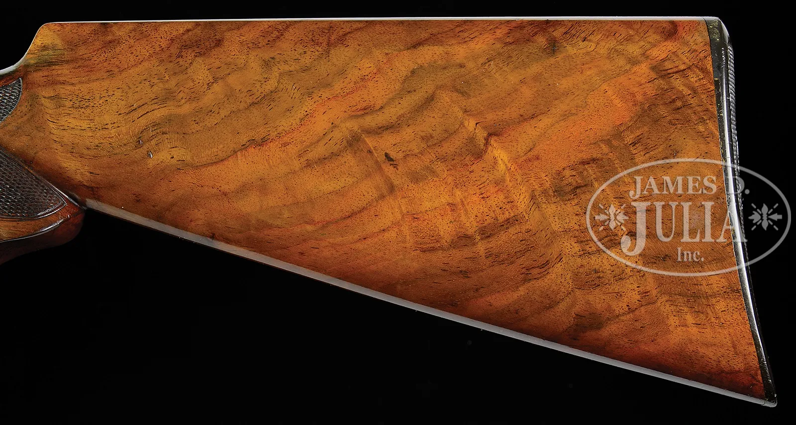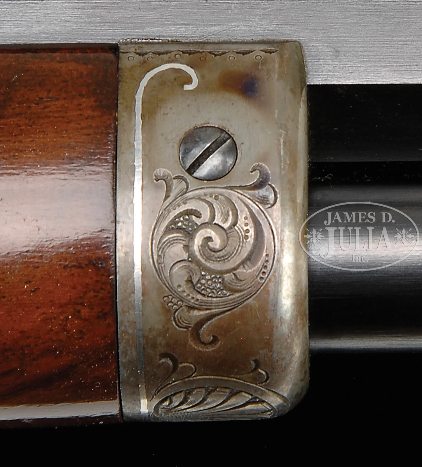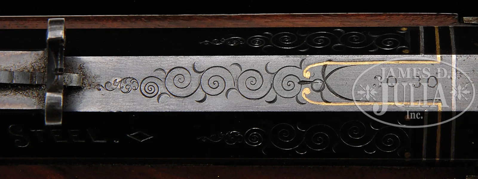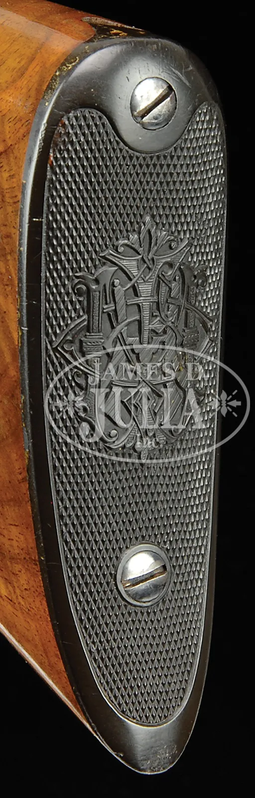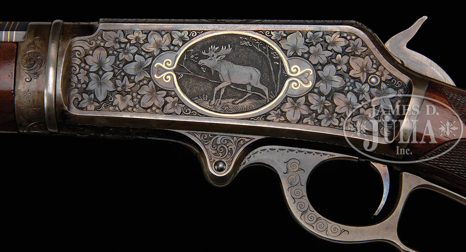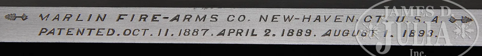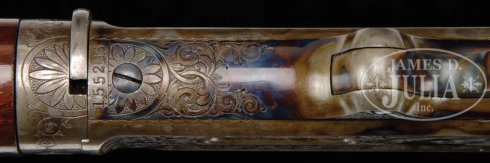 EXTREMELY RARE DELUXE CONRAD ULRICH ENGRAVED EXHIBITION QUALITY MARLIN MODEL 1893 TAKEDOWN LEVER ACTION RIFLE IN EXTREMELY FINE CONDITION WITH GOLD AND PLATINUM INLAY.SN 155286. Cal. 30-30. Spectacular Marlin with 26″ oct to rnd bbl, full magazine, takedown with German silver Rocky Mountain front sight and sporting rear sight. Mounted with highly figured, shell grain European walnut with #10 checkered & carved forearm and serpentine pistol grip stock with Marlin hard rubber buttplate. Carving consists of a maple leaf and special borders on each side of both stock & forearm. SN is on bottom of receiver, left side of top tang, under the wood and inside top tang channel of buttstock. Receiver is engraved in spectacular #10 style, by Conrad Ulrich. Engraving consists of the large oval vignette of a semi-relief bull moose in a very detailed forest scene with very fine stippled background. Right side is engraved in a slightly smaller vignette of an extreme highly detailed grizzly bear in a mountain scene. Both sides of receiver have nearly full coverage, semi-relief grape leaves with fine punch dot background. Both vignettes are outlined in inlaid gold wire. Bolt is engraved to match with a flower blossom in the center surrounded by gold wire inlay. Bottom & top of receiver are engraved in foliate arabesque patterns with grape leaves in the center on top side flats. Lever boss, top tang, takedown ring and forend cap are engraved to match. Sides of lever & the exposed flats of the bbl, over chamber area are engraved in light arabesque patterns. Chamber area of the bbl and around the caliber marking is inlaid with two platinum wire inlays and a gold wire inlay with three gold dots on each side. Forend cap has platinum wire inlay. This 1893 Marlin rifle with such extensive engraved coverage, special carved wood, gold and platinum inlay, and such high orig finish is exceedingly rare. PROVENANCE: Ex-Clarence Parks Collection; Ex-Wes Adams Collection. CONDITION: Extremely fine plus, all matching. Overall rifle retains virtually all of its crisp orig factory finish with bright orig blue and brilliant case colors, only slightly faded on takedown ring and outer faces of finger loop. Wood is sound with a few, very light handling & storage nicks & scratches and retains virtually all of its brilliant factory piano varnish finish. Mechanics are crisp, brilliant shiny bore, may be unfired. 50412-17 (50,000-100,000) – Lot 4177