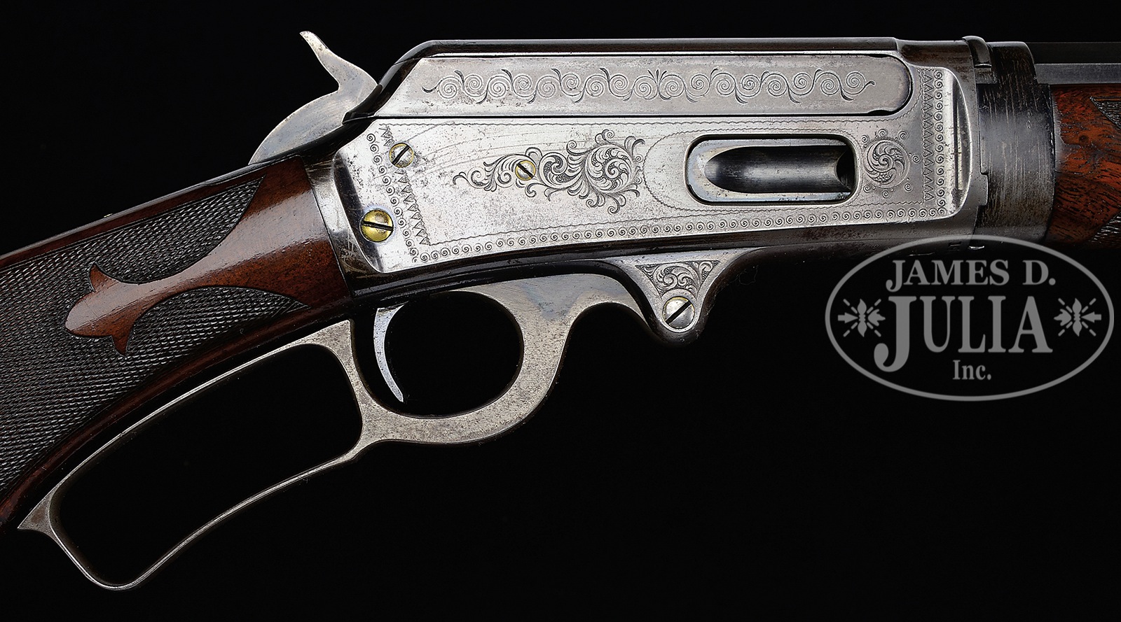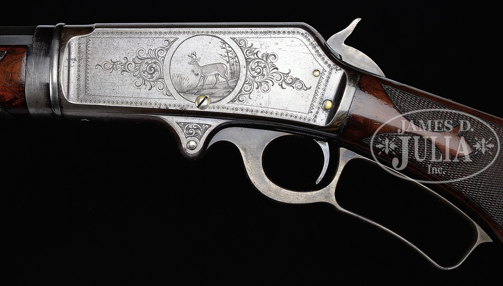 *RARE SPECIAL ORDER DELUXE ENGRAVED MARLIN MODEL 1893 TAKEDOWN LEVER ACTION RIFLE.SN 198053. Cal. 38-55. Fine deluxe 1893 with 26″ oct to rnd bbl, half magazine, takedown with German silver Rocky Mountain front sight and Marlin semi-buckhorn rear sight. Mounted with very highly figured, flame and shell grain American walnut with C-style checkered forearm and serpentine pistol grip stock with crescent steel buttplate. Left side of upper tang is stamped with matching SN which number is also found in top tang channel of buttstock and inside toe of buttplate. Rifle is engraved Grade 1 which consists of the large vignette of a standing whitetail buck in a forest scene on left side with light foliate arabesque patterns and multiple borders. Right side of receiver, top & bottom of receiver & lever boss are engraved in light foliate arabesque patterns. All screws are gold plated. Accompanied by a Marlin Firearms Co. letter which identifies this rifle in cal. 38-55 with 26″ half oct bbl, half magazine, takedown, #1 engraved, “extra special”, “C” checkered stock & pistol grip, shipped Oct. 12, 1903. PROVENANCE: Ex-Tom Seymour Collection; Ex-Wes Adams Collection. CONDITION: Very fine overall. Bbl retains 95-96% strong orig blue with light thinning on each side of muzzle, light sharp edge wear on octagonal section with some scattered, very light surface discoloration; magazine tube retains dark blue in sheltered areas, turning plum on outer radius; receiver retains about 80% thinning orig blue, turned silver on bottom at carry point; hammer retains strong case colors and the lever strong case colors on sides and in sheltered areas, turned silver on outer faces; buttplate is a mottled silver/gray patina; hammer & tang screws retain strong gold wash on the heads, other screws retain traces of gold being mostly worn to nickel under-finish; wood is sound with normal nicks, dings and scratches with one deep scratch by the right toe and a small bruise on the forearm, otherwise is sound & retains most of its orig piano varnish finish; forearm retains about 80% strong orig piano varnish finish showing wear on bottom rear and moderate wear on checkering. Mechanics are crisp, very bright shiny bore. 50412-18 (10,000-20,000) – Lot 4182 Click here to view provenance