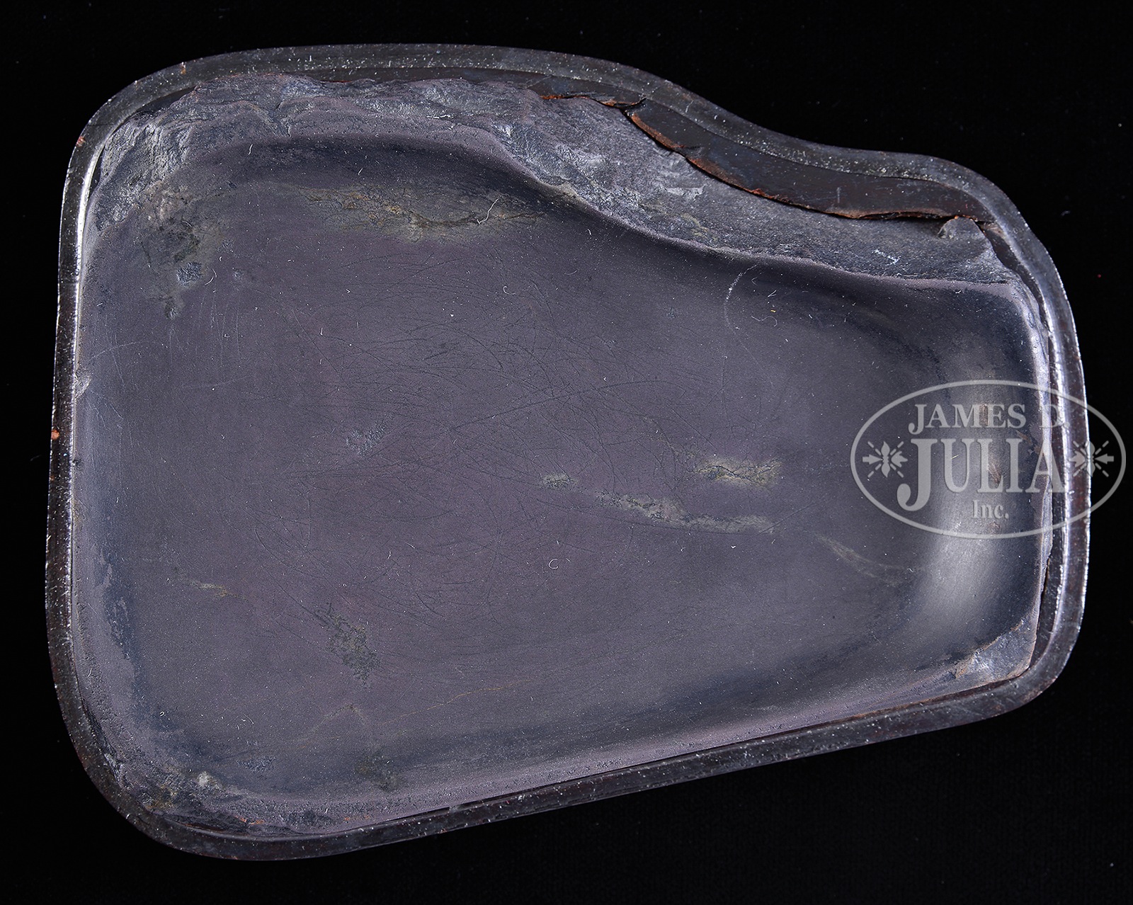 VERY FINE INKSTONE AND CASE.18th century, China. Tuan Stone carved as a section of pine; signed to one side. Fine shaped Tzu Tan case. SIZE: 5-1/2″ l x 4″ w. CONDITION: Very good. 7-74972 (8,000-10,000) – Lot 4187