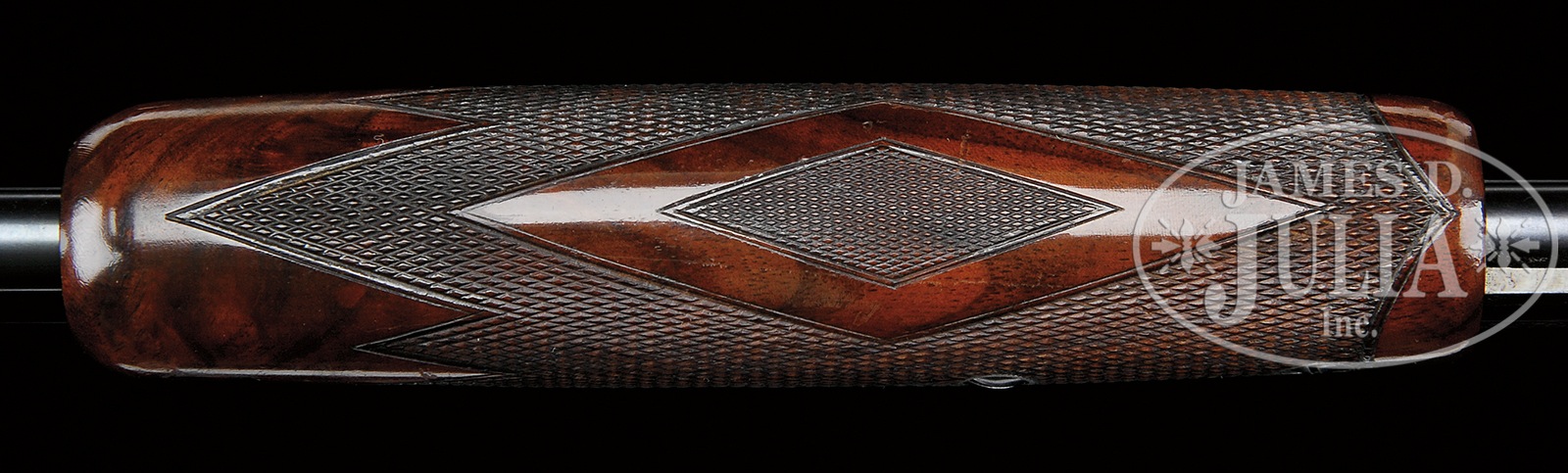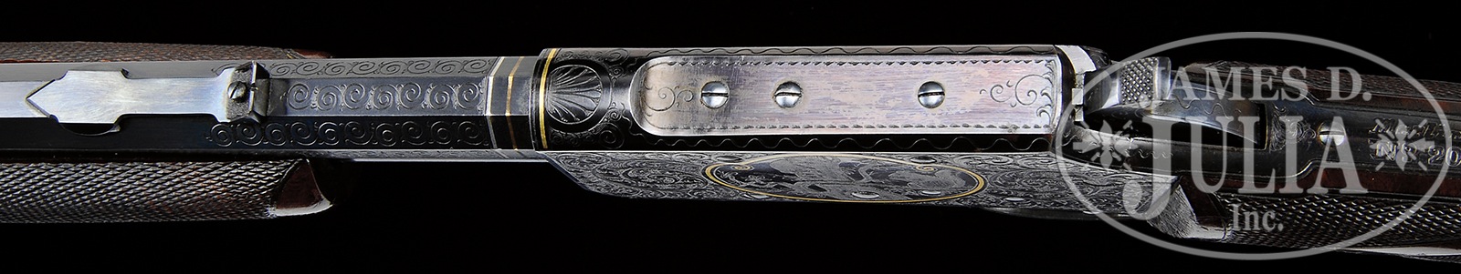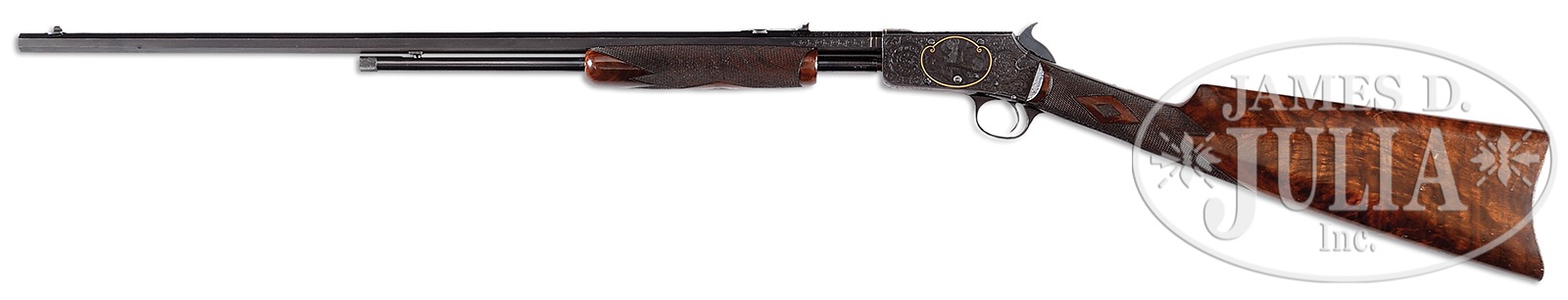 *EXTRAORDINARILY RARE #10 ENGRAVED & GOLD INLAID MARLIN MODEL 20 PUMP ACTION RIFLE FROM THE MAHON MARLIN ESTATE.SN 3939. Cal. 22. Extraordinary dainty deluxe little rifle with 23″ tapered oct bbl, ivory bead front sight and tiny elevation adjustable rear sight. Top flat of bbl has the usual Marlin address with arrows at each end and a half magazine. Mounted with exceptional, extra finish flame & shell grain American walnut with “F” style checkered round forearm & straight stock with semi-crescent steel buttplate. Receiver is engraved by Conrad Ulrich with the large vignette of two squirrels in a tree on left side surrounded by a fine incised line & gold wire borders and the oval vignette of two rabbits in a woodland scene with a tree in the background on the right side, also surrounded by a fine plain & gold wire borders. Sides of receiver are engraved in full coverage, intertwined, foliate arabesque patterns with fine punch dot background. Top edges of receiver have fine tapering snake patterns with a chipped pattern border around the top flat and arabesque patterns at each end. Front receiver ring is engraved with a shell pattern and inlaid with a narrow gold band. Top tang has light foliate arabesque patterns and a simple line border. Bottom edges of receiver are engraved in snake & dot patterns with foliate arabesque patterns on floorplate. Engraving extends about 2-1/4″ over the top five flats of the bbl with simple arabesque patterns. Chamber end of bbl, at the receiver, is inlaid with fine gold & platinum bands. Buttplate is engraved with foliate arabesque patterns around screw holes. The SN is on the left side of the top tang under the wood, inside the top tang channel of the butt stock and inside the buttplate. Page 444 of the book Marlin Firearms, Brophy, has a black & white picture of both sides of this rifle with the caption “…one of the two finest pump action .22 rifles produced by Marlin” and he also refers to it as “exceptionally rare”. This rifle appeared on the cover of the 28th Edition Blue Book of Gun Values, Fjestad, in 2007 and is the center rifle in the color photograph. Accompanied by a letter dated Sept. 19, 1996 over the signature of Edward Caporale wherein he states that he owns two Marlin rifles which had been the property of Mr. Mahon Marlin and upon his death were passed on to his only daughter, Janet. Mr. Caporale’s father-in-law, Dominic Griego, had worked for Mr. Marlin beginning in 1933 and continued working for Janet until her death in 1965. According to the letter Mr. Griego was given a number of items from Janet’s property, including three rifles, a shotgun and two 22s. Mr. Griego reportedly gave the two 22s to Mr. Caporale before he passed away in July 1996 at age 88. Also accompanied by a National Rifle Association “ONE OF TEN BEST ARMS” silver medal No. 381 awarded to this rifle at the NRA convention in 2000. Additionally accompanied by the blue medal box and the small plastic stand. PROVENANCE: Ex-Richard Rohal Estate Collection. Special Note: This item(s) contains plant or animal properties that may be covered by the Endangered Species Act (ESA). We have taken care to ensure that this item(s) meets the standard for sale under the ESA. However, certain states and other countries have laws that are more restrictive than the ESA. It is the bidder’s responsibility to ensure that it is lawful to purchase or transport this item(s) into their state, and to obtain the necessary import and export approvals. Delay or failure to obtain any such permit or approval does not relieve the buyer of paying for the item(s) and consummating the purchase. CONDITION: Extremely fine plus, all matching. Overall retains 98-99% crisp orig blue with only extremely faint sharp edge wear on the bbl and minor wear on the slide rod and right side of the hammer. Wood is sound with a few minor chips in the varnish and some minor crazing to the finish and overall retains about all of its fine orig factory piano varnish. Mechanics are crisp, bright shiny bore. 50425-1 (20,000-30,000) IVORY – Lot 4190 Click here to view provenance