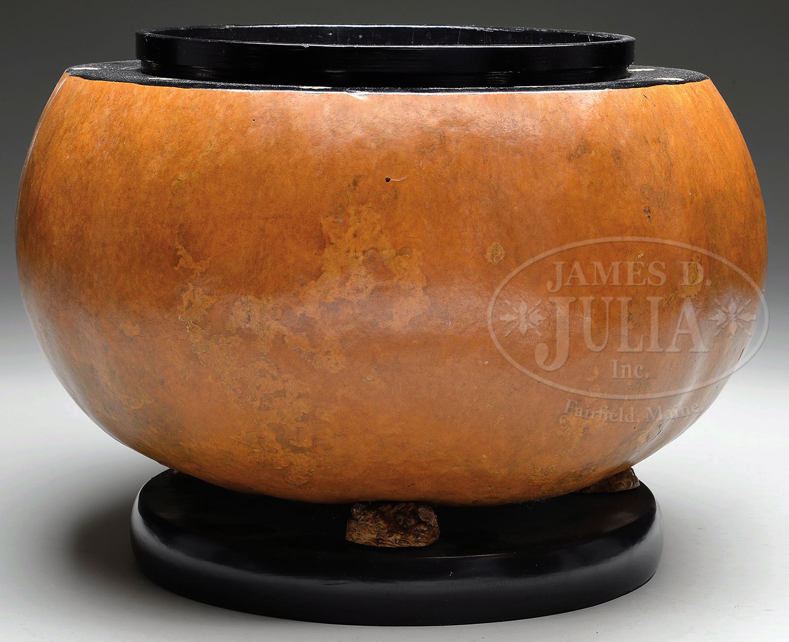 GOURD PLANTER WITH STAND. 19th century, Japan. Composed of gourds and lacquered wood. SIZE: 16″ dia x 11″ h. PROVENANCE: From a private New York State collection. CONDITION: Generally very good. 9-92546 (300-500)