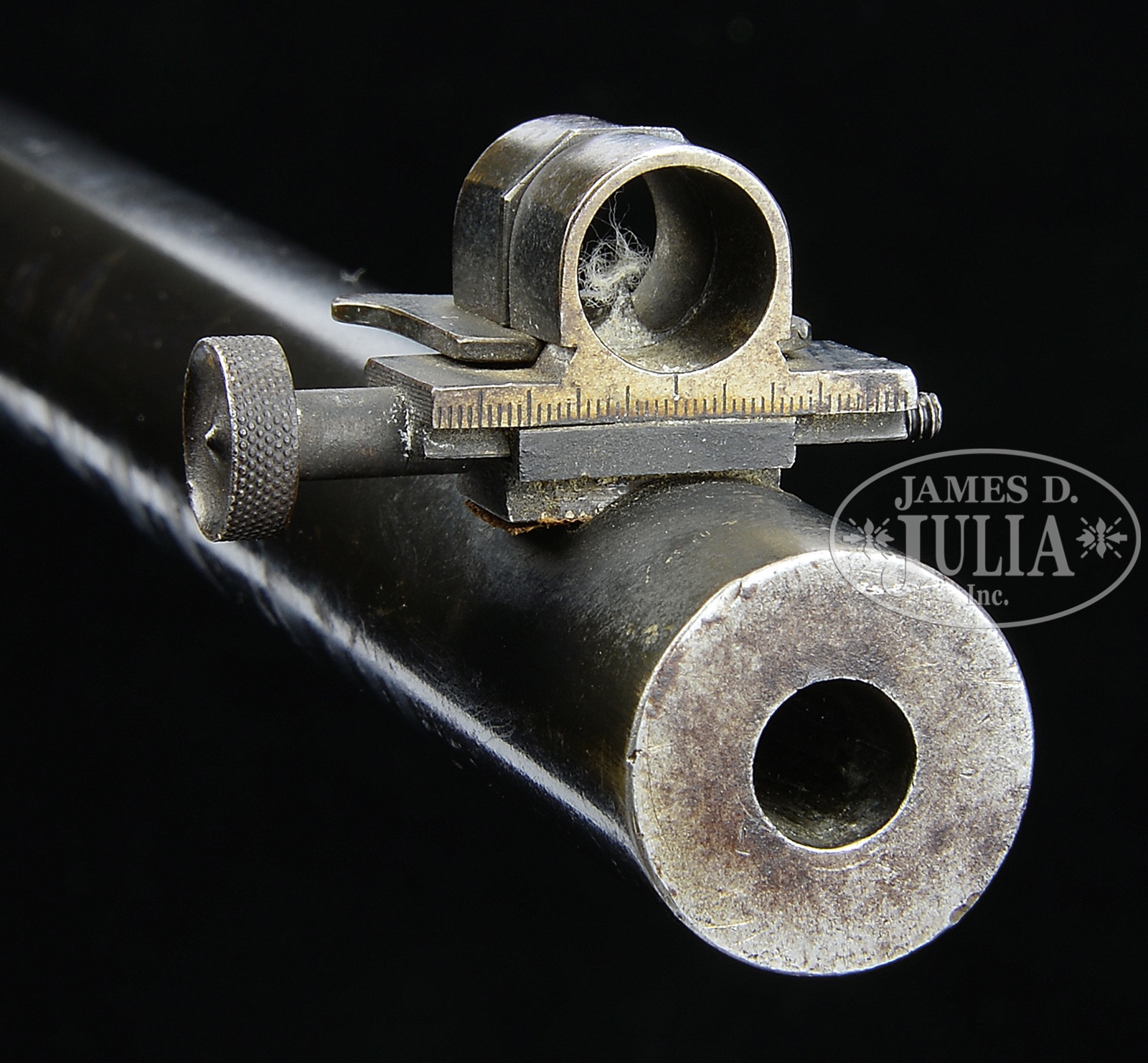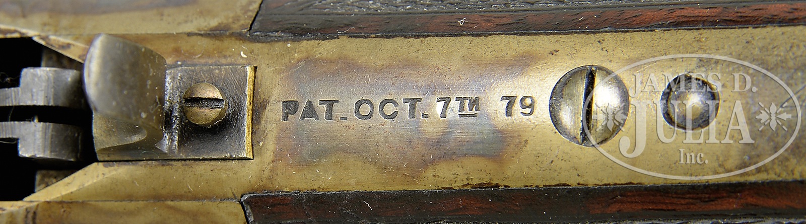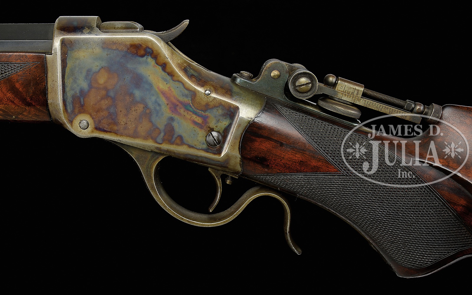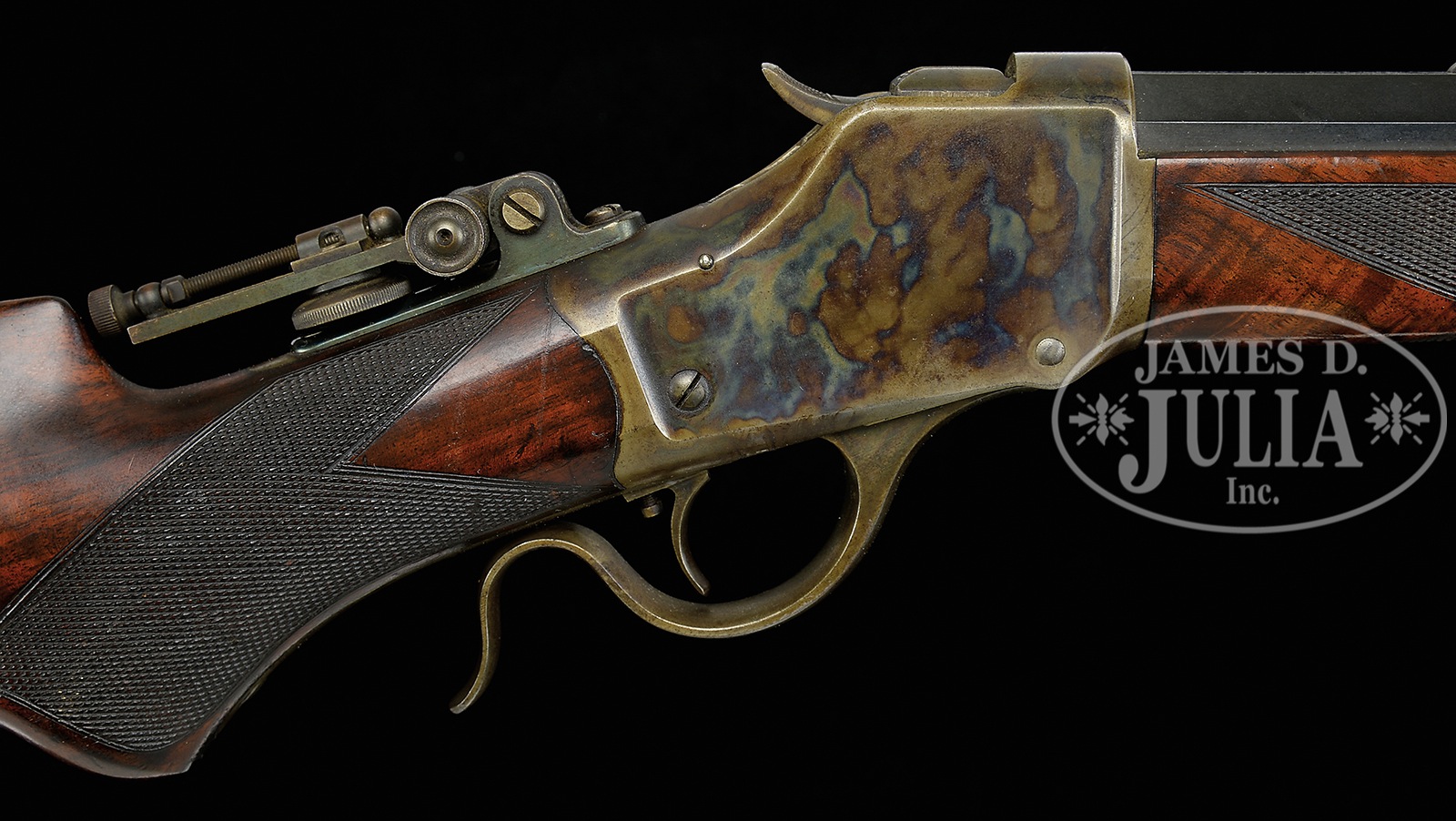 RARE DELUXE WINCHESTER HIGH WALL SINGLE SHOT TARGET RIFLE.SN 46225. Cal. 32-40. Very rare high wall with 30″ #3 weight oct to rnd bbl with windage adjustable globe front sight, semi-buckhorn rear sight & rare Soule windage adjustable mid-range Vernier tang sight with 3″ staff. Wood is very highly figured, center crotch, flame grain 3-4X American walnut with black insert, Schnable tip “H” style checkered forearm & black insert pistol grip stock with heavy cheek piece & brass Swiss buttplate that was originally nickel finish. Receiver has sgl-set trigger. Left side & lower tang, under the wood is marked with the assembly No. “8888”, “XXX” & “SBC”. Matching assembly No. is also found in top tang channel of buttstock & inside toe of buttplate. The entire rifle has a heavy coating of old dried oil or wax. This rifle was produced about 1890. PROVENANCE: Pierre Renaud Collection. CONDITION: Very fine to extremely fine. Bbl retains 96-97% strong bright orig blue with a small scrape on the bottom just forward of the forearm. Receiver retains virtually all of its orig case colors, slightly faded , brilliant elsewhere. Wood is sound with a series of small dings on the buttstock, otherwise retains most of its orig varnish with some slight staining around the wrist. Mechanics are fine, strong bright bore with light to moderate pitting. 50454-1 (7,500-11,500) – Lot 4195 Click here to view provenance