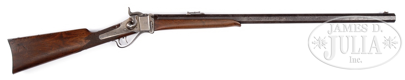 SCARCE SHARPS MODEL 1874 SINGLE SHOT SPORTING RIFLE.SN 156146. Cal. 46. Fine sporting rifle with 30″ heavy oct bbl, hooded Beach front sight and Lawrence patent, Sharps ladder rear sight. Top flat of bbl is marked with the Bridgeport address and “Old Reliable” cartouche. Cal. marking is on top flat “CALIBRE 46”. Trigger plate has dbl set triggers. Mounted with nicely figured, slab-sawed, checkered American walnut with semi-schnable forearm and straight stock with steel Sharps buttplate. SN was observed on top rear of receiver with matching number on bottom of trigger plate and lock. Forearm and bbl have similar patina and wear, but have different set of numbers. According to Sharps Firearms, Frank Sellers, there were about 3,881 Model 1874 sporting rifles produced at Bridgeport in the period 1871 to 1880. Accompanied by a Sharps Company records letter which identifies this rifle in “order book No. 2 as a Model 1874 sporting rifle invoiced at Bridgeport on April 22, 1876 to E. E. Eaton, gun and sporting goods dealer, Chicago, IL. It is described as being 44 Cal. with 30″ oct bbl, dbl triggers, open sights and oil finished stocks, but the weight was not listed, but the price of $42 less $20 plus 10% suggest that it was a rifle of standard weight i.e., up to 12-lbs.” The weight of this particular gun is 13-lbs. Based on this information, bbl was upgraded along with forestock at some point in its usage. CONDITION: Very good to fine overall. Markings all clear and discernible. Bbl and forearm SNd 34974. Gun otherwise appears orig and matching. Bbl overall is mottled dark grey/brown, remainder of metal is silver/grey with scattered staining and light pitting. Stocks have hand worn patina with small cosmetic dents and dings. Rear tang screw appears replaced, retaining most of its fire blue. 50506-64 JS (6,000-10,000) – Lot 4201 Click here to view provenance