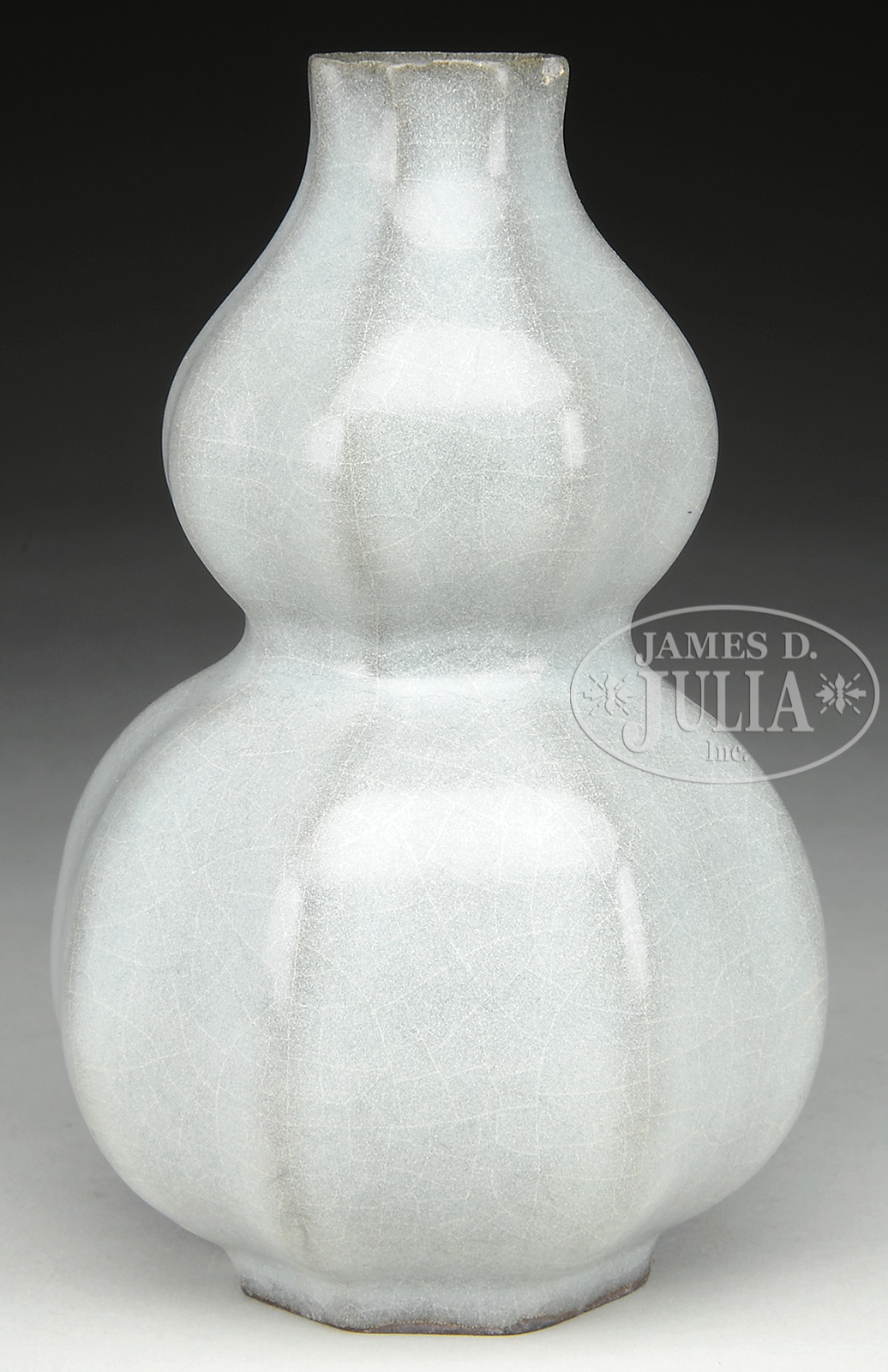 KUAN WARE VASE.18th century possibly earlier, China. Hexagonal double gourd form with a thick gray glaze. Labeled “S. Hayashi 1963 Kyoto”. SIZE: 5-1/2″ h. CONDITION: Chips to the mouth. Otherwise good. 9-91229 (600-800) – Lot 4203