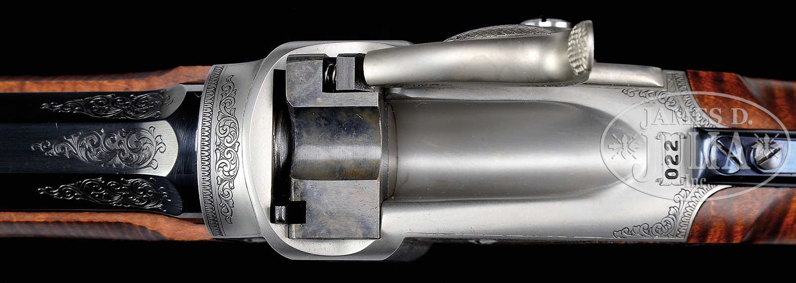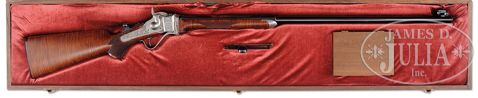 *OUTSTANDING SHILOH SHARPS MONTANA CENTENNIAL RIFLE WITH CASE.SN 022. Cal. 45-70. 32″ part oct bbl, windage adjustable globe front sight with spirit level, no rear seat, 5″ tang-mounted Vernier sight. Bbl marked “Old Reliable”, “Shiloh Rifle Mfg. Co.” & “Calibre 45 / 2-1/10” on top flat. Right flat is engraved “Montana 1889 / 1989 Centennial” with gold fill; 3 top flats of bbl at chamber end have 1″ wedge of scroll engraving. Engraved 74 Action has grizzly bear in mountain scene with accenting foliate scroll, multi-point border & “Shiloh Rifle Mfg. Co. / Big Timber, Montana” over a checkerboard pattern on left side; right side is engraved with similar scroll & a buffalo, while lock is engraved with scroll & a bull elk. Both sides of hammer have accenting scroll engraving as well as loop of lever. Mounted with highly figured tiger-stripe maple, checkered forend with pewter forend cap, checkered pistol grip & checkered hard rubber butt plate. Accompanied by a walnut display case. CONDITION: Extremely fine. Gun appears as-new since manufactured. Bbl retains virtually all of its fine factory blue. Gray receiver is clean, crisp & sharp. Stock is near mint, minor chip on grip at right side & retains virtually all of its fine factory finish. Forend is sound with sharp checkering, a couple of minor handling marks & retains virtually all of its fine factory finish. Mechanics are crisp with a bright new shiny bore. Case is equally fine with brass plaque reading “Shiloh Rifle Mfg. Co. / Montana Centennial 1889 – 1989” & has only a few minor scratches. 50819-25 JSL (7,000-10,000) – Lot 4203