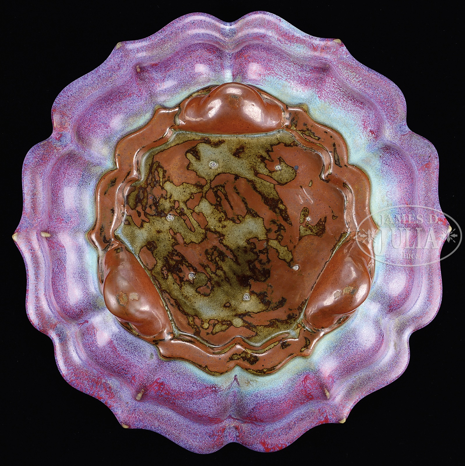 STONEWARE PLANTER.Ming Period, China. Chun ware. Foliate lobated form with jui-i feet. Deep lavender glaze with earthworm marks. Turquoise interior. Brown slip glazed foot. Chinese number 2 on the base. SIZE: 9″ d. CONDITION: Very good. 7-75150 (80,000-120,000) – Lot 4205