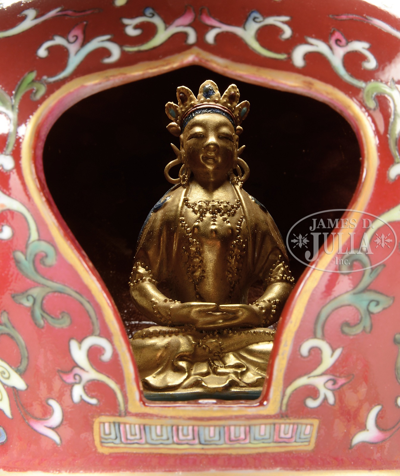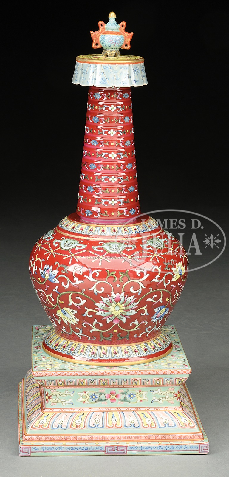Please note: This lot was accidentally misidentified. This is not part of the Diplomatic Collection. RARE RUBY-RED GROUND FAMILLE ROSE BUDDHIST STUPA.First half of the 20th Century, China. The shrine is superbly modeled and enameled against a brilliant ruby- red ground with stylized lotus blooms borne on multi-hued vines issuing smaller flowers below monster masks linked by pendant beaded chains. The stupa is supported on a square waisted base decorated with bands of lappets and floral scrolls on a teal ground. Includes rectangular hard-wood box. SIZE: 16-1/2″ h x 7-1/2″ w. CONDITION: Good, neck separated from base but intact. 49431-2 (12,000-18,000) – Lot 4214