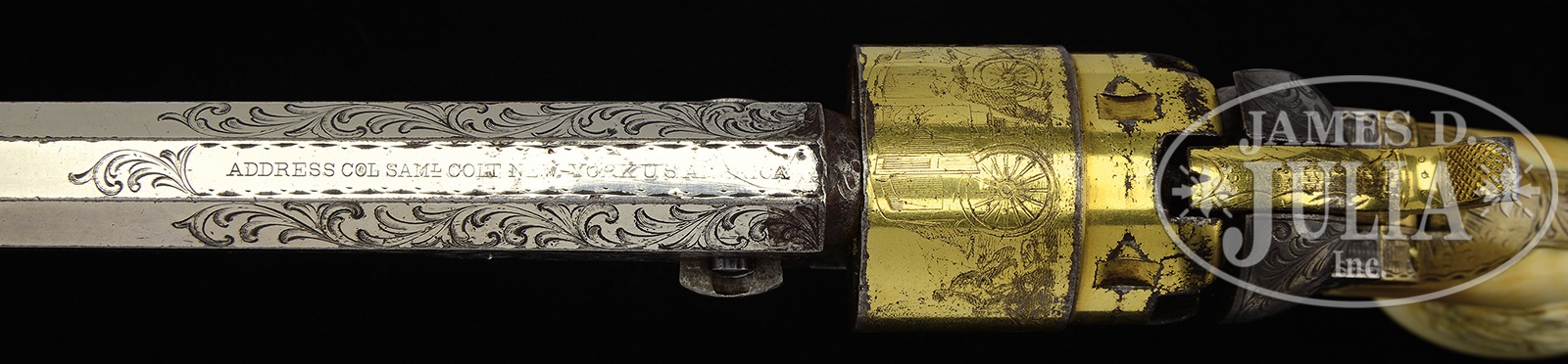 PAIR OF CIVIL WAR CASED CONSECUTIVE NUMBERED COLT MODEL 1862 POCKET NAVY REVOLVERS, GOLD AND SILVER FACTORY ENGRAVED WITH FABULOUS CARVED PATRIOTIC IVORY GRIPS.SN 5544/5543. Cal. 36. This incredible pair of exhibition revolvers made at the height of the Civil War in late 1862 have rarely seen gold plated and silver plated contrasting elements and finely relief carved grips with Lady Liberty and Columbia. Both guns are all matching and orig. Most likely this set of guns were made for a retailer to display in their store as carved ivory, gold and silver cased pairs of revolvers are virtually unknown. This exact pair of guns, once in the collection of Buddy Hackett, is pictured on pg 179 of Colt Engraving, R. L. Wilson, 1982. Guns are cased in an orig Colt casing with red lining, sgl sided eagle and stars “COLTS PATENT” flask, blued “COLTS PATENT” 2-cavity mold with sprue cutter, l-shaped combination tool and two tins of Eley caps. Guns are in the most desirable 6-1/2″ bbl length and the incredibly rare casing that accompanies would be impossible to duplicate. PROVENANCE: Ex-Buddy Hackett Collection; Pictured on pg 179 “Colt Engraving” by R. L. Wilson; The Esteemed Collection of Steve Ardia. Special Note: This item(s) contains plant or animal properties that may be covered by the Endangered Species Act (ESA). We have taken care to ensure that this item(s) meets the standard for sale under the ESA. However, certain states and other countries have laws that are more restrictive than the ESA. It is the bidder’s responsibility to ensure that it is lawful to purchase or transport this item(s) into their state, and to obtain the necessary import and export approvals. Delay or failure to obtain any such permit or approval does not relieve the buyer of paying for the item(s) and consummating the purchase. CONDITION: Very fine overall. All matching SNs found on both pistols, including wedges and grips. SNs have an additional “I.E.” on bbl, frame, trigger guard and backstrap denoting factory engraving and ivory. SN 5543 retains over 90% silver on bbl with freckling and lifting to an overall non-even surface with staining and rust. Frame has similar patina to bbl with same areas of pitting. Trigger guard and backstrap retain about 80% thinning silver plate. Loading arm retains about 70% orig gold plate with balance silver/grey. Cylinder and hammer retain 60% orig gold with balance dark patina with pitting, cylinder retains 60-70% cylinder stagecoach holdup scene. SN 5544 exhibits about 90% silver plate on bbl and is overall smooth with some pitting toward housing, turning plum/brown. Frame retains about 90% silver color as frames were polished and not plated with a matching silver patina to bbl. Trigger guard and backstrap retain traces of finish in protected areas. Cylinder, hammer and loading arm retain much of their orig gold plate, though thinning on loading arm on the right side with 80-90% visible stagecoach holdup cylinder scene. Screws on this gun retain much of their orig fire blue. “Certifiable antique elephant ivory” grips exhibit ivory patina, well fit with chip on right side on SN 5543, and chip at rear toe on left side on SN 5544. Both guns are mechanically sound with discernible rifling in bores, both with light pitting. Accompanying mahogany veneered case is sound and solid with several chip reductions on lid, a blank silver escutcheon. Lining soiled, faded and worn, especially where guns and accessories make contact. Accompanying mold is properly marked “36P” and has numerous small nicks and dings where used as hammer and retains about 90% dark blued finish. L-shaped tool is equally fine. Flask is fine also, retaining about 90% orig varnish; cap tins are also fine. 49631-29 JS (25,000-40,000) IVORY – Lot 4215