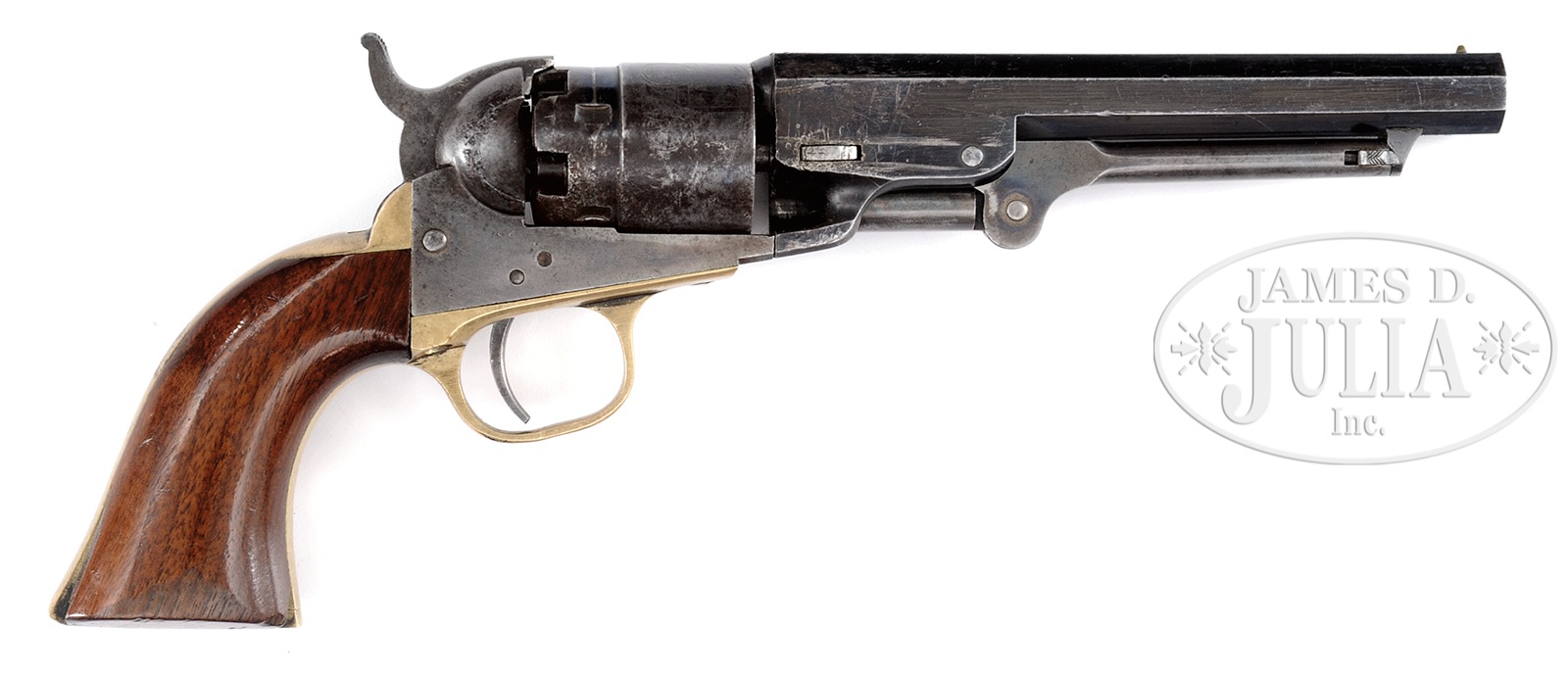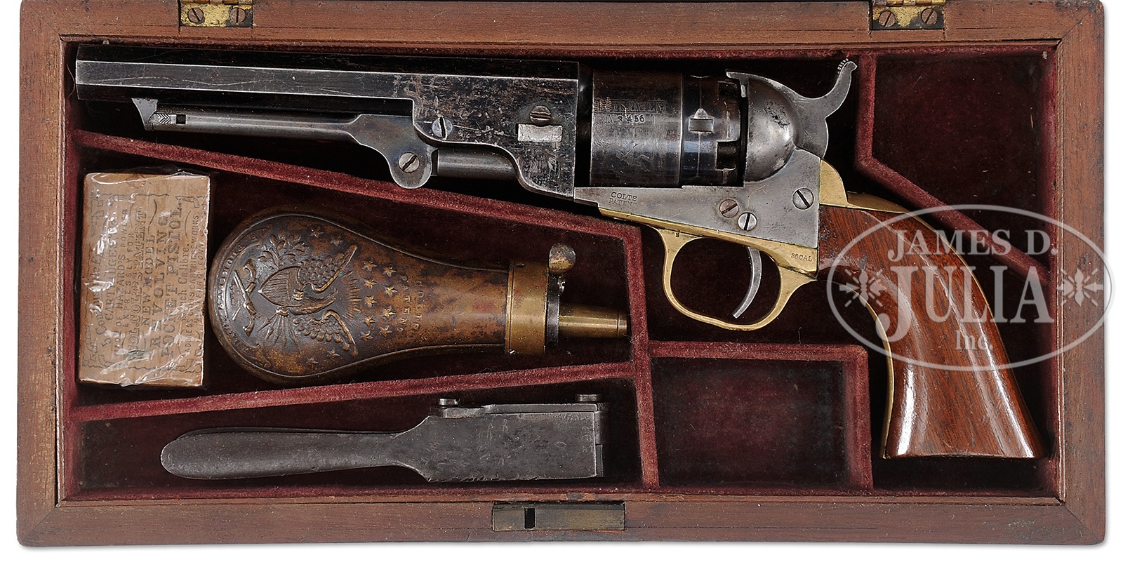 VERY FINE CASED 5-1/2″ COLT MODEL 1862 POCKET NAVY PERCUSSION REVOLVER.SN 3456. Cal. 36. Blue & color case hardened with 5-1/2″ oct bbl, brass pin front sight and 1-line New-York U.S. America address. Left side of frame is marked “COLTS PATENT” and left shoulder of trigger guard is stamped “36 CAL”. The silver plated brass trigger guard & back strap contain a fine varnished 1-pc walnut grip with SN inked in buttstrap channel. Cylinder is usual 5-shots with rebated diameter and has the stagecoach holdup scene roll marking. Accompanied by an orig Colt mahogany casing with red velvet lining compartmented in bottom for the revolver; a sgl sided eagle & stars pocket sized flask marked “COLTS PATENT”; a blued steel 2-cavity “COLTS PATENT” mold marked on right side “36P”; and a pack of Colt New Model Revolving Pocket Pistol Cartridges. This fine example was made first year of production in 1861 at the height of Civil War fervor and survived the war in very fine condition. PROVENANCE: The Esteemed Collection of Steve Ardia. CONDITION: Very fine overall, all matching and orig with exception of forward frame screw which is restored. Bbl retains about 90% orig factory blue finish with numerous small scratches and scuffs and other small blemishes especially around wedge slot. Frame, loading assembly and hammer retain traces of case color, especially on rammer pivot with balance silver/grey with areas of pitting on recoil shields. Cylinder retains about 20% orig blue with strong, discernible rolled stagecoach hold-up scene one side has pitting extending to frame which obliterates part of stagecoach scene. There are a few impressed tool marks over part of Colt’s Patent on cylinder. A light cylinder drag line is present, safety pins are all smashed flat. Trigger guard and backstrap retain tiny traces of silver in protected areas, overall yellow brass patina, several dents in buttstrap where used as hammer. Grip is sound and well fit, retaining most of its factory varnish with minor blemishes on sides and two chips on either right toe where chipped when probably used hammering many years ago as chipped areas have old patina. Mechanics are crisp, well discerned bore. Mahogany casing is sound and solid, well fit with scattered small blemishes. Interior is very good overall with soiling and wear, especially around where front sight, hammer spur and cylinder rubbed through cloth. Accompanying Colt’s Patent flask retains about 20% varnish with several small dents. Mold retains traces of finish with numerous small blemishes and pitting. Cartridge pack is fine with excellent label. 49631-37 JS (8,000-12,000) – Lot 4217