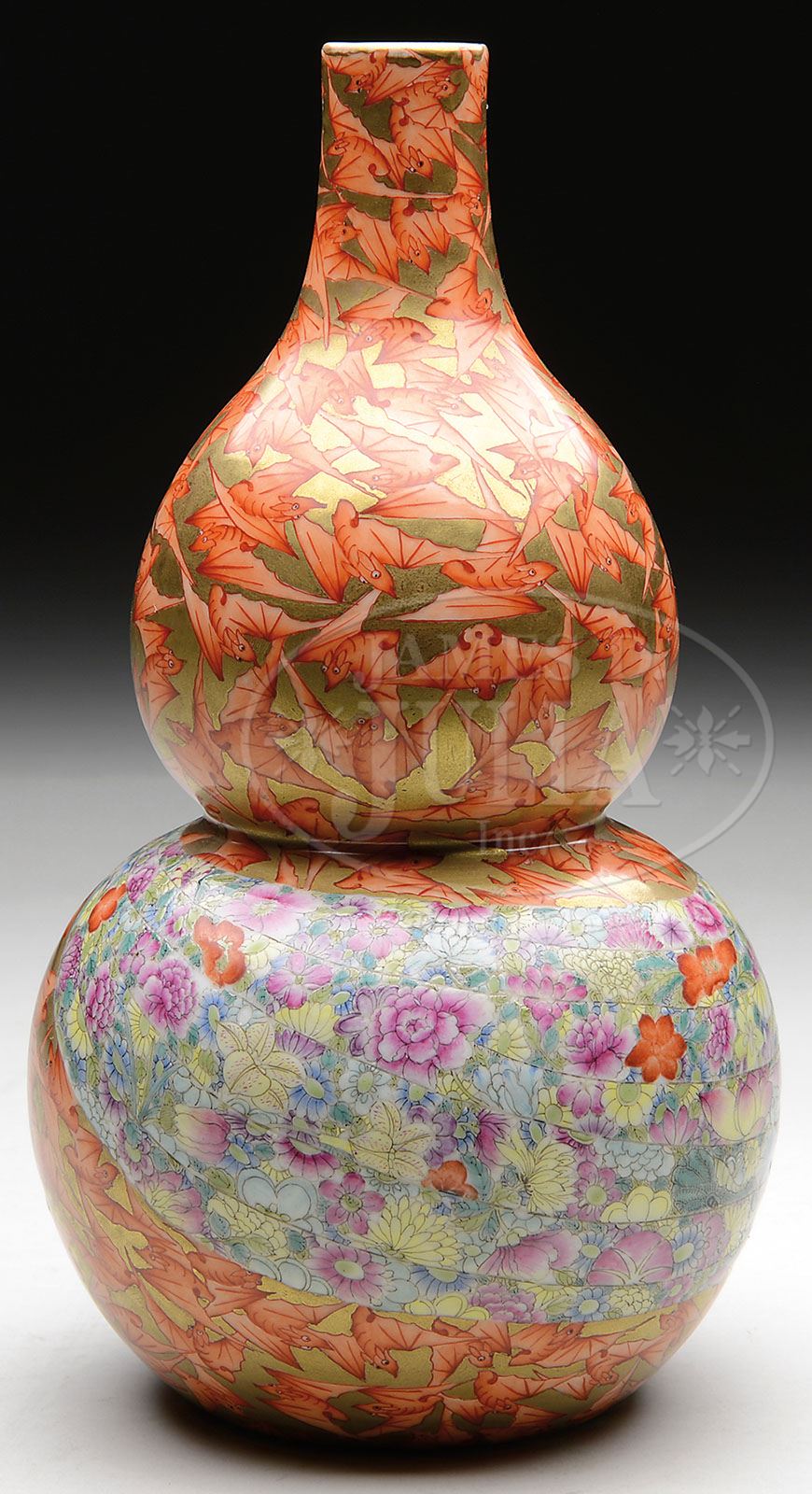 DOUBLE GOURD PORCELAIN VASE. Early 20th century, China. Decoration of bats in iron red on a gilt ground with a Famille Rose enamel bowl of mille-fleur. 4 character mark on base. SIZE: 9-3/4″ h. CONDITION: Very good. 7-74159 (200-300)