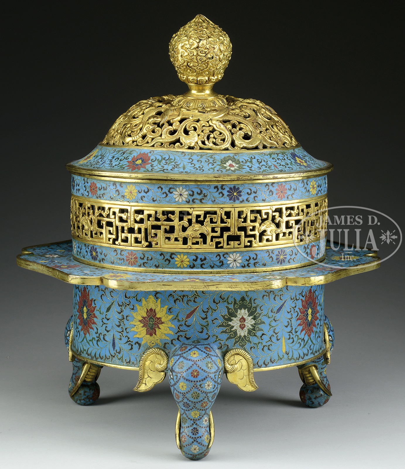 Please note: This lot was accidentally misidentified. This is not part of the Diplomatic Collection. CLOISONNE ENAMEL CENSER AND COVER.China. The censer is composed of three parts, including a base, mid section, and cover. The base supported by three elephant mask legs with gilt ears and ivory, the cylindrical body enameled with roundels of flowers amidst vines, leaves, and tendrils, below a floriform extruding rim with similar motif. The mid section of cylindrical form, with gilt band of stylized dragons amidst clouds in the center, between bands of flowers and vines. The cover is of domed form, the center gilt with dragons flying amidst clouds and ocean waves, with a gilt beaded finial depicting ruyi clouds on top. Bottom bears four apocryphal character “”XUANDE”” mark. SIZE: 17-3/4″ h x 16-1/8″ w. CONDITION: Overall wear to gilding, cover slightly compressed. 49431-6 (8,000-12,000) – Lot 4225