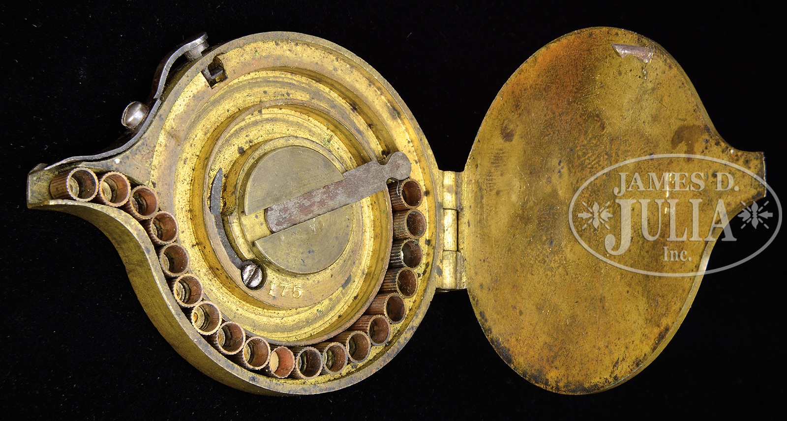 VERY FINE AND RARE COLT PATERSON PATENT ARMS LARGE SIZE CAPPER FOR MODEL 1839 RIFLES AND CARBINES.SN 175. Assembly number 175. All brass capper, approximately 2-1/4″ diameter with the RAMPANT COLT and a Paterson ring lever carbine on the lid over crossed Paterson pistols. Capper is of later design with lid locking post to the left, lock is an extension of nozzle spring. Both lid & body are numbered “175” and it is complete with lanyard ring. Few of these cappers survive today as they were also used for other firearms and being of small size were easily misplaced. This example is in beautiful condition with high relief and strong gilt finish retained in protected areas internally. CONDITION: Very fine. Complete and functional with small scratches on reverse. Decorated lid shows excellent detail and stippling, dark mustard colored patina with light wear to highest features. 50412-94 JS (3,000-5,000) – Lot 4225