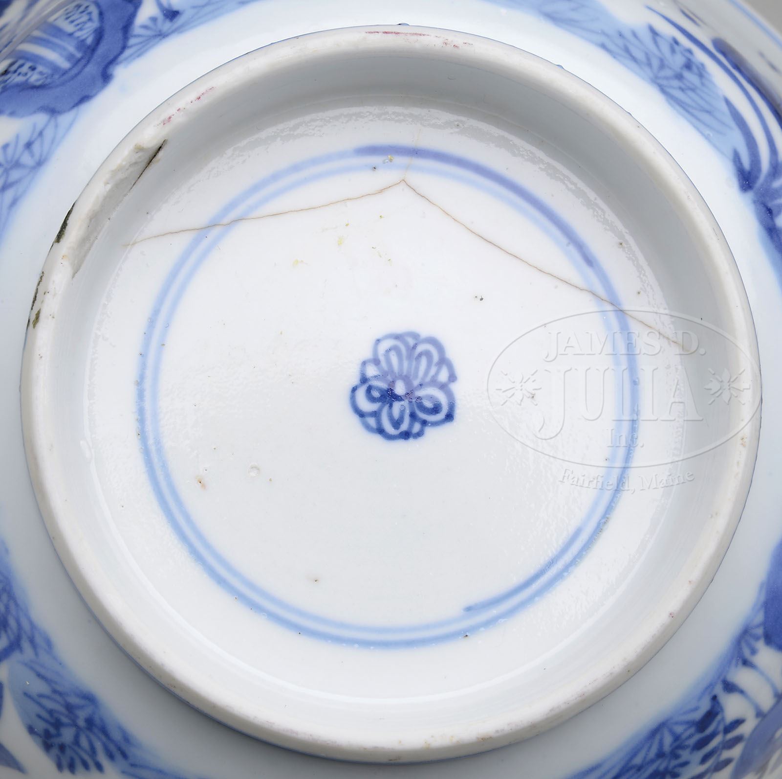 K’ANG HSI BLUE AND WHITE BOWL. K’ang Hsi period (1662-1722), China. Bowl with an underglazed blue decoration of butterflies and flowers. Flower mark on the base. SIZE: 7-3/4″ dia x 4″ h. CONDITION: Rim frits and an age crack to the base. 7-74300 (300-500)