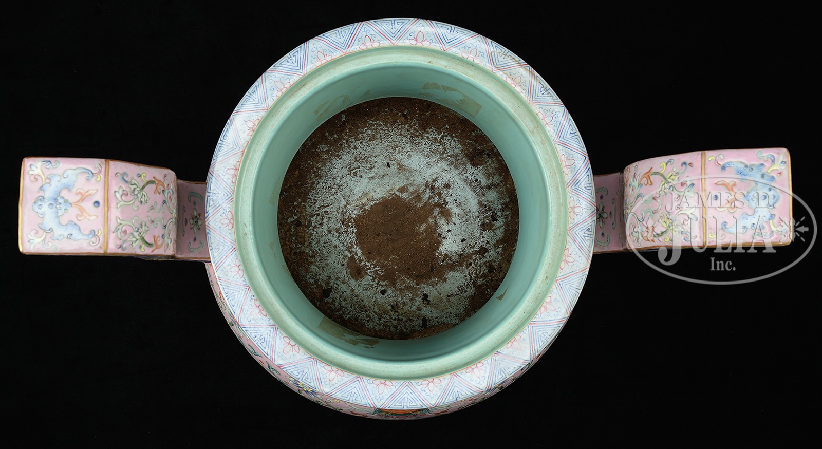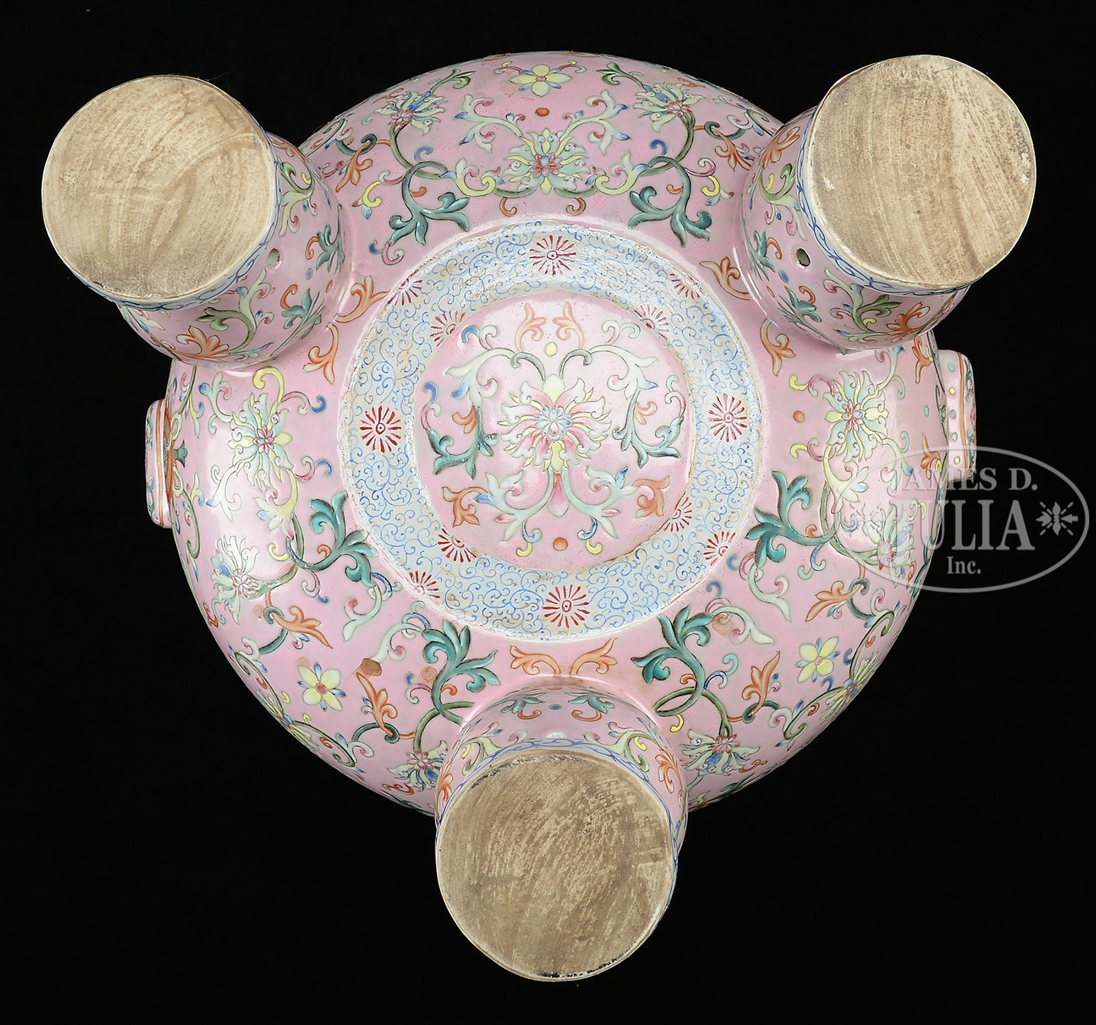 LARGE FAMILLE ROSE TRIPOD CENSER WITH RAISED HANDLES.19th C, Qing Dynasty period, China. The large tripod censer painted in famille rose against pink ground with flowers, vines, and other auspicious items, the globular body supported by three beast legs, two uprising handles extends from body to above the rim, decorated with ke-fret patterns, the interior in teal ground. Includes original and elaborately carved wooden cover, fitted on top. Six-character Jiaqing mark. SIZE: 18″ h x 17-5/8″ w. PROVENANCE: Estate Collection from a renowned Taiwanese Diplomatic Family – Cai Wanjun (? – 2011), Xu Shaochang (1913–1999), and Ye Gongchao (1904 – 1981). CONDITION: Very good, dirty. 49431-15 (30,000-50,000) – Lot 4231