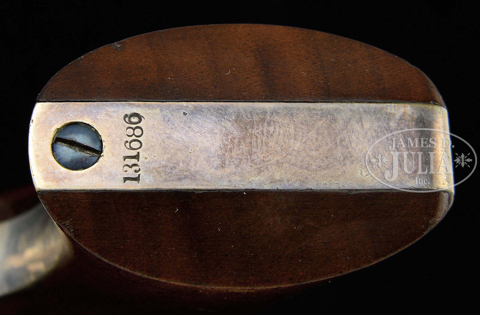 EXCEPTIONAL CASED COLT MODEL 1849 POCKET PERCUSSION REVOLVER.SN 131686. Cal. 31. Blue & color case hardened with 4″ oct bbl, brass pin front sight and standard 2-line New York address with brackets. Left side of frame is marked with a small “COLTS PATENT” and it has 5-shot cylinder with stagecoach holdup scene roll marking. Silver plated brass trigger guard & backstrap contain a varnished 1-pc walnut grip with last four digits of matching SN in backstrap channel. Accompanied by a purple velvet lined mahogany casing, partitioned in the bottom for the revolver, a brass 2-cavity “COLT’S PATENT” mold, a double sided brass eagle & stars flask in like new condition, an L-shaped nipple wrench in also like new condition. An ELEY cap tin marked “COLT PATENT BELT AND POCKET PISTOLS” on its original label. This revolver was produced in 1857. These small revolvers were extremely popular from their first production until well into the 1870s when they were supplanted by the advent of the self-contained cartridge revolver. They saw extensive use by frontier people of all walks of life and are rarely found today with such near new condition and almost never with an orig case. Also included is an original Colt loading instructions. PROVENANCE: Ex-Bobby Smith Collection. CONDITION: Excellent overall. All matching including wedge & grip. Bbl retains 98-99% strong orig blue. Loading arm, frame and hammer retain most of their bright case colors on the sides with balance muted to a silver or silver/gray. Cyl retains over 90% orig bright blue, with losses and light pitting on 3 of the 4 extensions at rear between nipples. All safety pins are crisp and functional. Almost 100% crisp rolled stagecoach holdup scene is easily discerned; trigger guard & backstrap retain virtually all of their strong orig silver plate. Grips are sound and solid, well-fit retaining almost all their original bright varnish with slight edge wear. Mechanics are crisp, very bright shiny bore. Case is sound with a few light handling & storage nicks & scratches retaining most of its original bright varnish. Lower right joint to case is apart but still sound. Interior retains good purple color with light soiling, wear and light cosmetic damage where gun makes contact. Mold is crisp with small dents on one side, appears unused; flask retains virtually all of its original varnish with bright blue spring; L-shaped nipple wrench/screwdriver retains most of its original bright blue with some losses and scratches. Cap tin retains original caps, japanned surface and an excellent label with easily discerned text. Retained original key, operates lock well. 50675-1 JS (7,500-12,500) – Lot 4232 Click here to view provenance