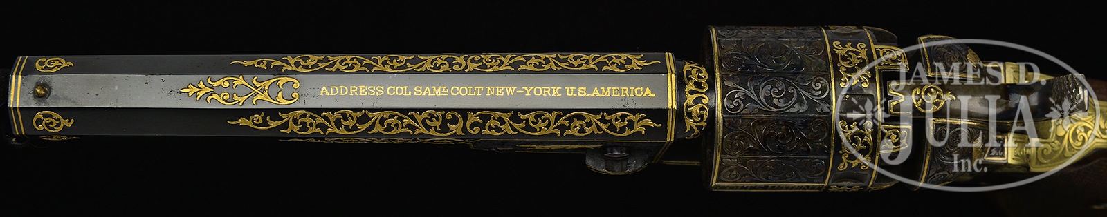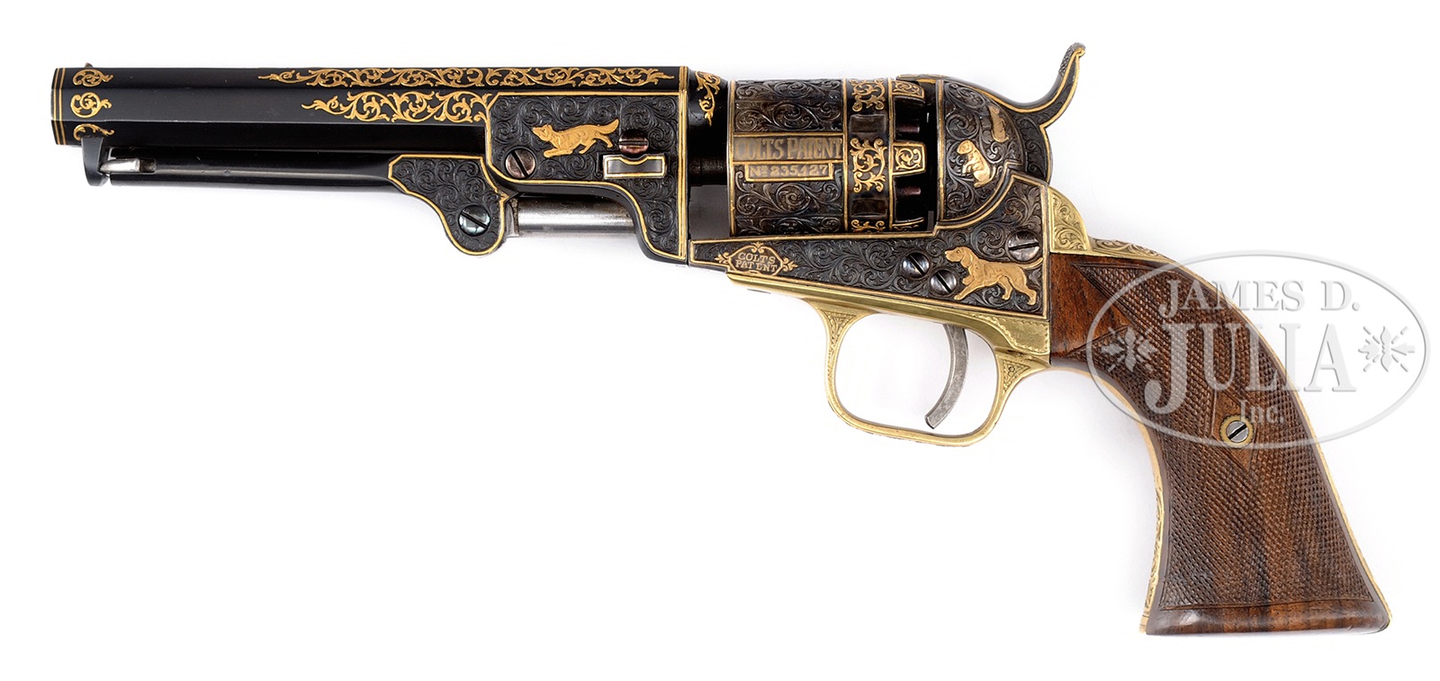 EXTRAORDINARILY GOLD ENGRAVED COLT MODEL 1849 POCKET PERCUSSION REVOLVER.SN 235127. Cal. 31. Well known firearms engraver Edward C. Prudhomme (1911-1990)is thought to have engraved this 1864 manufactured vintage Colt Model Pocket revolver for Dixie Gun Works in 1970. Bbl has extensive leaf, vine and gold wire inlays, gold address, in addition to gold foxes on each side of the bbl lug. The loading lever is also engraved with gold wire border surrounding relief scrolls. Frame and recoil shields are deeply engraved with two hunting dogs and three ground hogs all surrounded by relief engraved foliate arabesque patterns with fine stippled background. Both sides of frame also have gold “COLT’S PATENT” logos and decorated lozenge. The recoil shields are deep relief engraved with foliate and vine patterns and have gold wire borders. Cylinder scene and all its markings have been re-engraved with gold wire trip, gold wire, patent and SN along with arabesque panels between each stop and each nipple recess. Hammer is completely relief engraved with gold wire frame on both sides and engraved on the top with gold arabesque flourish. The brass trigger guard and backstrap are deep relief engraved with arabesque patterns. No engravers signature is found, grip frame is stamped “DIXIE GUN WORKS 1970”. Custom 2-pc grips are nicely checkered. CONDITION: Extremely fine retaining virtually all orig finish as customized. Mechanically crisp with with defined rifling in a pitted bore. Custom case accompanies. 50382-2 TEP (6,000-10,000) – Lot 4233