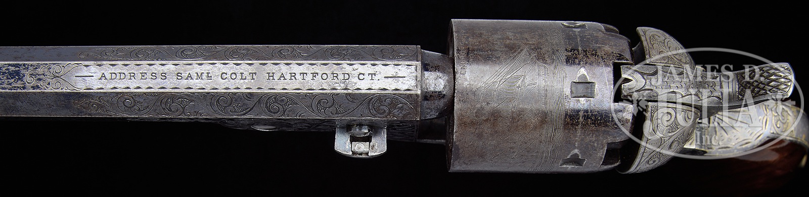 RARE ENGRAVED COLT MODEL 1851 NAVY PERCUSSION REVOLVER.SN 98258. Cal. 36. Fourth model, blue & color case hardened with 7-1/2″ oct bbl, scarce dovetailed front sight with German silver blade & 1-line Hartford address. Left side of frame is engraved “COLTS PATENT” in a pillow shape. Cyl is unfluted with Ormsby Naval Battle scene roll marking. The silver-plated large brass trigger guard & backstrap contain a very nicely figured varnished burl walnut 1-pc walnut grip that has last 4 digits of matching SN in backstrap channel. Revolver is very nicely engraved by Gustave Young with full coverage foliate arabesque patterns on the frame with a couple of scrolls terminating as flower blossoms. Deluxe engraving patterns extend over the bbl lug & top side flats of the bbl with a couple of scrolls terminating in flower blossoms & another with a most unusual Indian’s head wearing a feather bonnet. Matching scrolls are also on the rammer pivot. Hammer is engraved with a wolf’s head on each side of the nose, fish scales on the top edge & sides of hammer spur and matching foliate arabesque patterns on the shank. Top of the backstrap is engraved in Mr. Young’s typical fan pattern with 1/4 blossoms on sides of the shoulders and foliate arabesque patterns on the backstrap, buttstrap & trigger guard. All of the SNs on bottom of the revolver are accompanied by a small punched dot which would signify to the factory workmen to add extra polish for engraving. Accompanied by a rare Colt Factory letter which identifies this revolver in Cal 36 with 7-/12″ bbl, blue finish, wood stocks, factory engraved & shipped to the Colt New York office on February 11, 1861 in a 10-gun shipment. Given the time frame of this shipment it seems likely that this may have been a Civil War unit order or possibly for presentation to Civil War personnel by citizens of New York. Regardless this revolver was shipped to a major hub of Civil War supply activity and almost certainly would have seen service throughout the Civil War. Such arms are rarely found with high orig finish. Pg 139 of The Colt Engraving Book, Volume 1, and pg 87 of Colt Engraving, both by Wilson, pictures the left side of the bbl lug of this revolver, illustrating the Indian head motif. Although it is not identified by SN in the publication, there are identifying marks that certify that it is the same revolver. The pg 87 caption credits this revolver to the S.P. Stevens Collection. PROVENANCE: Ex-S.P. Stevens Collection. CONDITION: Fine, all matching including rammer, wedge, cyl & grip. Bbl retains about 70% glossy orig blue with the loss areas flaked, not worn to a medium/dark patina. Rammer & handle are cleaned to bright metal. Frame is grey metal patina & the hammer retains about 70% strong case colors, moderately faded on left side. Cyl retains about 20% orig blue with the balance a grey patina & shows about 80-85% Ormsby Naval battle scene roll marking. Trigger guard & backstrap retain most of their orig silver plating showing edge wear on the buttstrap & heel and some thinning on backstrap. Grip is sound showing light edge wear with a few light nicks & scratches and retains about 98% crisp orig varnish. Mechanics are fine. Strong bore with moderate pitting. 50142-9 (20,000-30,000) – Lot 4235 Click here to view provenance