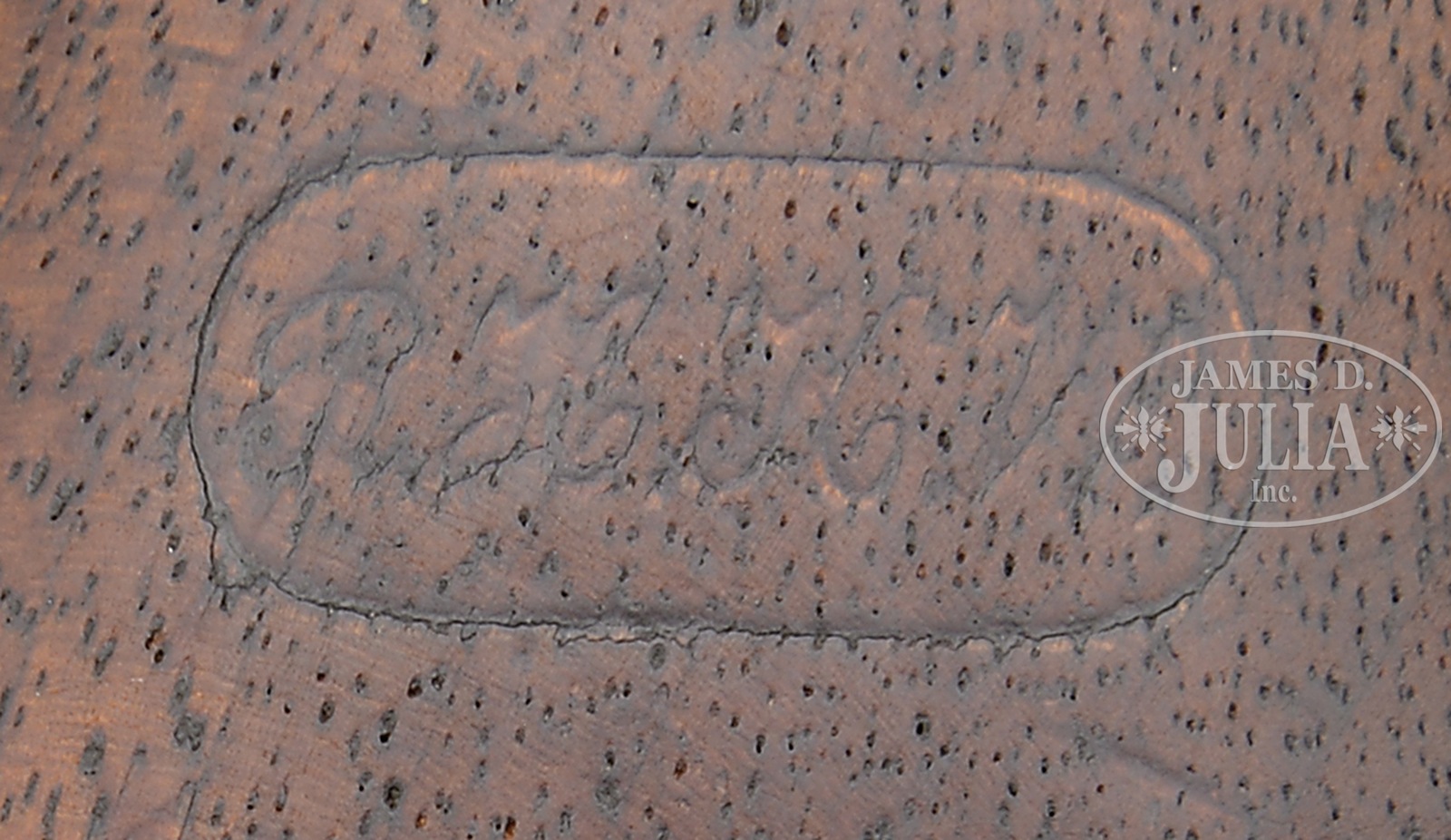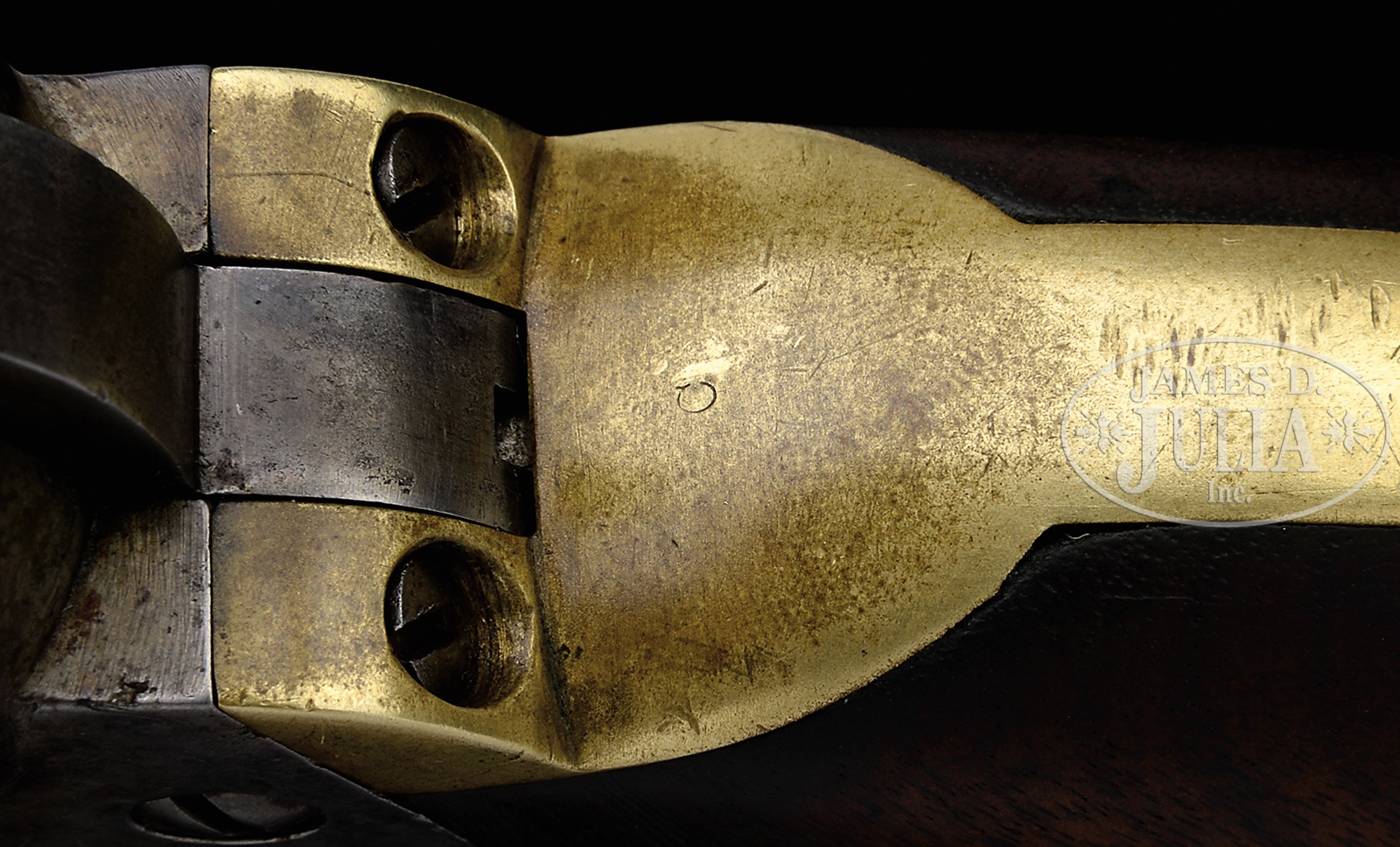 COLT THIRD MODEL 1851 NAVY-ARMY REVOLVER MARTIALLY MARKED.SN 60181. Cal. 36. 7-1/2″ bbl. Blue and case color finish with brass backstrap and trigger guard. 1-pc walnut grip. Bbl shows 1-line New York address with inspector initial “A” to rear. Forward left side of frame is marked “Colts Patent over U.S.”. Inspector initial “C” is stamped on apron of backstrap behind hammer. Cyl has “C” inspector initial stamped behind SN. Left side of grip show the initials “A.D.K.” in a cartouche. Right grip shows “RHKW” in a cartouche. There is no visible inspector mark on trigger guard. Cyl shows the standard Naval scene rolled. SNs match on frame, bbl, trigger guard, backstrap, wedge, rammer, and cyl. Grips have last 4-digits of SN written in ink in the backstrap channel. These Navy-Army revolvers were produced in the 42,000 to 80,000 range. CONDITION: Fine. Bbl shows 50% restored blue finish with high point wear and some muzzle wear. There are a few dents and scratches overall. Bbl address is sharp. Bore is dark with visible rifling. Front-sight is a replacement. Rammer is silver-gray patina with minute traces of case color. Frame is a silver-gray patina overall with some minute traces of case color in protected areas. Frame marking is sharp and clear. Trigger guard has a mustard-yellow patina and shows signs of light cleaning. Backstrap is also a mustard-yellow patina, turning darker behind hammer. Hammer shows generous traces of case color on either side. Trigger shows traces of blue finish. All screws are good. Grip strap screws are replacements. Cyl is a smooth gray-brown patina overall and retains 80% of cyl scene with some roughness. Colts Patent mark is somewhat washed out. Inspector mark and SN are sharp. 6 safety pins are intact, although somewhat battered. A hard to find Colt Navy-Army revolver made in 1856 for the U.S. Army in far above average condition. 51033-47 TEP (10,000-20,000) – Lot 4237 Click here to view provenance