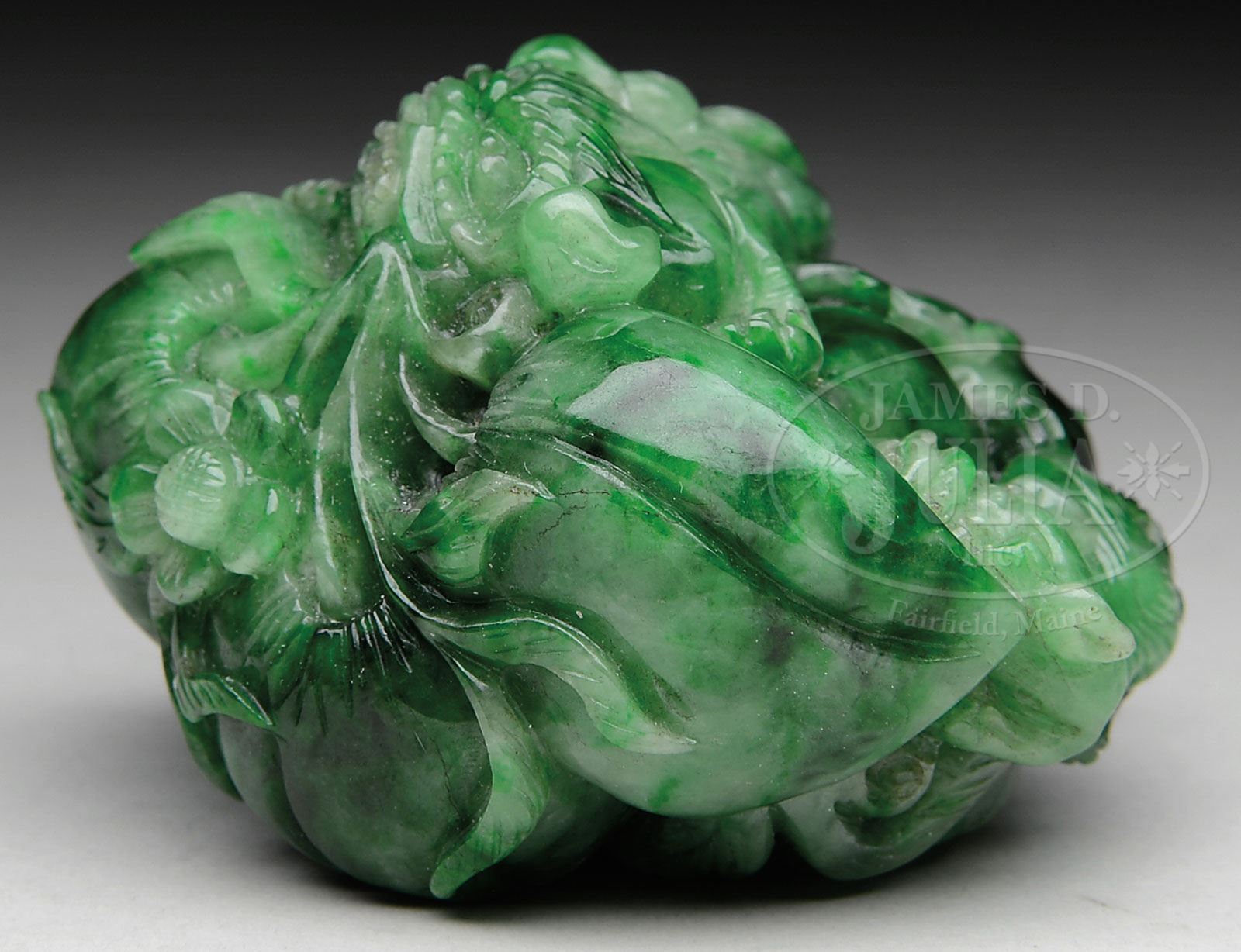 JADE CARVING OF PEACHES AND FOO DOGS. 20th century, China. No indication of dyes. Accompanied by a Stone Group Laboratories certificate. SIZE: 3″ l x 2-1/2″ d x 2″ h. CONDITION: Generally very good. 7-74578 (20,000-30,000)