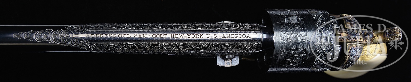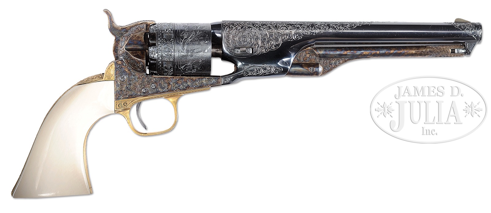*EXTRAORDINARY ACEVEDO ENGRAVED AND DECORATED MODEL 1861 COLT NAVY PERCUSSION REVOLVER.SN 24690. Cal. 36. Remarkable rendition by one of America’s most talented 20th century engravers. This particular gun is a copy of the famous General Robert Anderson presentation revolvers which were orig made in 1863. This gun is a faithful facsimile made on a Colt 2nd Gen black powder revolver made in 1978 and as can be seen in photographs it is quite elaborate. Gun is in truly amazing condition retaining virtually all of its orig finish. Horatio Q. Acevedo (1924-2010) and his work is prominently shown on pgs 706-719 of The Colt Engraving Book Volume Two by R.L. Wilson. Special Note: This item(s) contains plant or animal properties that may be covered by the Endangered Species Act (ESA). We have taken care to ensure that this item(s) meets the standard for sale under the ESA. However, certain states and other countries have laws that are more restrictive than the ESA. It is the bidder’s responsibility to ensure that it is lawful to purchase or transport this item(s) into their state, and to obtain the necessary import and export approvals. Delay or failure to obtain any such permit or approval does not relieve the buyer of paying for the item(s) and consummating the purchase. CONDITION: Extremely fine, retaining virtually all orig blue in case colors. Backstrap and trigger guard retain about 50% thin, orig gold wash with wear and cosmetic bruising on grips straps. Screws retain most of their orig fire blue. Smooth elephant ivory grips are excellent, well fit. Mechanically fine with crisp, bright new bore. 50324-2 JS (8,000-12,000) IVORY – Lot 4239