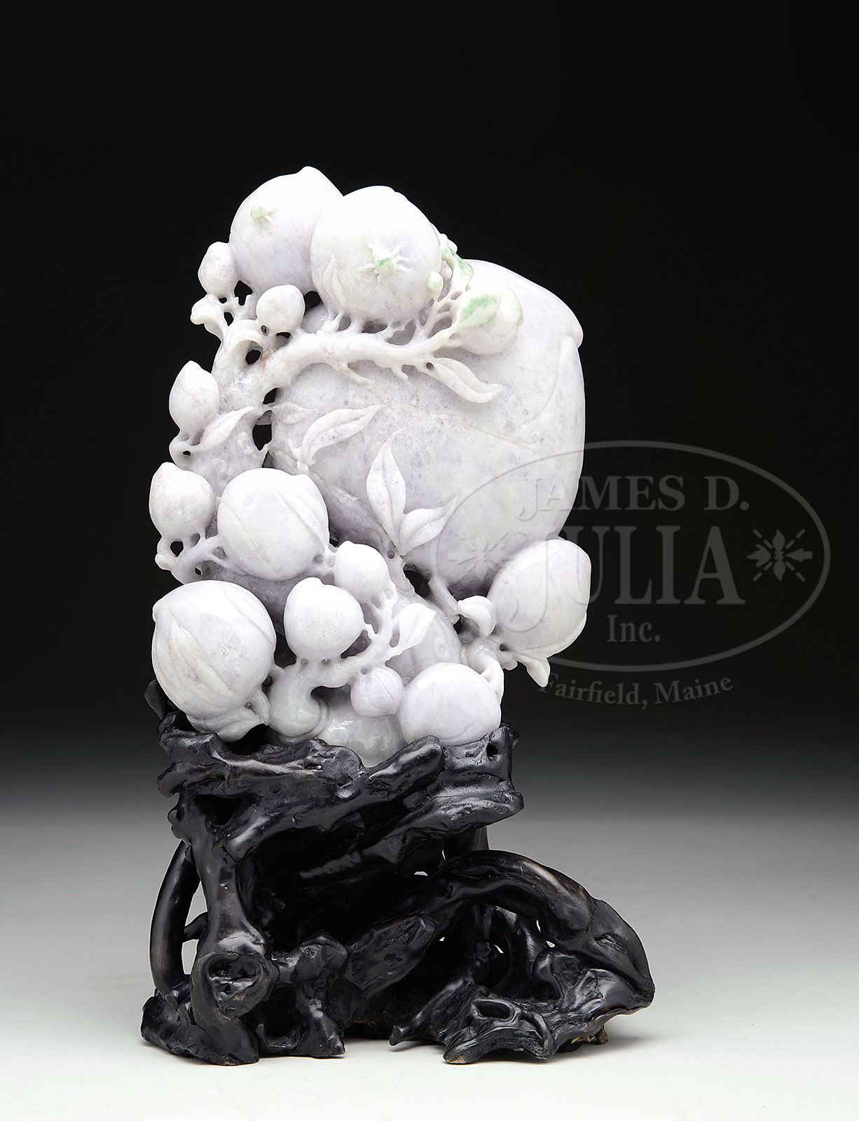 LARGE JADE CARVING. 20th century, China. In the form of peaches. Even lavender color with bright apple green spots. Fitted root wood stand. SIZE: 10″ t x 8″ w. CONDITION: Very good. 7-74590 (8,000-10,000)