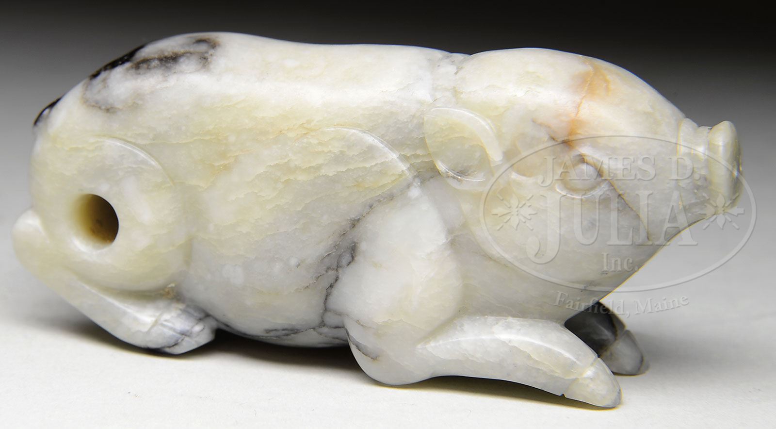 JADE CARVING OF A PIG. China. The study of a pig carved from a gray stone with black streaks. SIZE: 1-1/4″ h x 3″ l. CONDITION: Very good. 9-91996 (7,000-9,000)