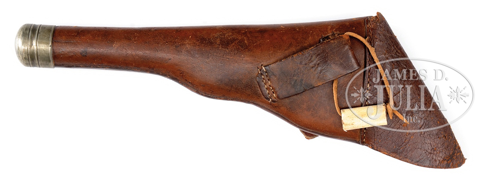 RARE CIRCA 1855 CALIFORNIA “SLIM JIM” FLAP HOLSTER FOR COLT MODEL 1851 NAVY REVOLVER WITH EMBOSSED CALIFORNIA STATE SEAL.These rare holsters were made during the California Gold Rush, with California State seal embossed in flap and Indian shooting a bow and arrow embossed in body. This holster fits a small guard Model 1851 Colt Navy 4th Models with large trigger guards are too wide. This example is in beautiful condition with well defined decoration and original German silver muzzle cap. PROVENANCE: Dow H. Heard, Houston, Texas. CONDITION: Very good overall. Body retains excellent patina, well defined figure of Indian shooting bow and arrow, though worn at high areas, light scuffing. Flap shows California State seal of seated Eureka with bear standing by her feet. Flap, is heavily crazed and folded but embossed design is discernible and “EUREKA” is discernible beneath the seal. Closure tab is torn and reinforced with old leather and cloth, restoration to back of tab. 50412-91 JS (3,000-5,000) – Lot 4245