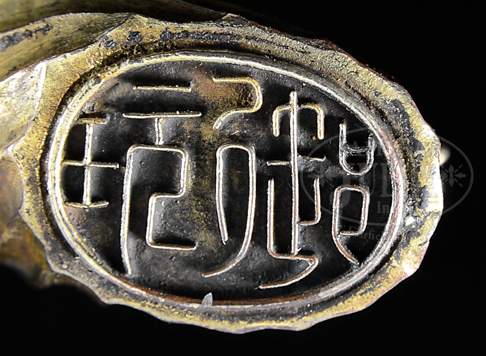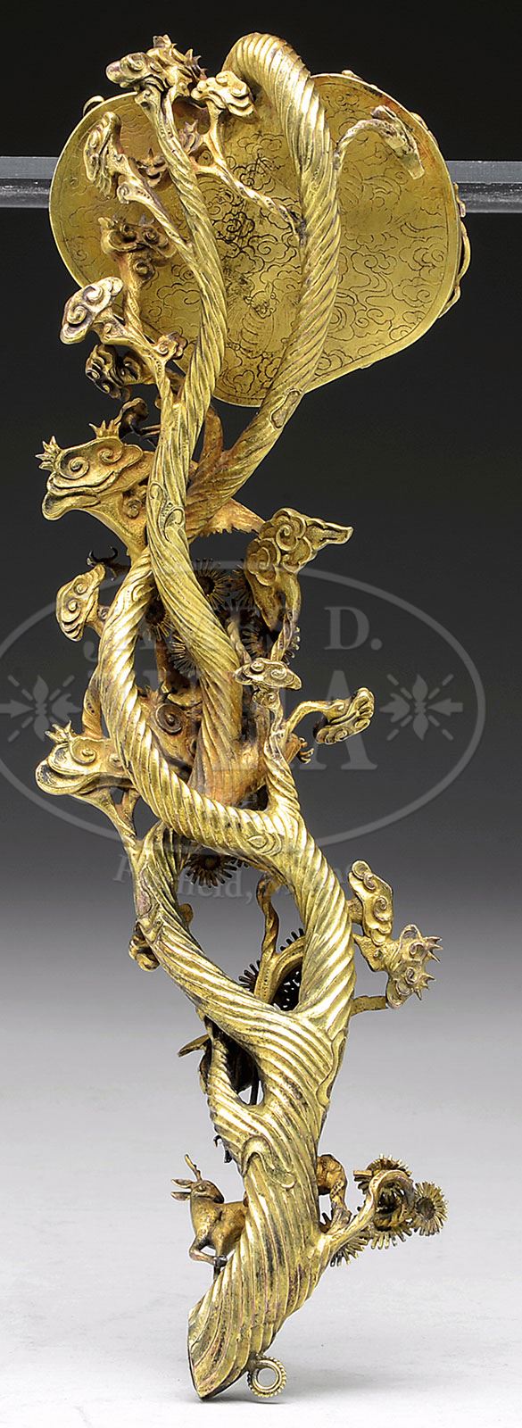 GILT COPPER JU-I SCEPTER. 20th century, China. Gilt copper repousse with decoration of bats, cranes, deer, and lingzhi set with turquoise cabochons. Surface further engraved with clouds and bats. Accompanied by box. SIZE: 11-1/2″ l. PROVENANCE: The estate of John Gerhardt Family Trust, acquired in San Francisco in the 1960s. CONDITION: Minor rubbing to the gilt, otherwise very good. 9-25027 (5,000-6,000)