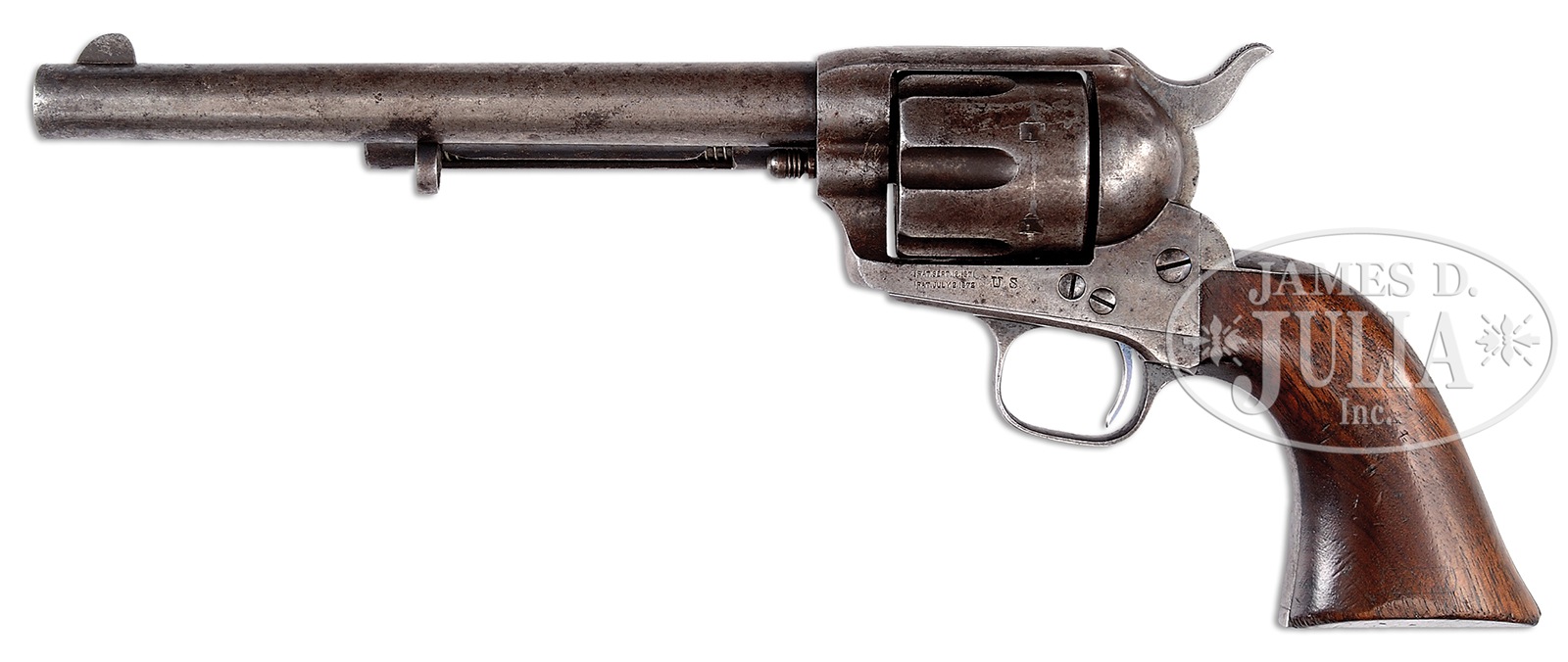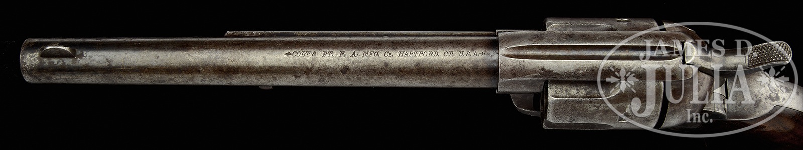 FINE PRIME ‘LOT 5’ CUSTER RANGE AINSWORTH INSPECTED COLT SINGLE ACTION ARMY REVOLVER WITH HOLSTER, BELT AND CAP BOX.SN 4884. Cal. 45 Colt. Usual configuration with 7-1/2″ bbl, full height front sight, 1-line script letter address and matching SN on the bottom under the ejector housing. Ejector housing is correct1st type with orig donut-shaped ejector rod head. Left side of frame has 2-line patent dates and “U.S.”. Mounted with 1-pc walnut grip that shows matching SN in backstrap channel. Left side of grip has cartouche “OWA” (Orvil W. Ainsworth). Tiny “A” inspector initials are found on bottom of bbl, trigger guard, backstrap, cyl and bottom left edge of grip. This revolver falls directly in the center of the serial range issued to the 7th Cavalry Regiment under Custer January 28, 1874. On June 25, 1876, Custer and five companies of the 7th Cavalry and three white scouts were annihilated at The Battle of the Little Big Horn by the combined forces of several tribes of Indians. There were at least 632 Single Action Revolvers carried into that battle, of which about 252 to 280 were lost on the battlefield that day. There were 212 Cavalrymen and three civilians killed with Custer, all of whom were carrying Colt revolvers. Of the 632 Colt revolvers carried into the battle that day, a total of 302 were reported lost during the battle. Kopec and Fenn, pg 259,Colt & Artillery Revolvers…A Continuing Study, 1994, states that about 600 of the 755 orig 7th cavalry issues came from “lot 5”. SNs known with Little Bighorn or 7th cavalry issues are 4507, 4553, 4597, 4729, 4949, 4955, 5100, 5128, 5133, 5147, 5153, 5180 and 5416. In a letter from John Kopec accompanying this pistol, “Another significant reference example #4878 (just 6 numbers away) is listed in the archives records as being “turned-in” by the Indian “Fools-Bean” on September 5, 1876. There is no question that the subject revolver #4884 is well within the group of revolvers which could have been associated with the famous Custer battle.” The fact that this revolver has remained in near orig configuration attests to the almost certainty that it was captured by the Indians at the Custer fight. Had it remained with the 7th cavalry, or any active cavalry unit it would have been recalled in 1895 or the early 20th century and would have been converted too artillery configuration with its bbl cut to 5-1/2″. Since that did not happen there are really only two possible explanations: 1). It was captured at the Little Big Horn by the victorious Indians or , 2). It was stolen by an active duty trooper. The vast majority, about 600, of 7th Cavalry Colts were issued from lot 5 which includes this revolver. This is a fine “as found” example exhibiting perfect mechanics, crisp bore and fine belt, holster and Civil War cap box converted to Indian War’s cartridge pouch. CONDITION: Very good to fine, all matching including bbl, cyl & grip. Bbl and ejector housing retain strong traces of bright blue finish in sheltered areas with light pitting in crescent on bbl around end of ejector housing. Frame retains small areas of dark case colors in sheltered areas with the balance a dark silver grey patina with staining and fine pitting on left recoil shield. Hammer retains 60-70% faded case colors. Trigger guard and backstrap are a mottled silver brown patina with traces of bright blue in protected areas. Cylinder is matching patina with tiny traces of blue. Grip is sound and solid with tiny chips to inside toes, hand worn patina with moderate edge wear. Hammer is not solid in safety notch otherwise mechanics are fine. Strong bright bore with scattered fine pitting. 51016-1 JS (40,000-60,000) – Lot 4252 Click here to view provenance