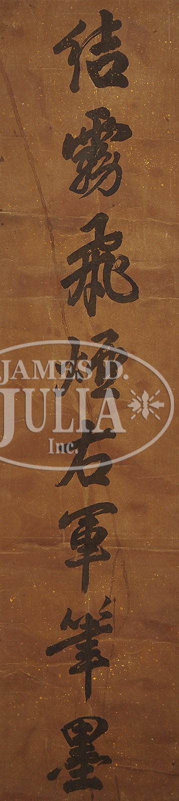 CALLIGRAPHY COUPLET.China, Early 20th century, running script on paper, signed “Zhang Zhidong,” with two seals. SIZE: 52-1/4″ x 11-3/4″. PROVENANCE: Estate Collection from a renowned Taiwanese Diplomatic Family – Cai Wanjun (? – 2011), Xu Shaochang (1913–1999), and Ye Gongchao (1904 – 1981). CONDITION: Surface grime. 46099-10 (400-600) – Lot 4253