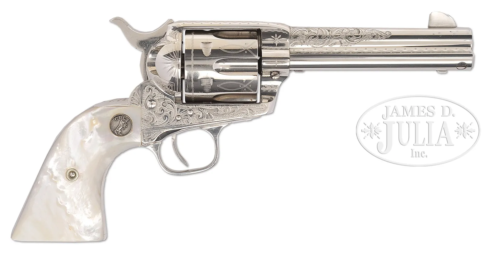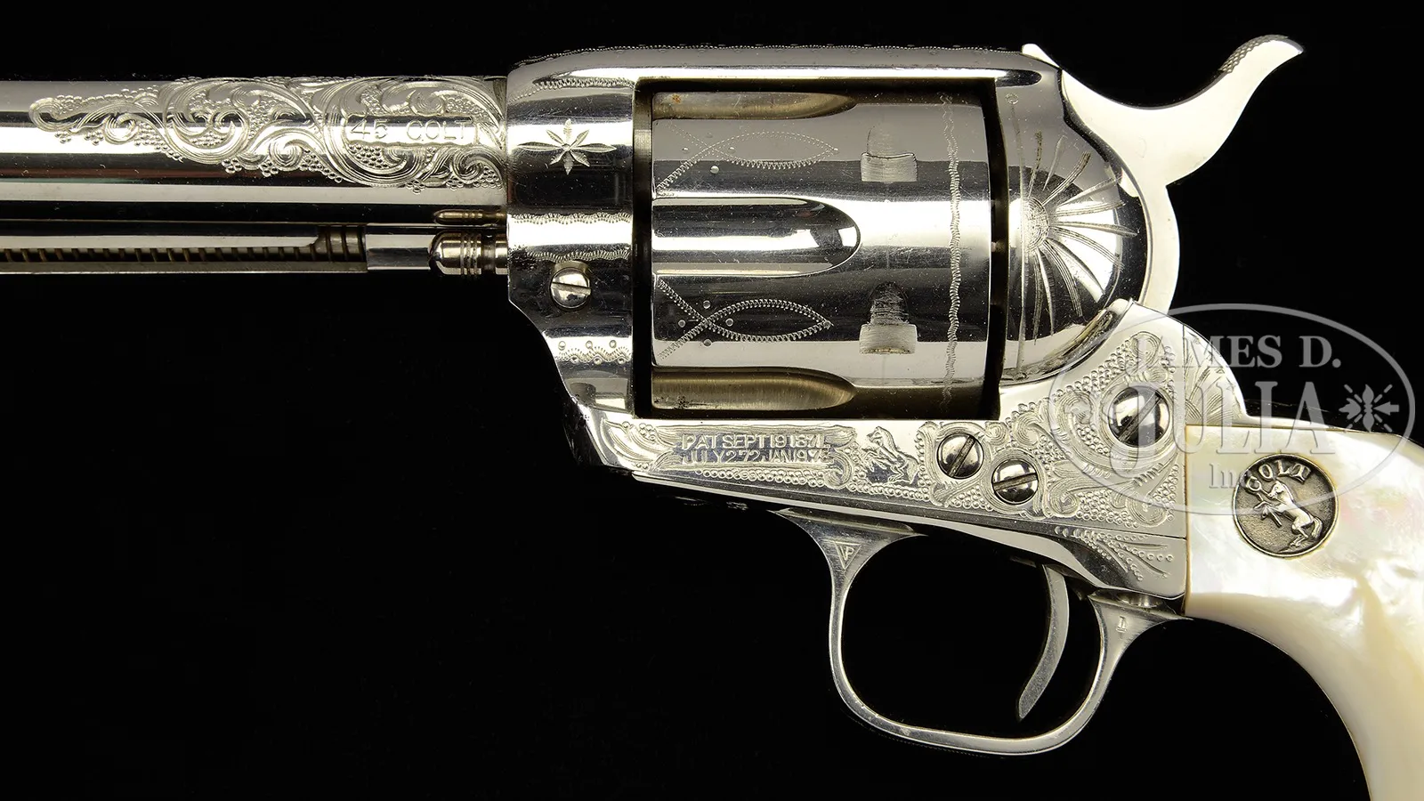 *MINTY FACTORY ENGRAVED COLT SINGLE ACTION ARMY REVOLVER BY CUNO HELFRICHT.SN 335562. Cal 45. Nickle with 4-3/4″ bbl, full thick front sight and 2-line block letter address. Left side of frame is marked with 2-line, 3-patent dates and rampant Colt. Mounted with factory 2-pc smooth mother-of-pearl grips that have silver Colt medallions. Revolver is among the last of Colt master engraver Cuno A. Helfricht’s personal work, note the refinement of the scroll toward the end of his career. There are numerous examples of virtually identical Helfricht engraving pictured in many texts. Two noted examples are found on pgs 443 & 448 (SNs 3331877 & 333764) in The Colt Engraving Book Volume One, R. L. Wilson. Accompanied by Colt factory letter, showing shipped in 45 Cal with 4-3/4″ bbl, nickle finish with pearl stocks, factory engraved and that it was shipped to Stauffer, Eshleman & Co. of New Orleans, LA on, April 11, 1917 in a 4-gun shipment. The two guns pictured in Wilson cited above with virtually identical “Grade B engraving” were also shipped to same company in New Orleans. SN was observed on frame, trigger guard, backstrap and internally on pearl stocks. Rear face of cyl has last 4-digits of SN. This gun no doubt is among the last guns personally engraved by Cuno Helfricht in his shop. CONDITION: Extremely fine, all matching. Overall retains virtually all of its crisp orig factory finish with only a few small, thin areas of dark, pinprick pitting and staining on cyl and right face of frame unaffecting the overall aesthetics of an otherwise almost new gun. Gun shows no evidence of ever having been fired. Grips are crisp with fine translucence and “fiery” color. Mechanically, gun is perfect with crisp shiny bore. 50412-38 JS (30,000-50,000) – Lot 4258 Click here to view provenance