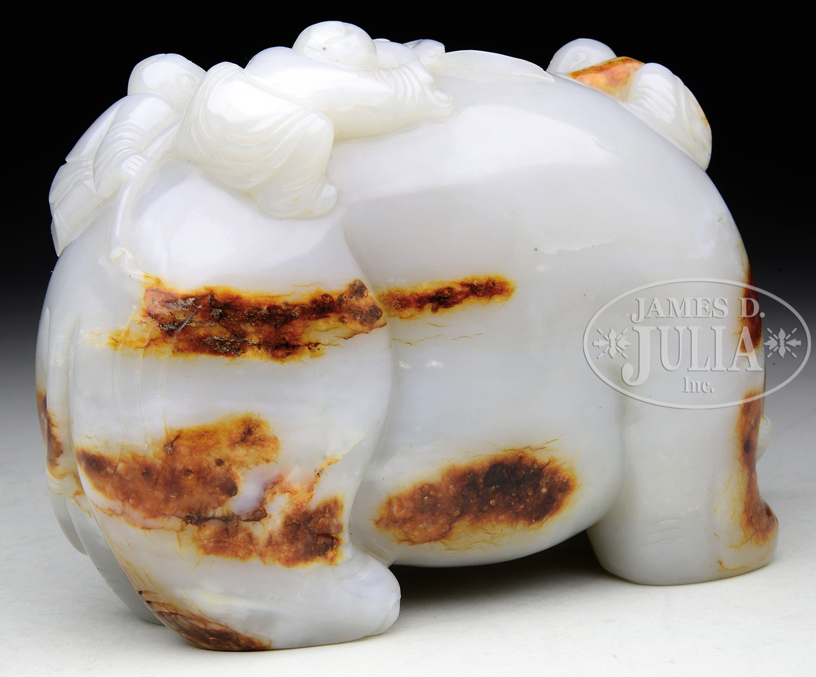 GREYISH WHITE JADE ELEPHANT GROUP.China. Large elephant with russet inclusions and five young boys playing with it. SIZE: 7-3/4″ l. CONDITION: Good. 49073-6 (5,000-7,000) – Lot 4269
